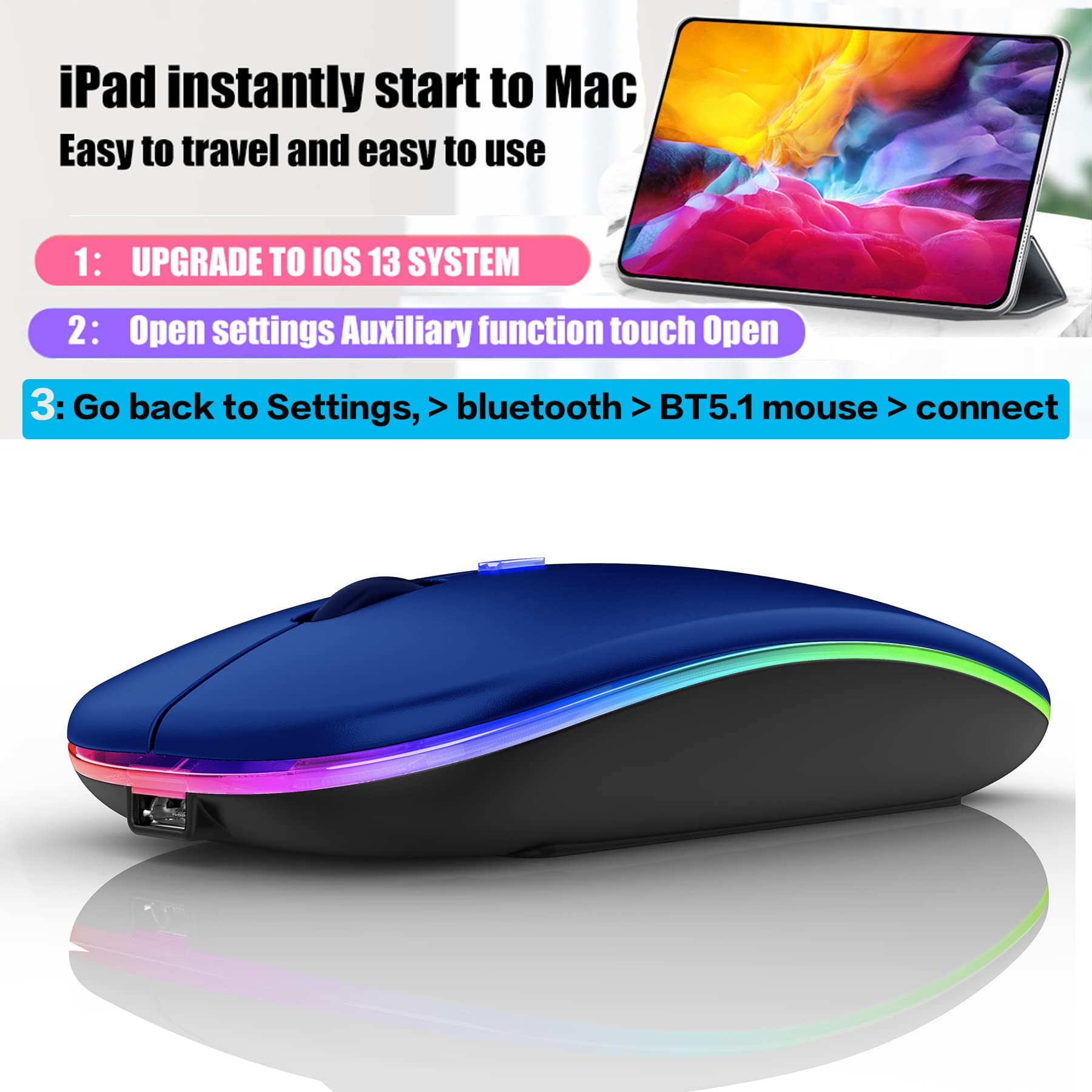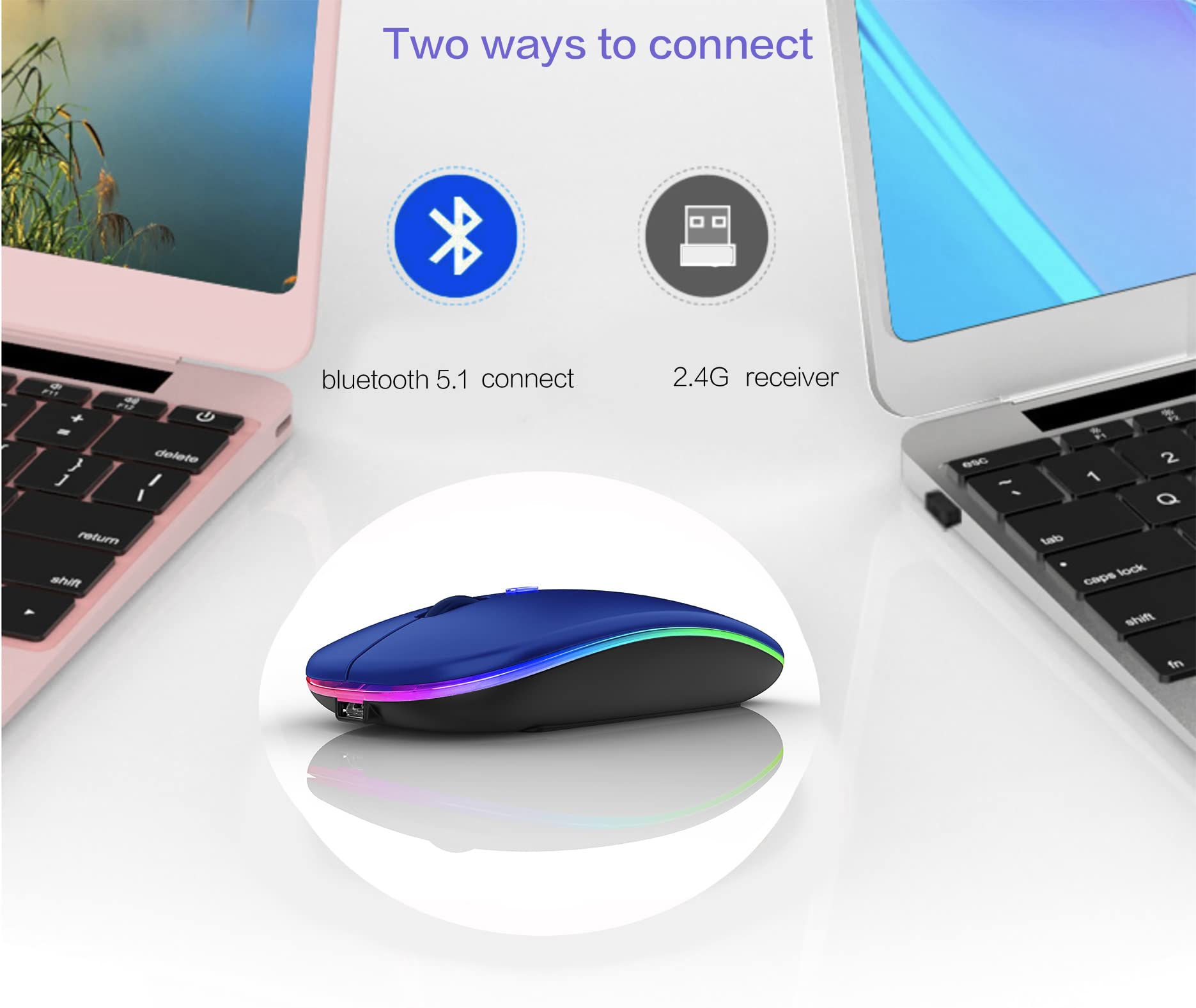 Choose PEIBO dual-mode Bluetooth wireless mouse (BT5.2+BT3.0+2.4Greceiver+USB C adapter), which is more conducive to our connection and use on any computer device, HOW to use Bluetooth mouse mode: First, slide the mouse switch to Bluetooth mode (blue light) > open laptop system preferences settings> turn on Bluetooth function >, when laptop Bluetooth is searching for nearby Bluetooth devices> you need to press and hold the blue button at the bottom of the mouse '' for 3 -4 seconds, The blue light flashes . (If there is no Bluetooth button, you can skip this step and click the connection directly).> Bluetooth search there appears Bluetooth 5.2 mouse>click to connect "BT5.2 mouse or BT3.0 mouse (BT3.0 for old laptop)" > connection is successful How to use mouse 2.4G USB receiver mode: First, switch the mouse switch to 2.4G mode (green light)> Then remove the USB receiver from the slot on the bottom of the mouse > Plug the USB receiver into the USB port of your laptop,plug and play.(Works with all USB ports and USB c Laptop and desktop ports, (Note: Computers with usb c ports please use with usb c adapter)) How to use the bluetooth mouse on the ipadOS13 and above iPad pro 11/12.9inch ipad air 10.9inch ipad mini 8.3inch iPad 10th gen 9th gen 10.9inch : First, open iPad settings, find accessibility, turn on touch controls, find assistive touch controls, turn on assistive touch controls, then pull down to find the device, turn on the Bluetooth device, then turn on the mouse switch, press and hold the black button on the bottom of the mouse for 3-4 seconds, (If there is no Bluetooth button, you can skip this step and click the connection directly).your iPad will search for a Bluetooth 5.2 mouse and click "Connect". Pairing password: 0000, (if you can't find the Bluetooth mouse device, please restart the mouse or iPad Bluetooth function, or restart the iPad) How do I charge a wireless mouse? When your mouse pointer does not move or cannot be used, or suddenly disconnects continuously during use, this is the reminder that you need to charge the Bluetooth mouse for about 3 hours. Please use an adapter with an output of no more than 5v for charging, or a power bank, or a USB port on your laptop. (Charging is prohibited on chargers with output 10V or more) Packing list: instruction manual *1, rechargeable Bluetooth 5.2 + BT3.0 + 2.4G USB receiver dual-mode wireless mouse *1, (2.4G USB receiver hidden in the bottom slot of the mouse), USB charging cable *1, USB C adapter*1, packaging box *1.
