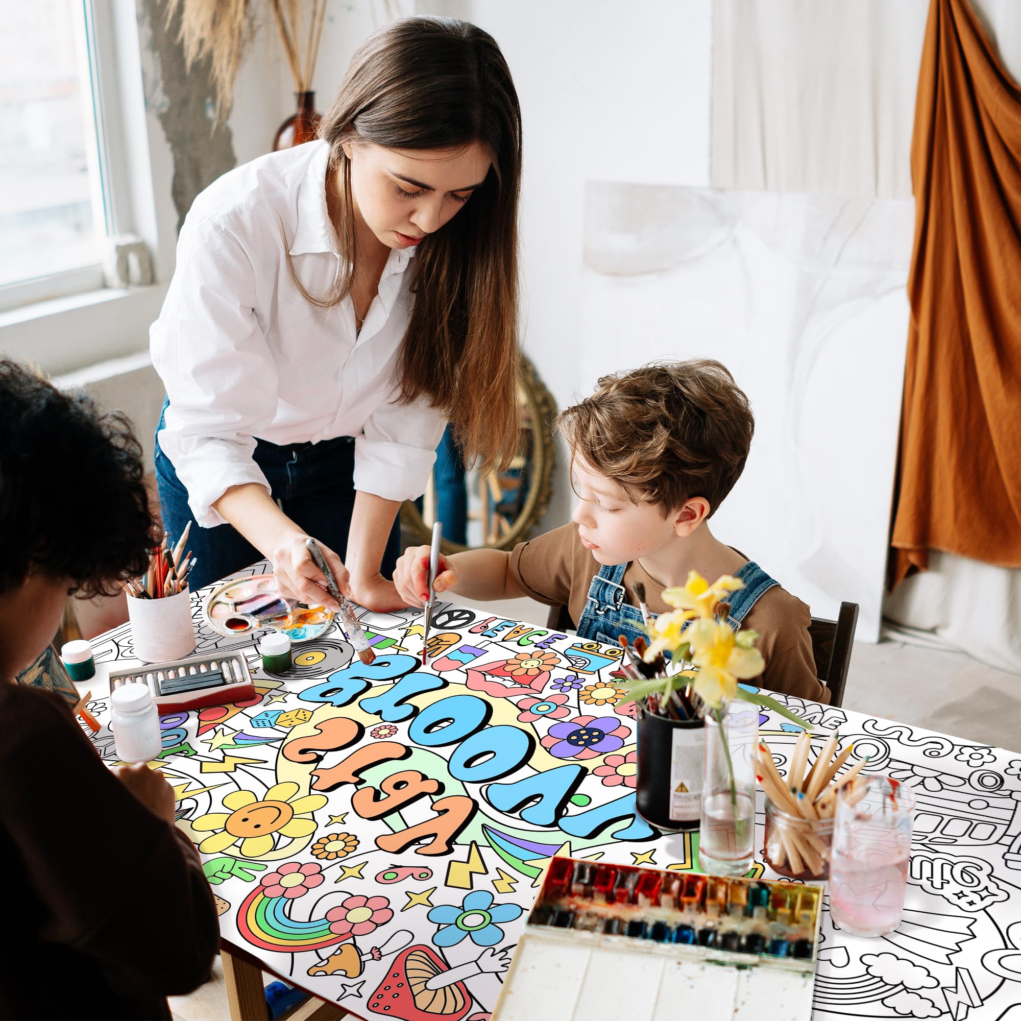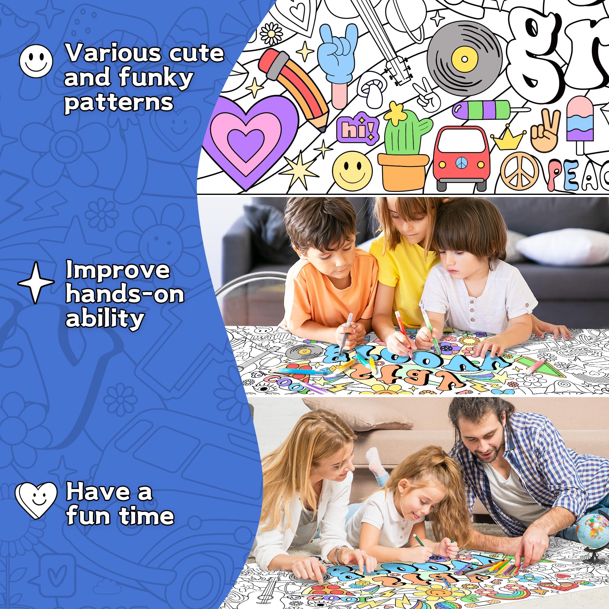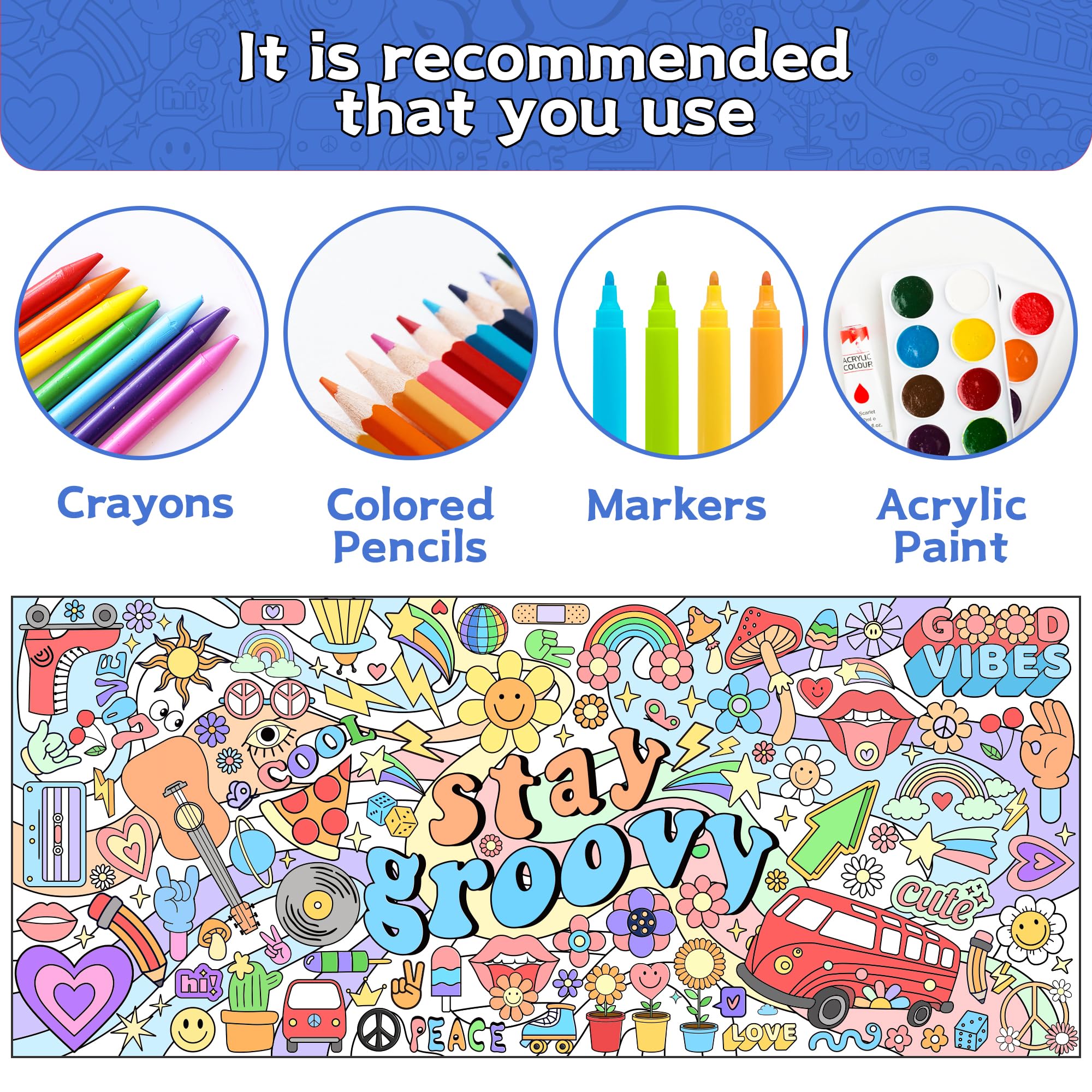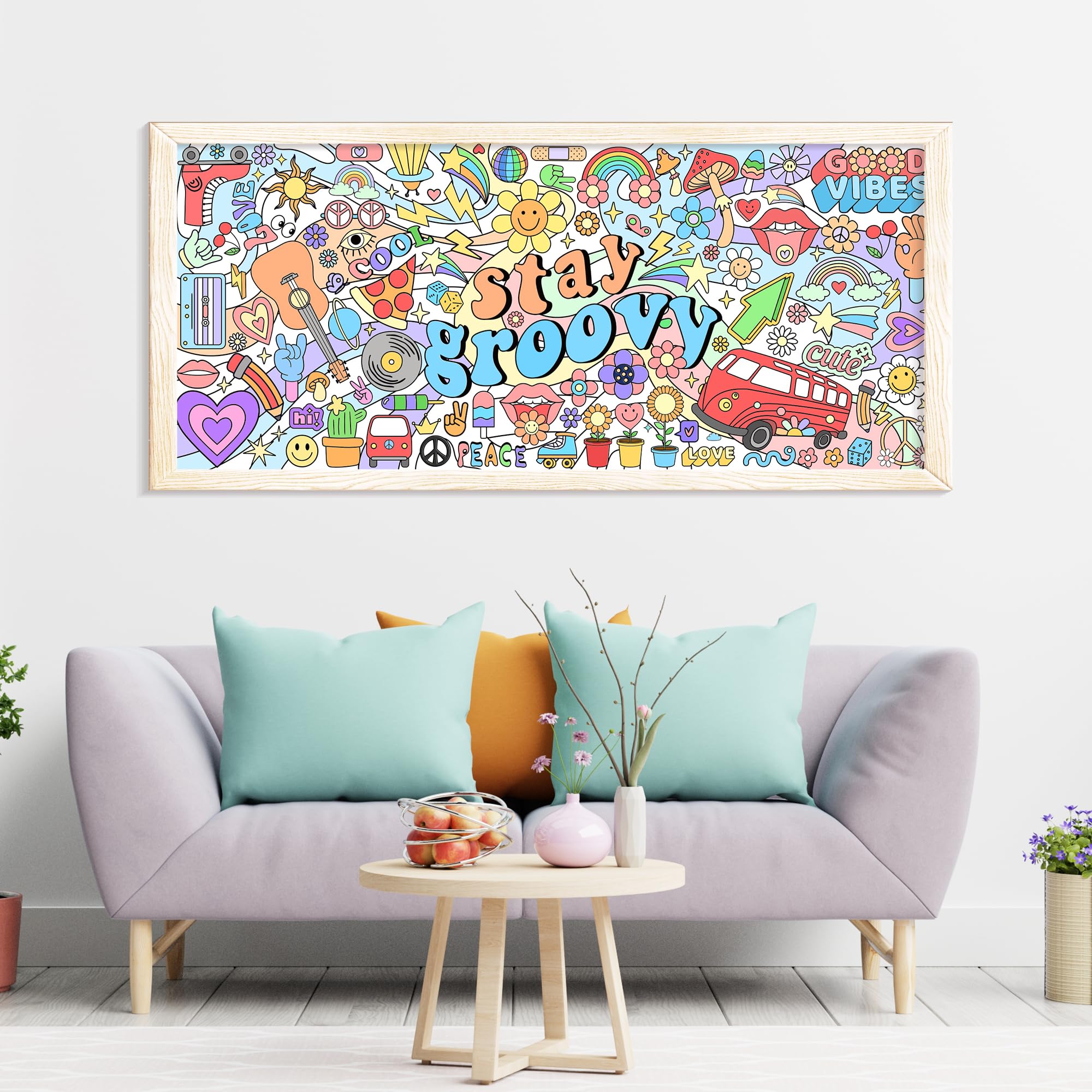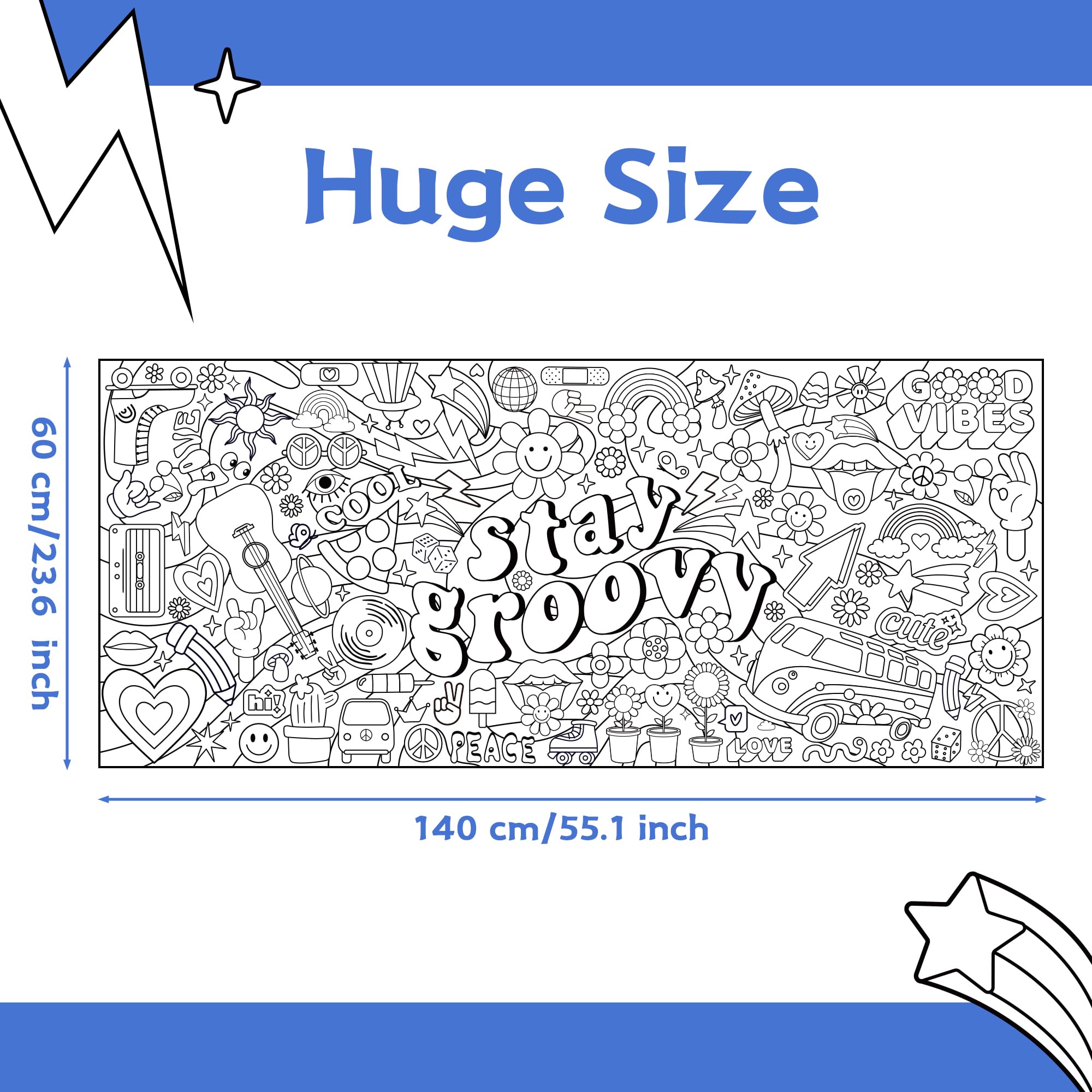 Vibrant Design: Our giant 55.1 x 23.6 inch coloring poster features a captivating central theme with the words "stay groovy" surrounded by a lively array of adorable and stylish motifs such as hearts, rainbows, flowers, stars, and lips. The design is sure to capture the attention of children.