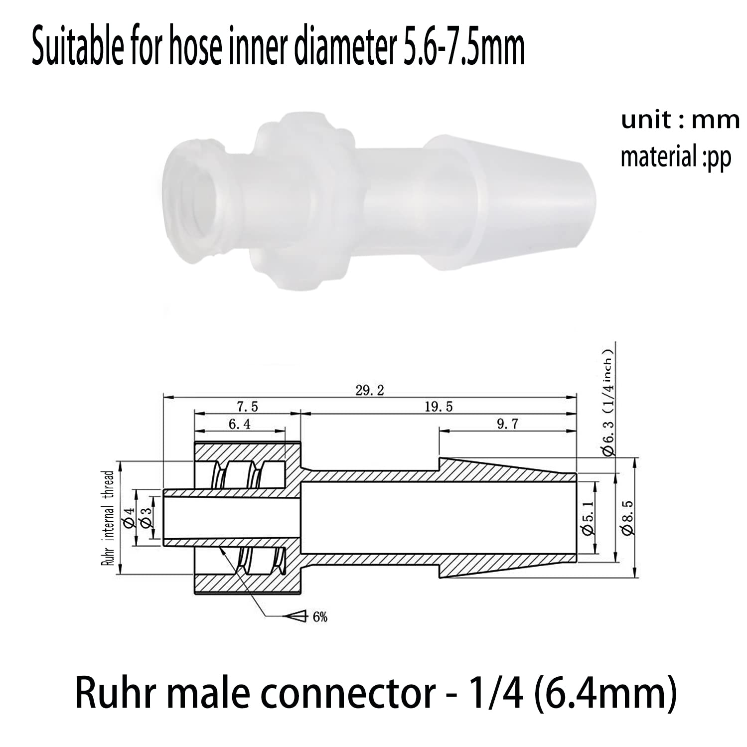Specification: Product: Male Luer Lock Adapter Size: 3/32" Applicable hose inner diameter: 1.8 - 2.8mm Opening pressure: not more than 0.5kPa Maximum back pressure: not less than 300kPa Material: PC Package includes: 10 x Male Luer Adapter Made of polycarbonate (PC), wear-resistant and durable to ensure long-term use. It is widely used in laboratory biochemical/analytical instruments, food machinery, aquarium equipment, massage equipment, inkjet printing, and other industries.
