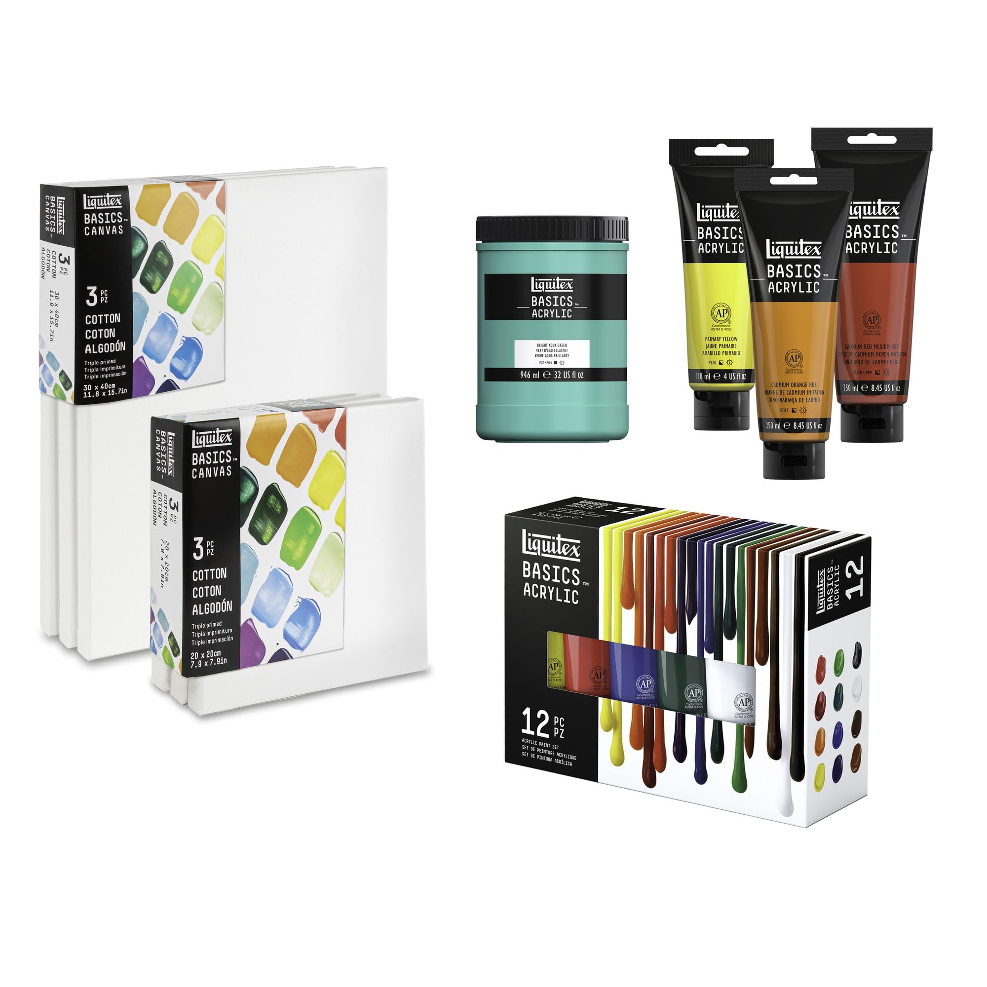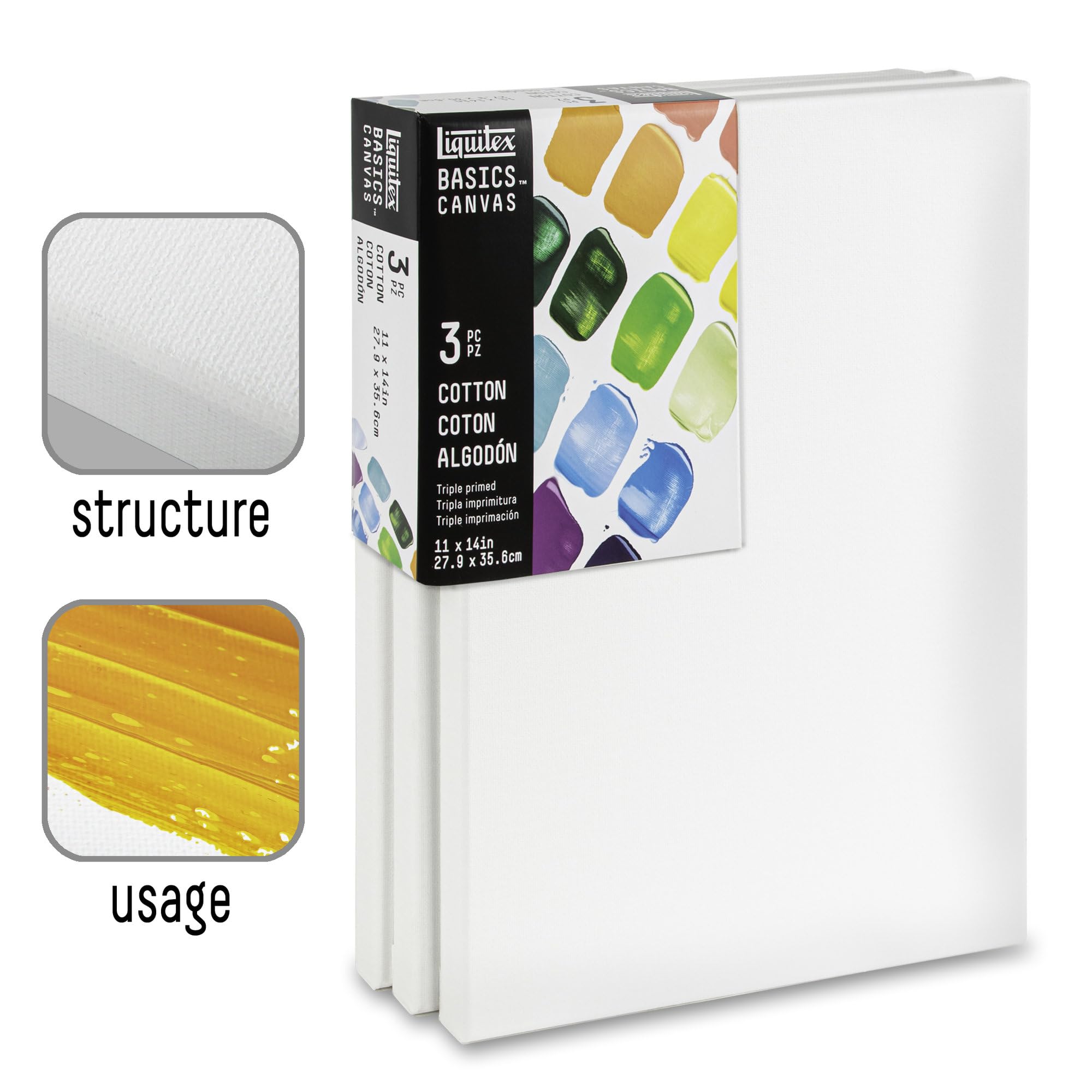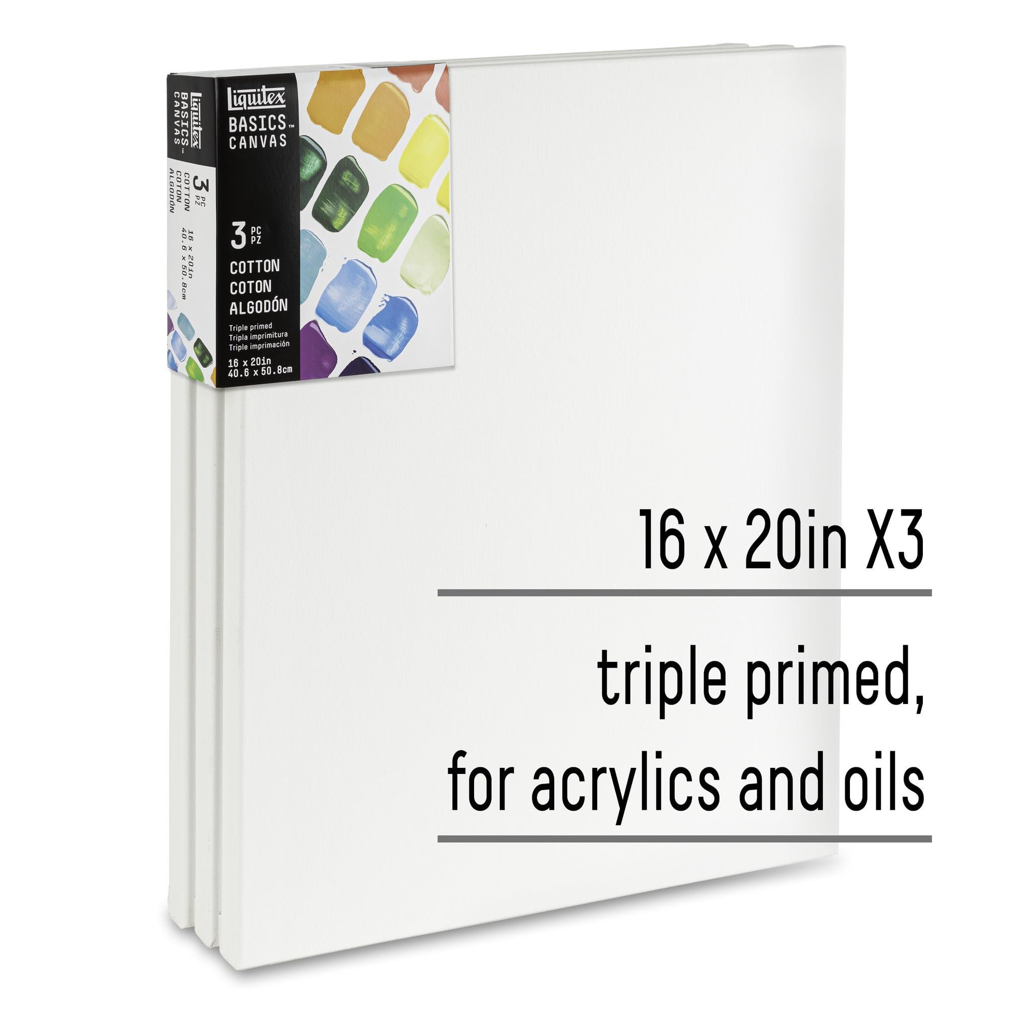 The trio pack. Put color to surface with three ready-to-go painting canvases. Archival. Acid-free. Non-toxic. No need to wait. The medium texture cotton canvas is pre-primed with a triple layer of acrylic gesso all set to receive acrylic color. Stapled at the rear, stretched on a FSC certified softwood frame.