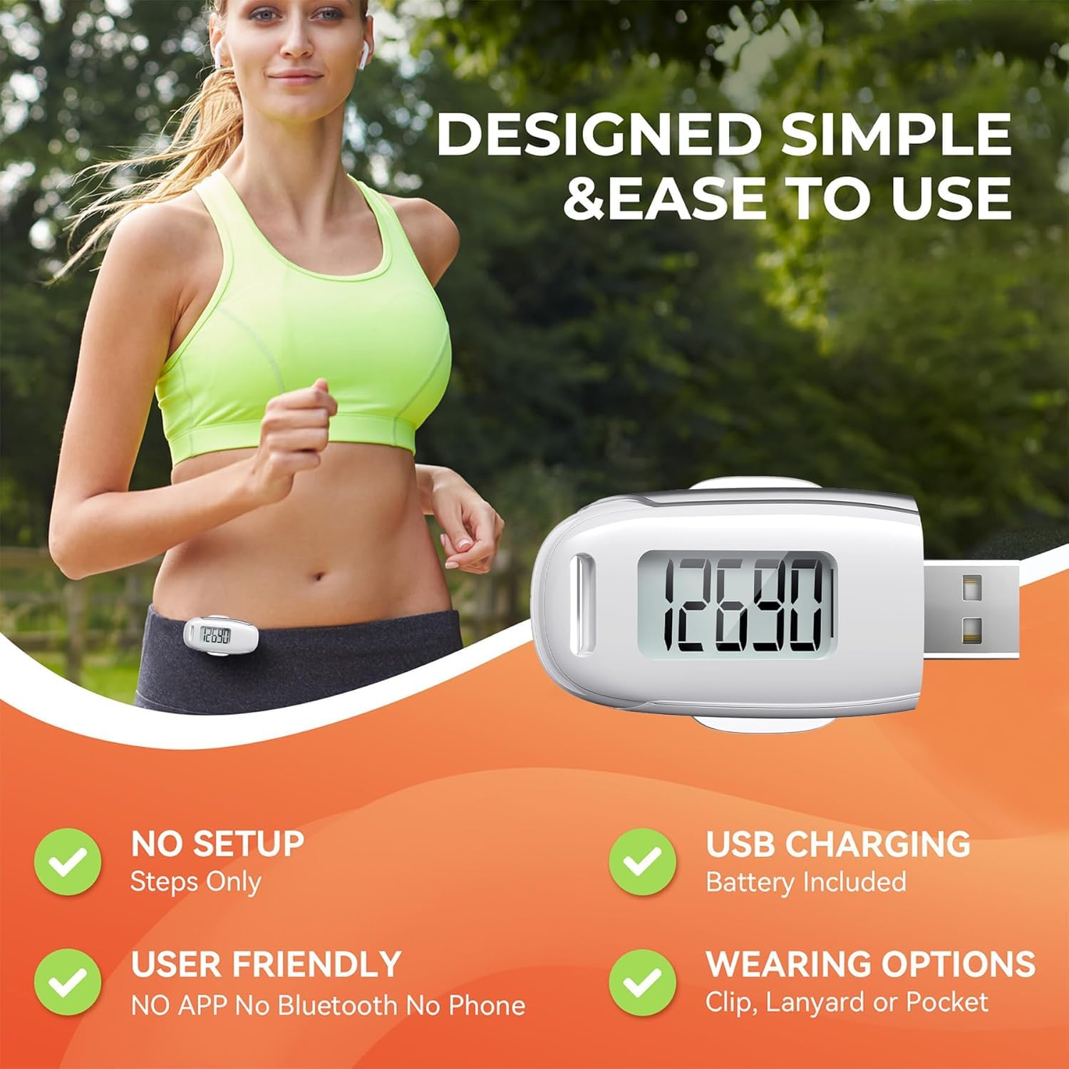 USB Charging: Our white pedometer comes with a USB plug, No need to change batteries frequently, Simply plug it into any USB adapter or even your computer for hassle-free charging. With one full charge, it can last up to 3 months