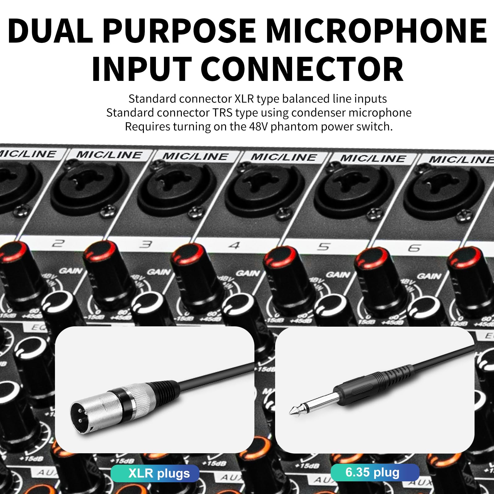 16-Channel DJ Mixer: The mixer is ideal for multi-device connections as it has 16 channels, each with an mix XLR mic and 6.35mm inputs. Plus XLR outputs, 1/4'' (L/R) outputs, each pair of RCA (L/R) inputs and outputs.