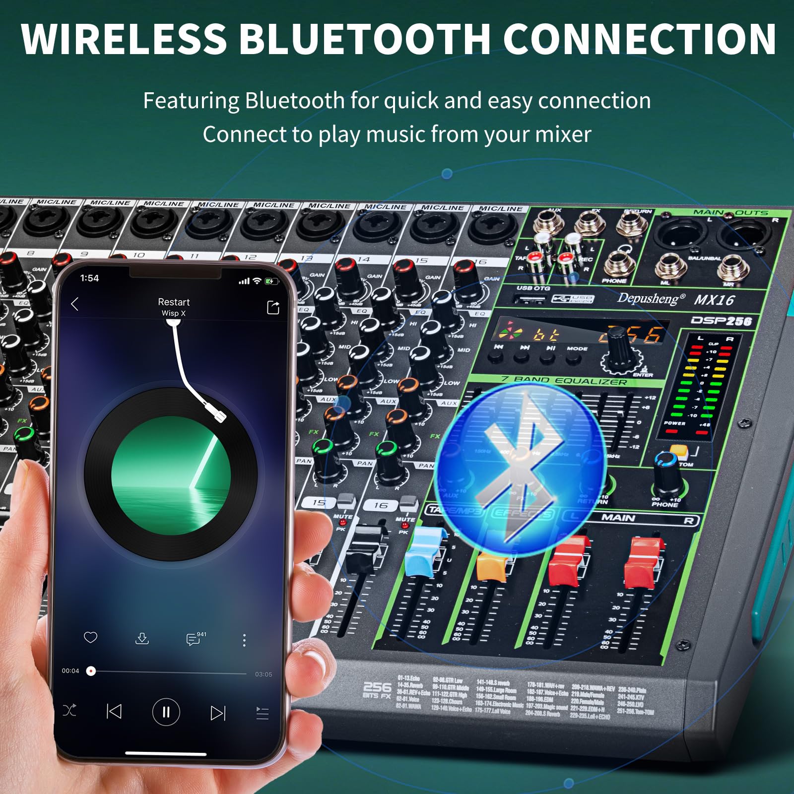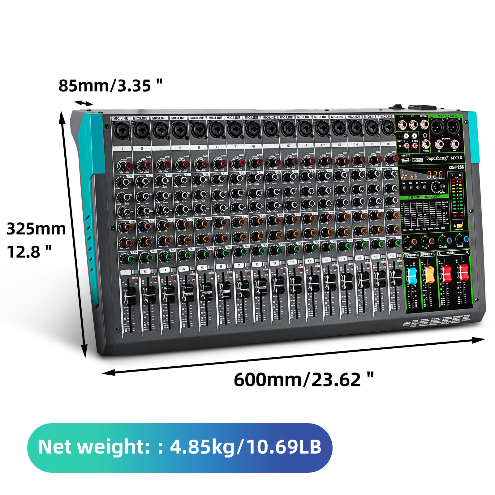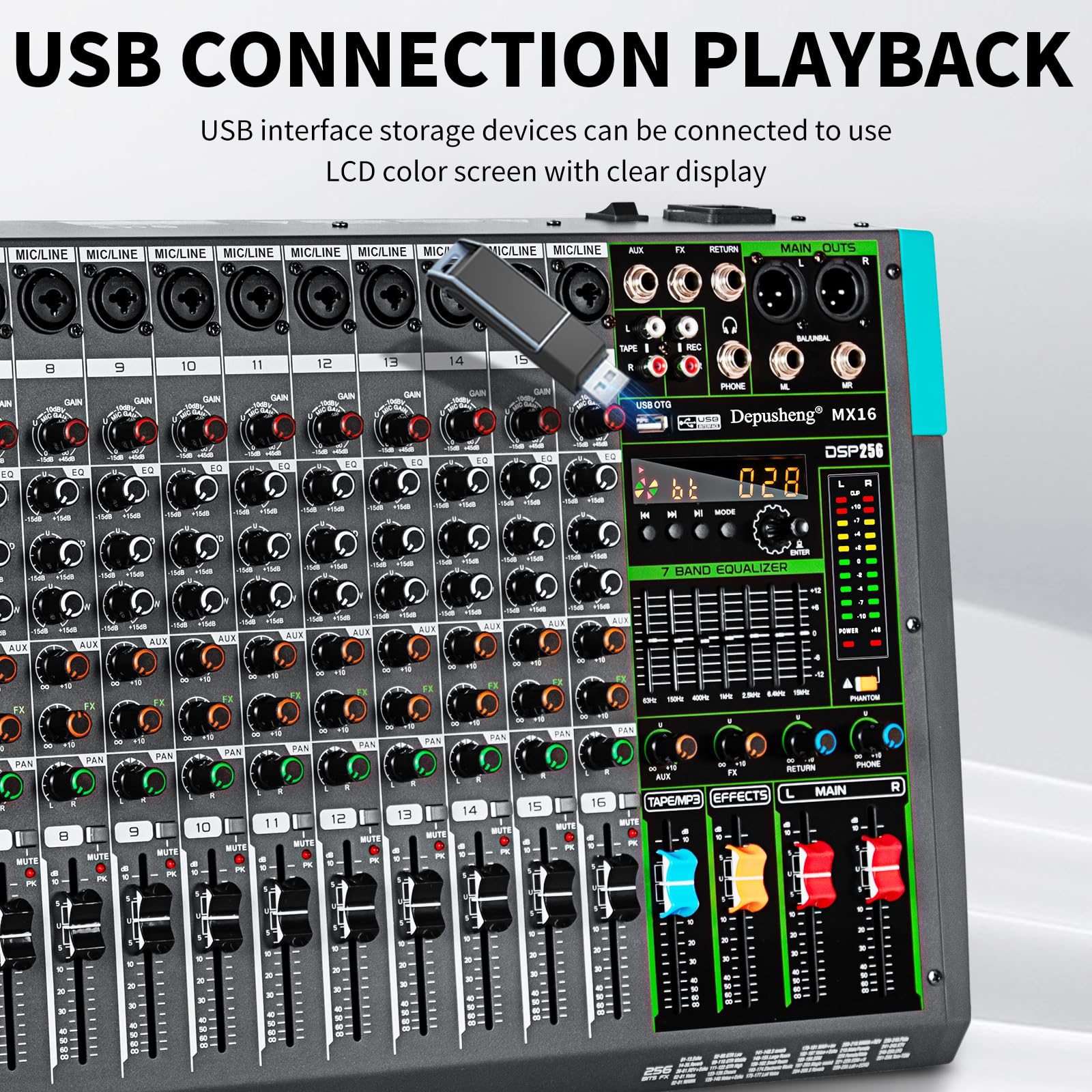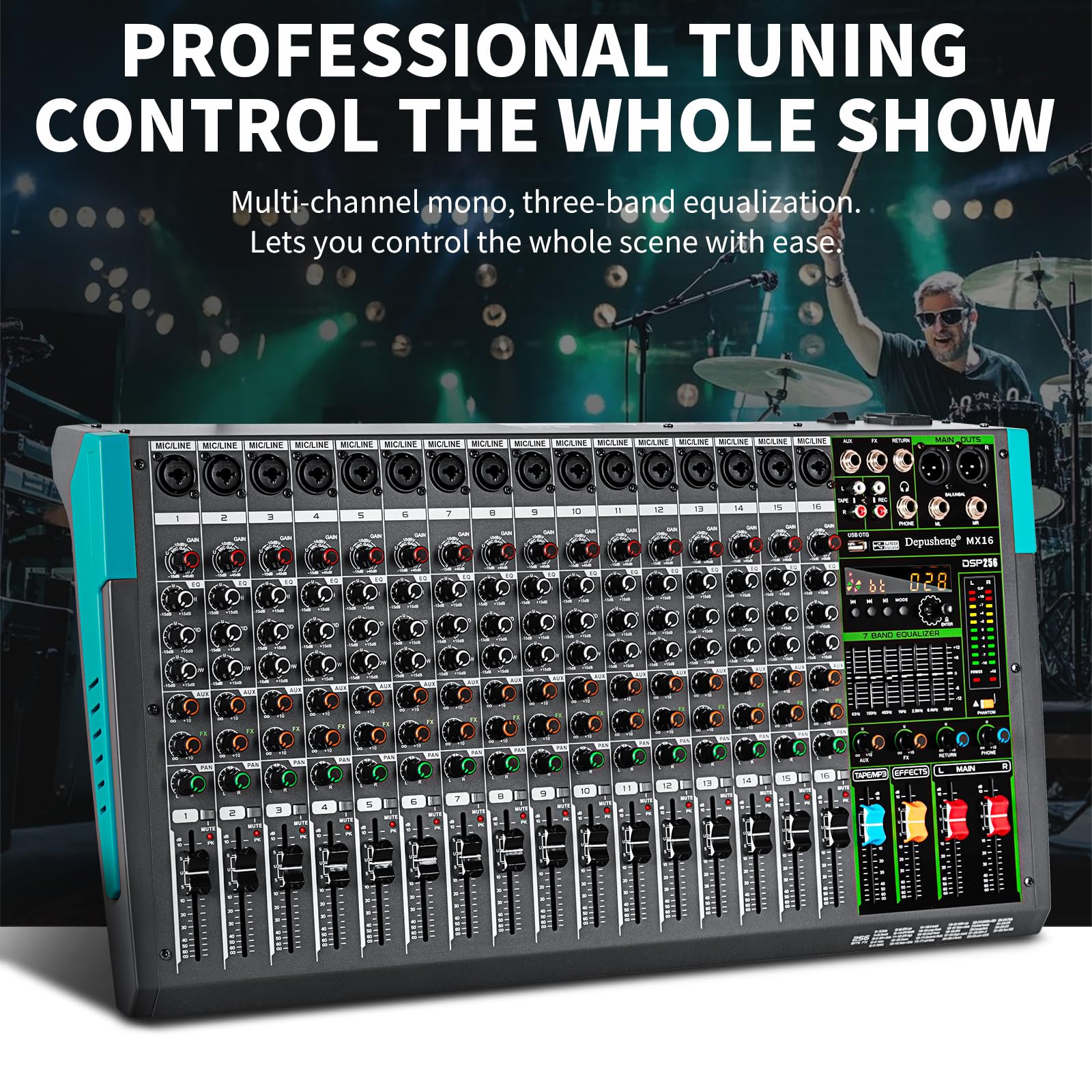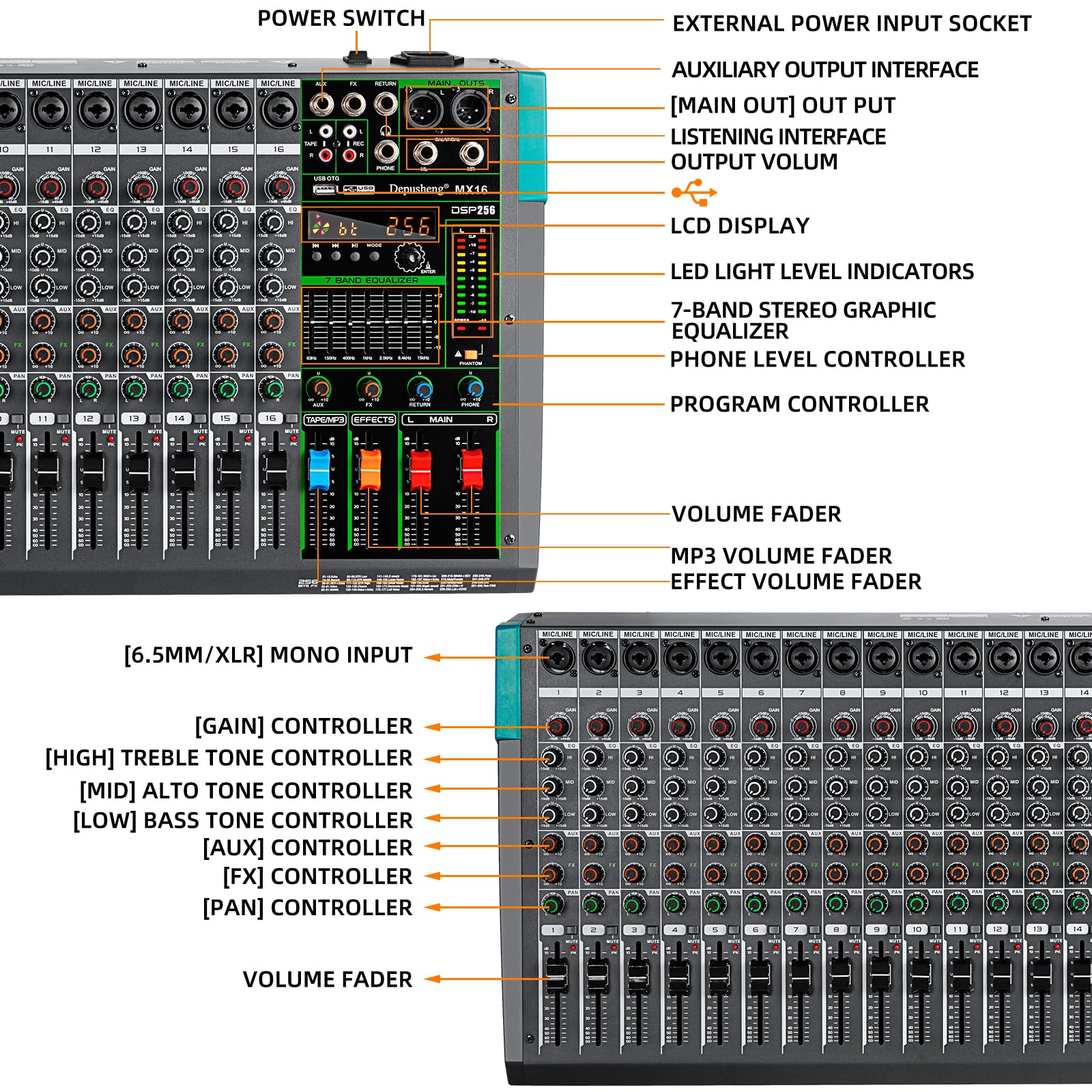 16 channel mixer, with MUTE , MP3 function with USB and DSP digital effects, rotary compressor for easy control, stronger bass and cleaner vocals.