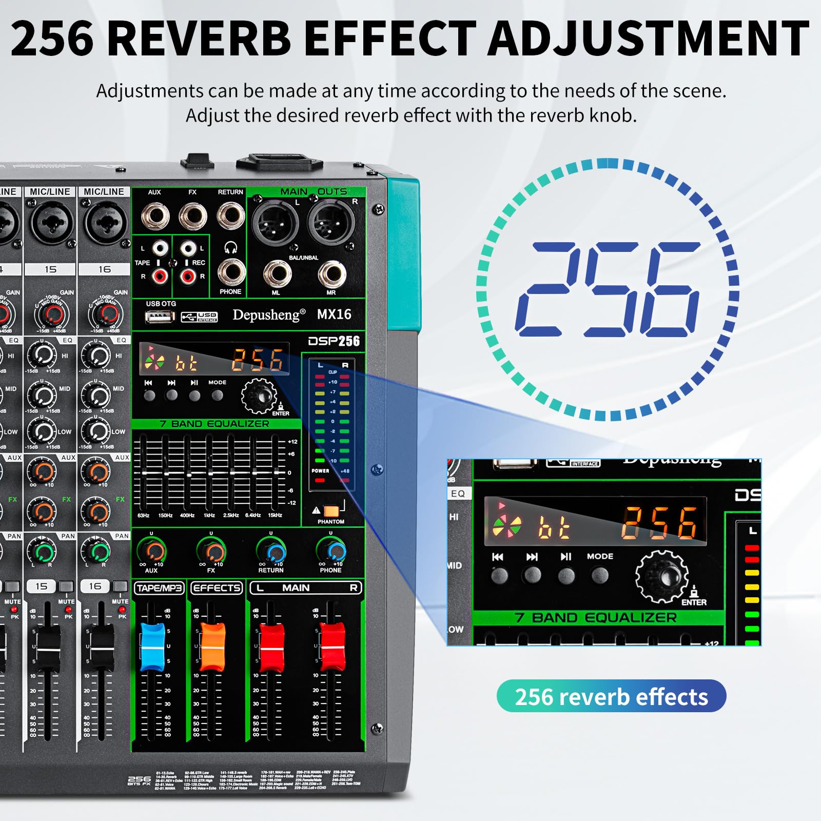 256 kinds of reverberation effect adjustment can be adjusted at any time according to the needs of the scene, and the required reverberation effect can be adjusted through the reverberation knob.