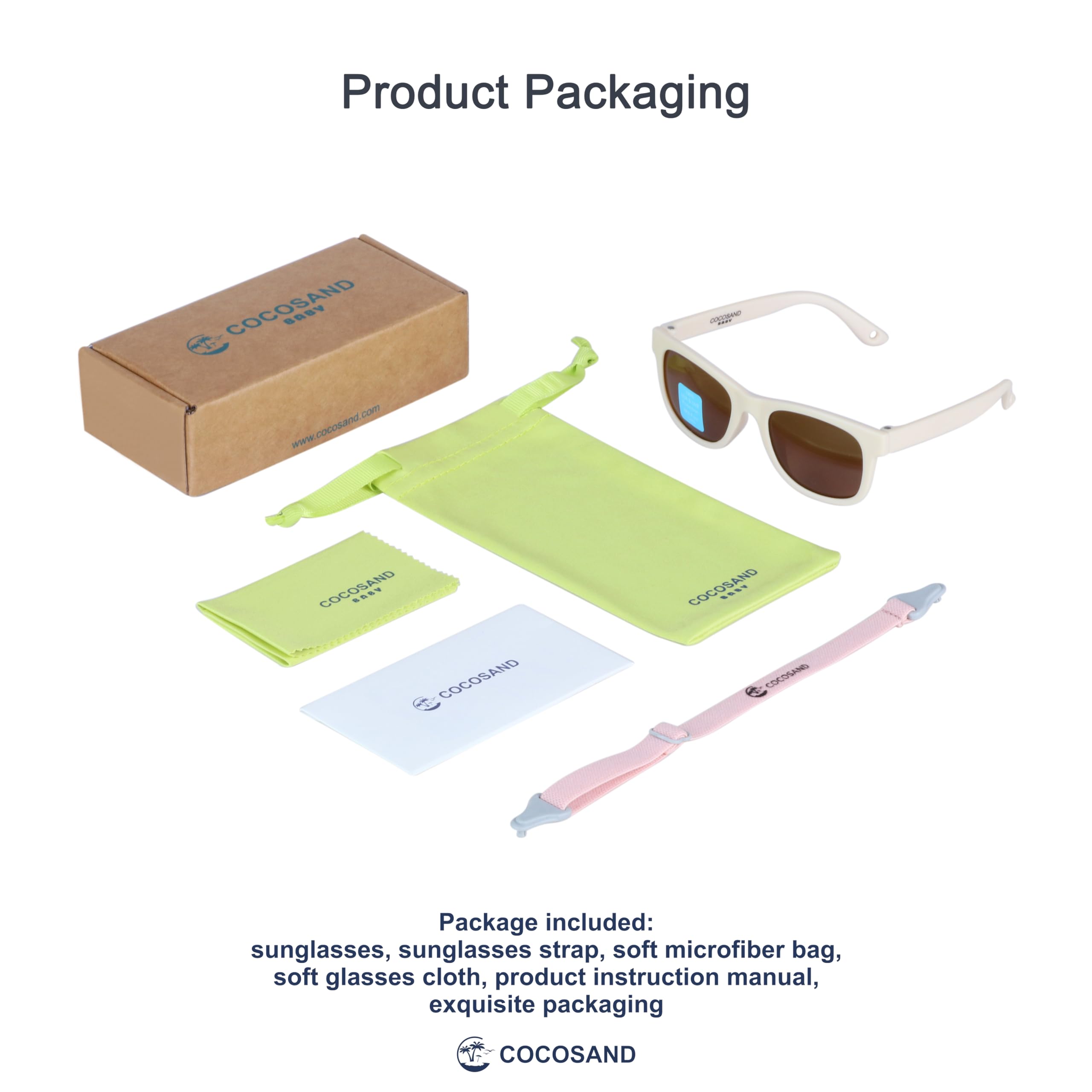 Package contents: 1 pair of sunglasses, 1 strap, sunglasses pouch, cleaning cloth, product manual, and a packaging box