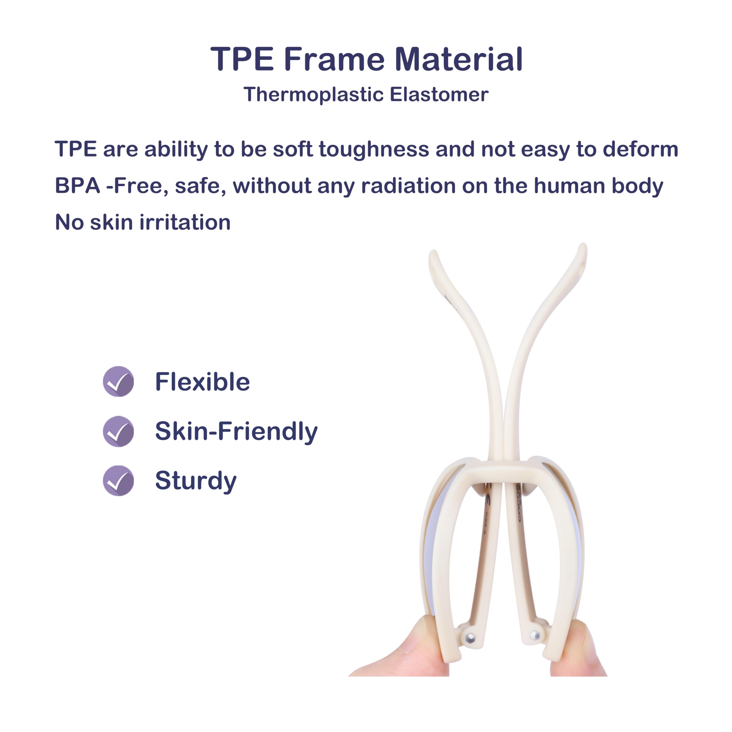 Frame: Made of high quality thermoplastic elastomer (TPE). TPE material is soft, smooth, flexible and lightweight to wear without squeezing the ears and nose. It is food grade, non-toxic and tasteless, durable and scratch-resistant