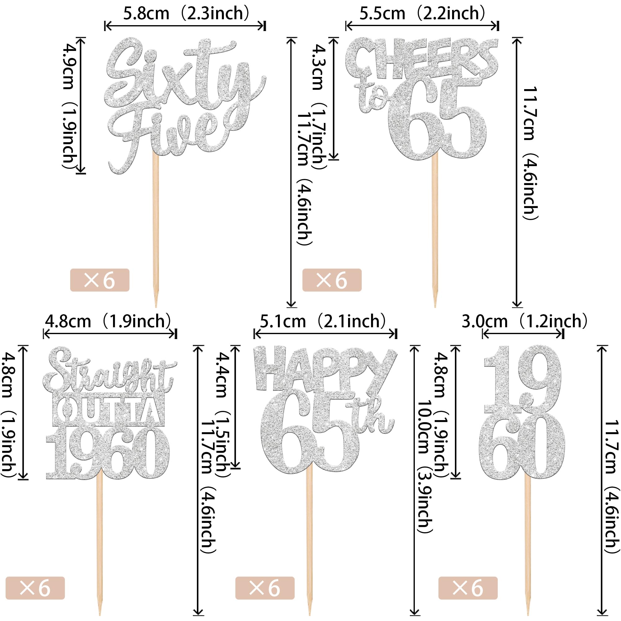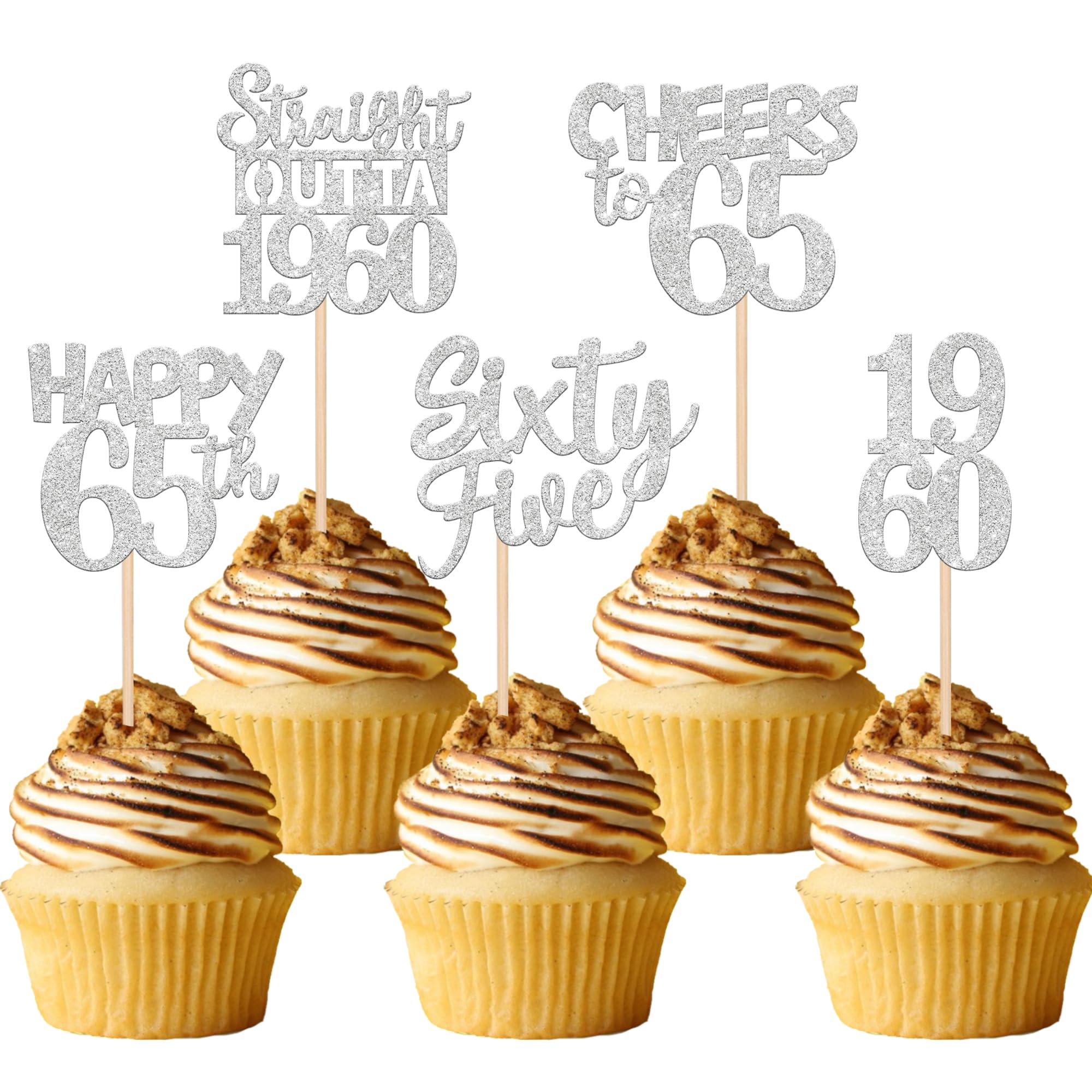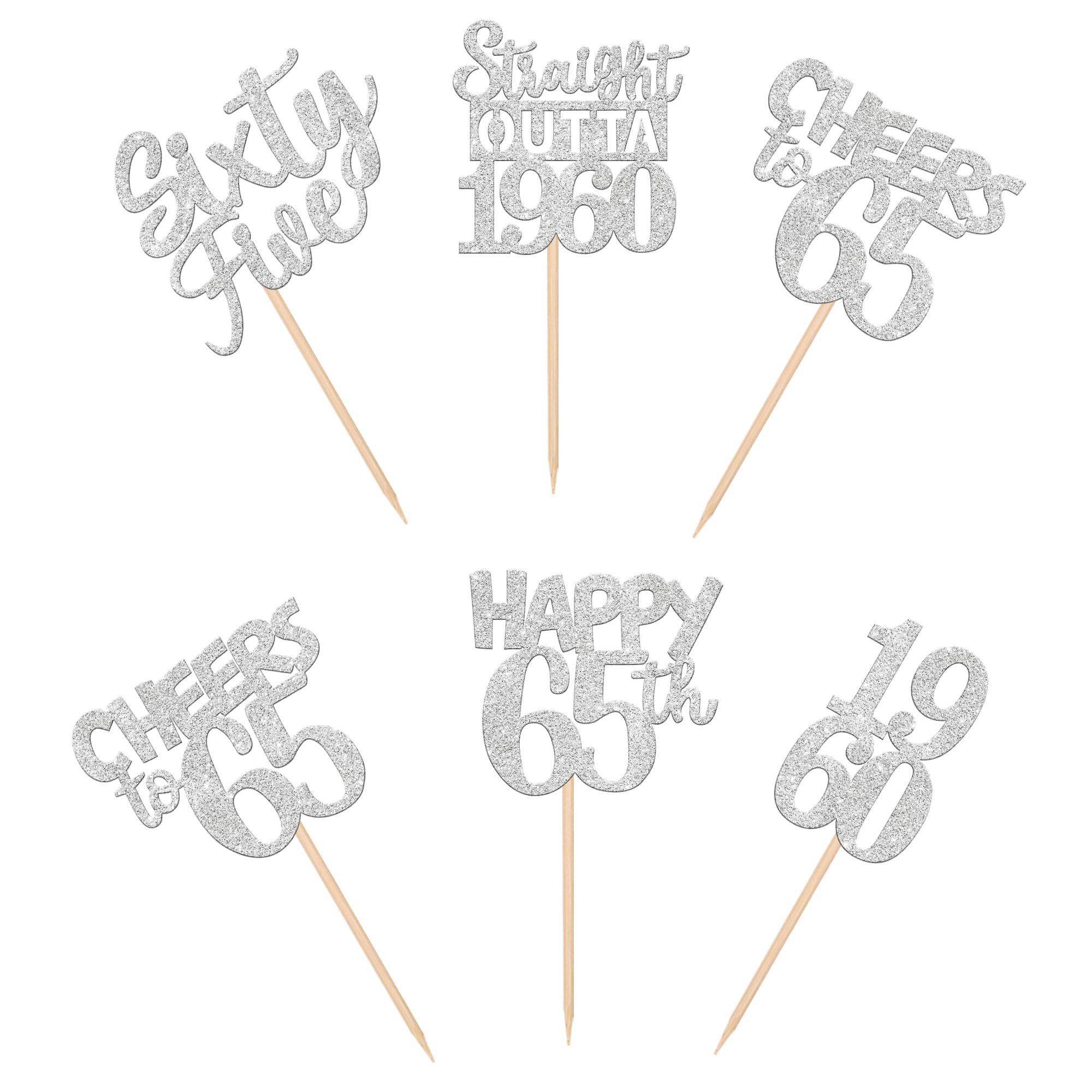 30 PCS 65th Birthday Cupcake Toppers Glitter Sixty Five Happy 65th Straight Outta 1960 Cupcake Picks for Cheers to 65 Fabulous 65th Birthday Anniversary Party Cake Decorations Supplier Silver Perfect for happy 65th bithday theme party, straight outta 1960 theme party, 65th wedding anniversary theme party,cheers to 65 years theme party cupcake decorations supplies. Pack of 30 pcs, 6 pcs of each design. The size is 2.3*4.6/ 2.2*4.6/ 1.9*4.6/ 2.1*3.9/ 1.2*4.6 inch ( with stick ) Made of high quality paper card stock,thick and sturdy. These straight outta 1960 cupcake toppers are one side glitter, another side is white, and they are intended for decoration only, please do not put them in oven or microwave. If the item you received has any defects, please contact us immediately. we will deal with it within 24 hours.