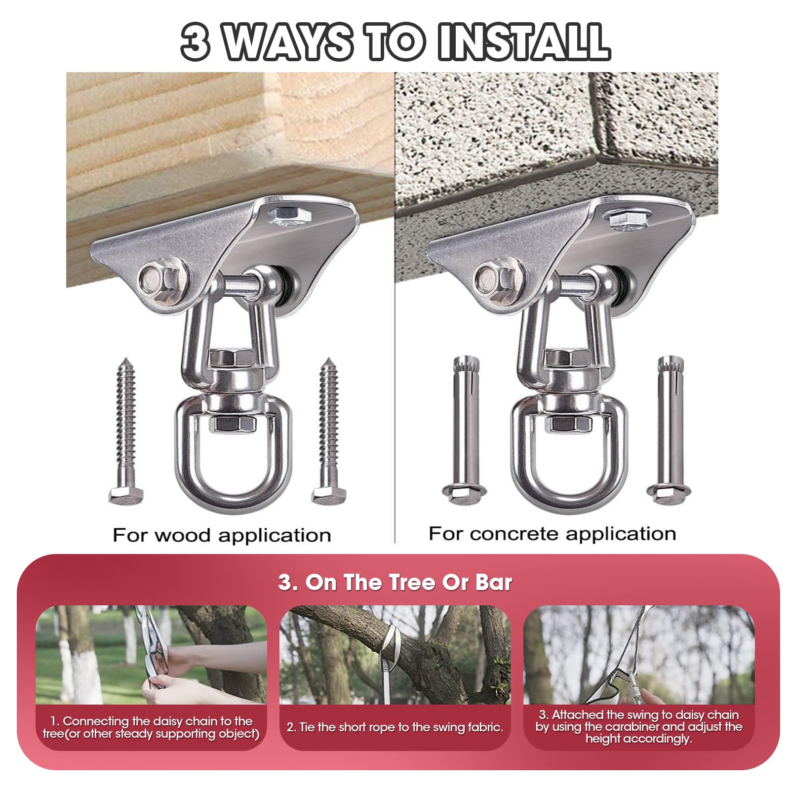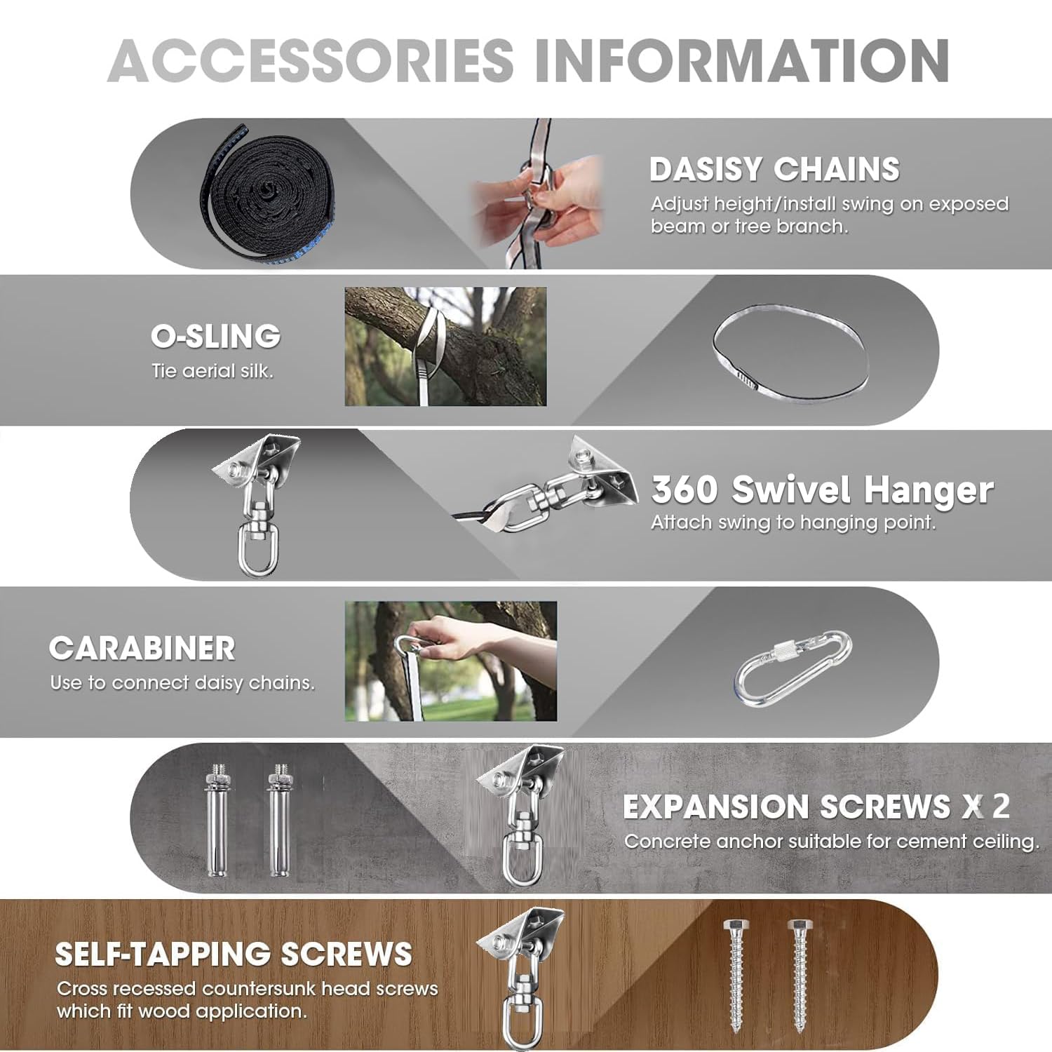[DURABLE & SAFE]: The therapy swing comes with silk Nylon hammock, 1 Multi-loop climber strength daisy chains, 1 safety carabiner with twist lock system, 1 connecting rope, 360° swivel hanger, expansion screws x2 and self-tapping screws x2. The hardware and the accessories we provide are durable, whose max load-bearing capacity is up to 220 lbs (100 kg).