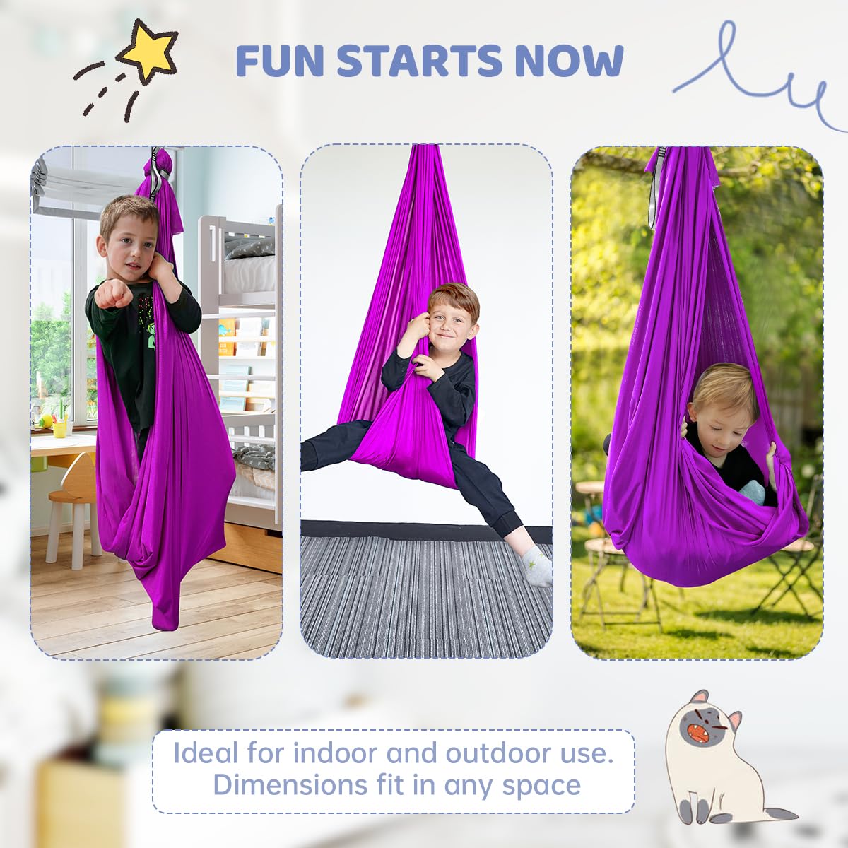 [EASY USE]: No need to purchase extra hardware or figure out complicated pieces. This sensory swing is sent with necessary hardware. The whole swing can be set up within few minutes indoor/outdoor.The daisy chain can adjust the height easily--make hanging simple for kids.(Age: Over 3 years old. Young children should use it under supervision and with help of adults)