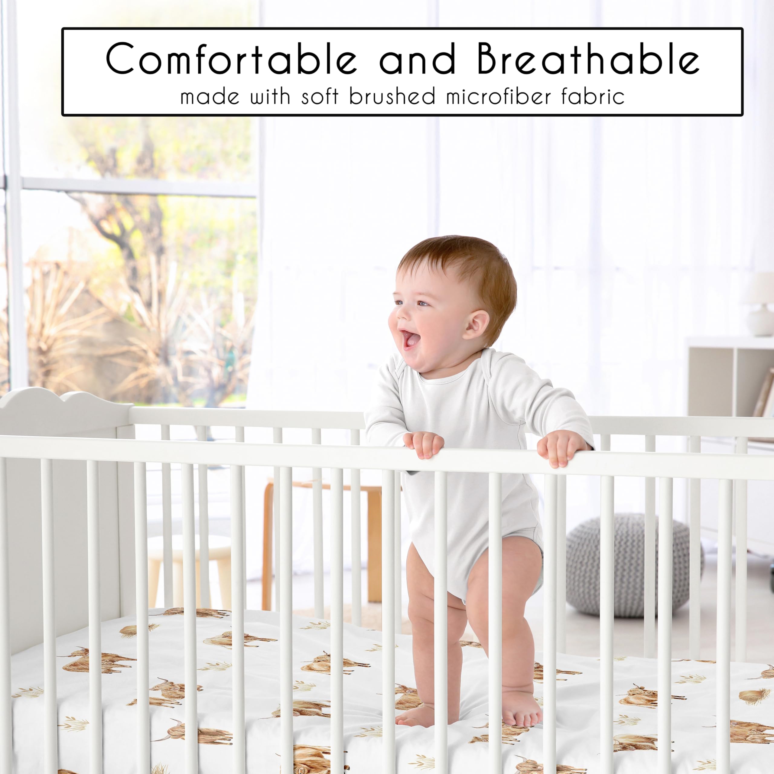 SNUG FIT: Includes (1) Fitted Crib Sheet 52in. x 28in. x 8in. Our newborn standard crib sheets fit snugly, with premium elastic sewn around the entire bottom edge for a secure fit on most standard sized cribs & toddler beds, to reduce shifting & bunching. This modern bohemian animal brushed microfiber crib sheet features a watercolor rustic farmhouse high land cow print in a classic boho country farm animals cattle ranch style & is gentle on delicate skin to foster a soothing sleep environment.