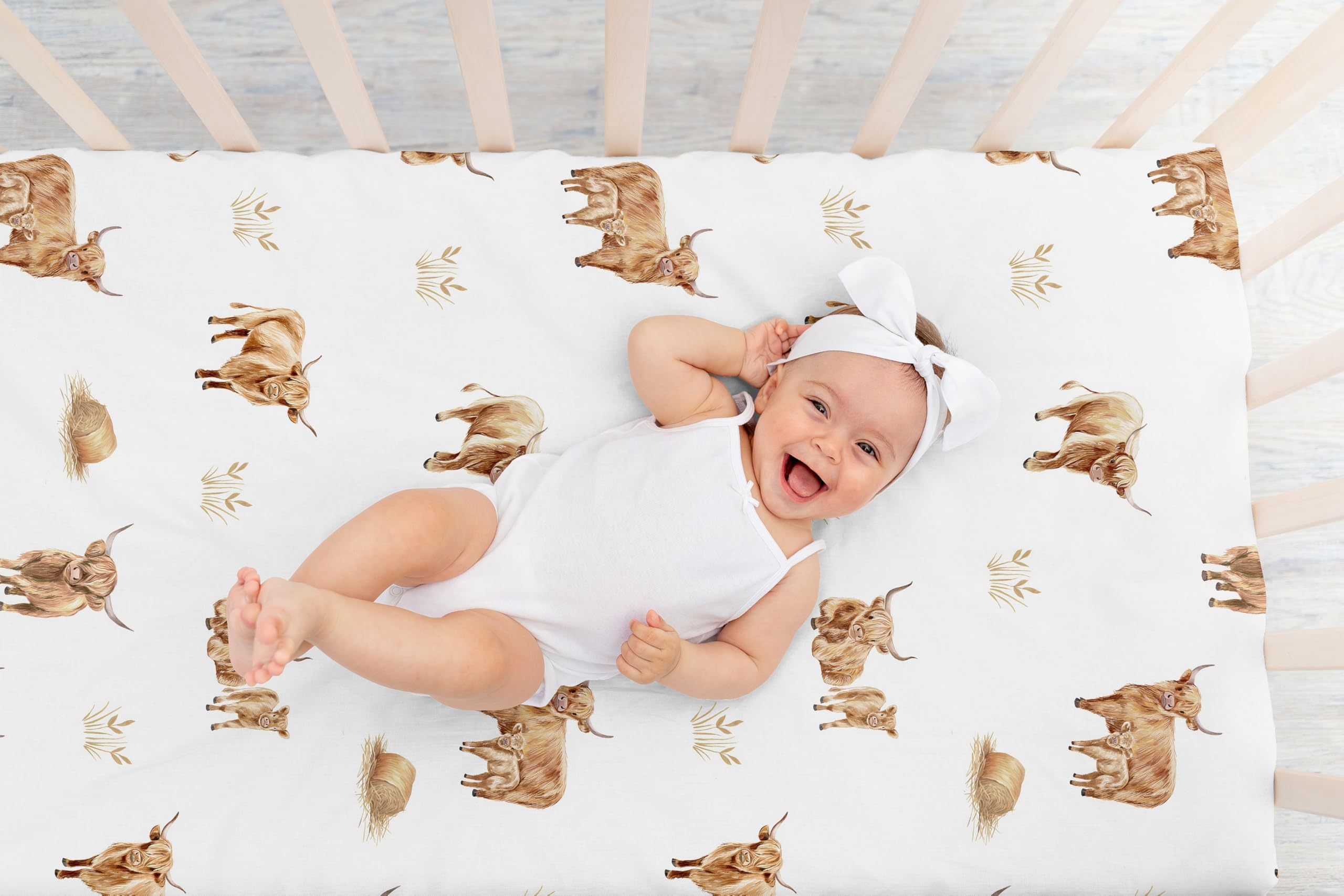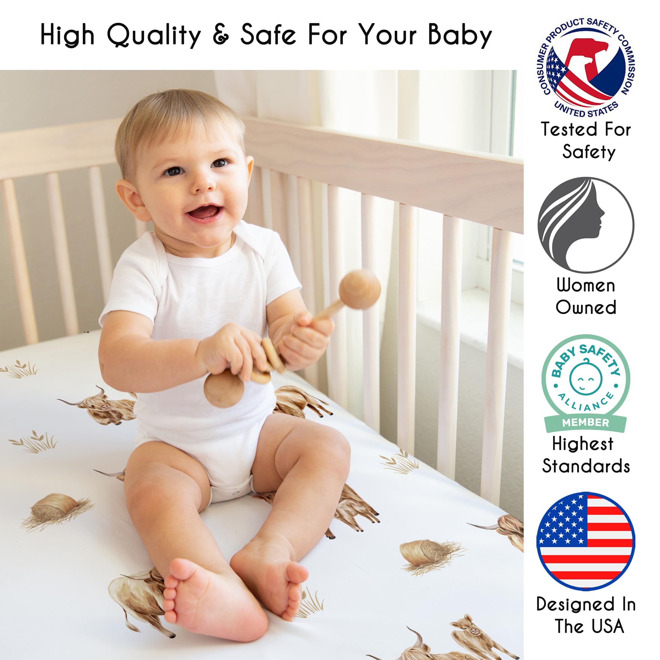 DESIGNED IN THE USA: By real parents who understand the need for comfort, practicality, and style. Sweet Jojo Designs is a small, women owned business. The mom's on our team know a crib mattress sheet is first priority for your baby essentials to ensure a restful night of sleep. We use top fabrics and designs to create soft crib sheets that are stretchy and comfortable for your infant or toddler. We've studied the latest trends in highland cow crib sheets neutral to bring you the finest product.