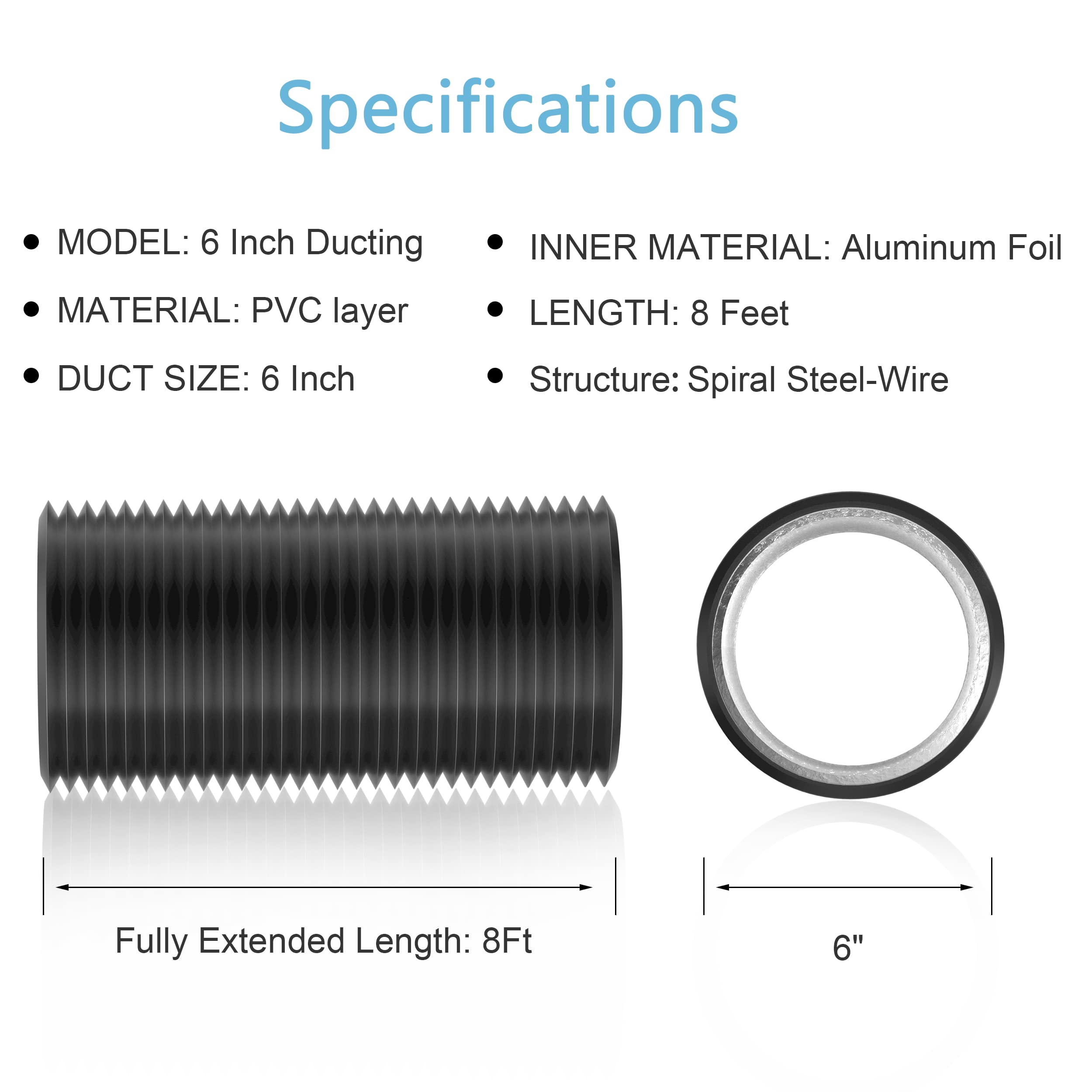 Flexible and Easy to Use: Hon&Guan 6 Inch duct is super flexible and easy to install, it will slide right on your duct fan, vent exhaust, carbon filter or light reflector. This ventilation duct is 6 Inches in diameter and comes in one 8 feet long piece, which can be cut into as many pieces as you need using a wire cutter and a paper knife.