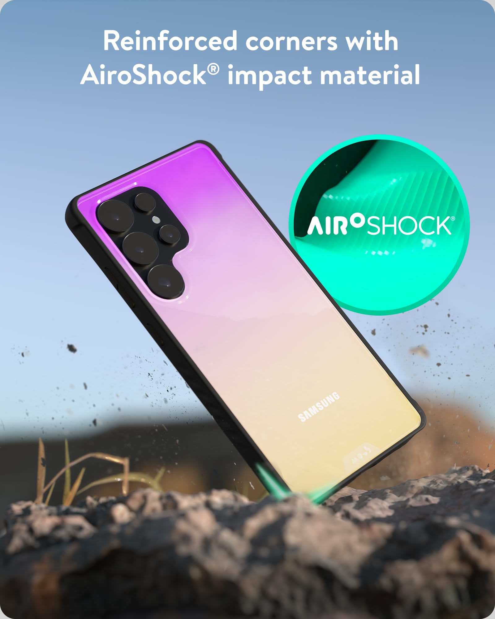 EXTREME SHOCK AND DROP DEFENCE – Made with impact-absorbing AiroShock technology, reinforced corners and tough, rigid materials to protect your Samsung Galaxy S25 Ultra from drops and shocks