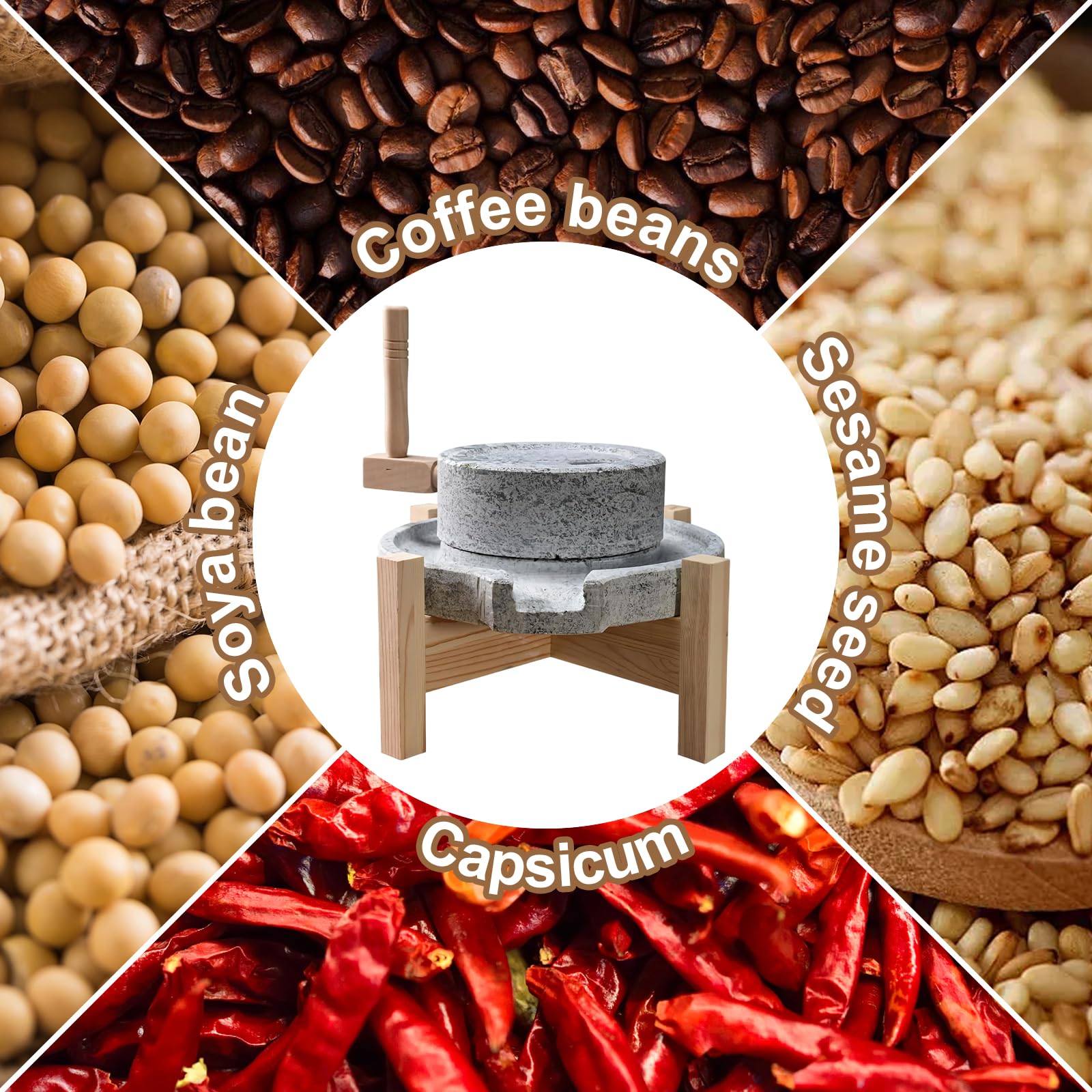 【Household Grain Mills】- Grinding wet soybean milk, wheat flour, corn juice, sesame seeds, almonds, peppers, spices, mung beans and other small grains; If you want to get refined powder or liquid, you can grind stone grain millsseveral times or soak beans in advance