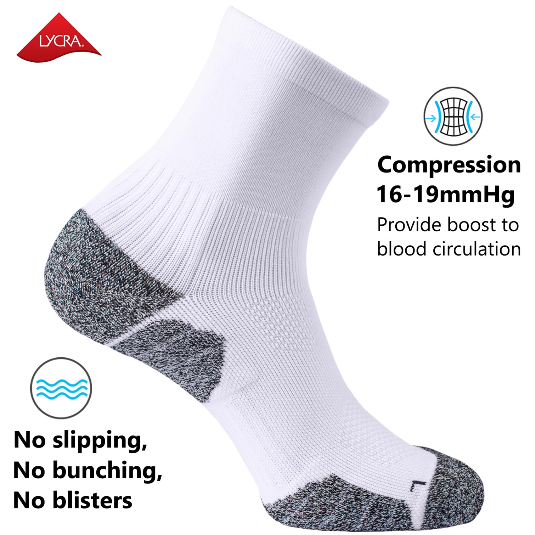 COMPRESSION FIT: Sport socks with targeted compression (16-19 mmHg) to provide boost to your blood circulation, anti-swelling, arch support, fit your feet perfectly and no slipping, no bunching, no blisters