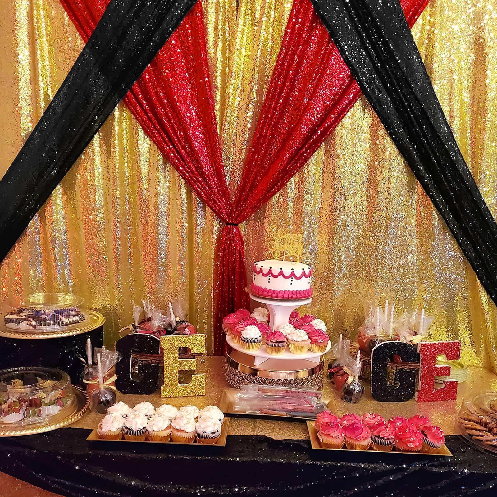 Valentines Day Backdrop Curtains:The shimmer backdrop curtain is made of thick fabric and paired with dazzling golden sequins. Hang them on window or wall as a backdrop,or it could be one entrance to the party. And you can paired with balloons, banners and various photo props on this backdrop,create a unique and exquisite themed party.