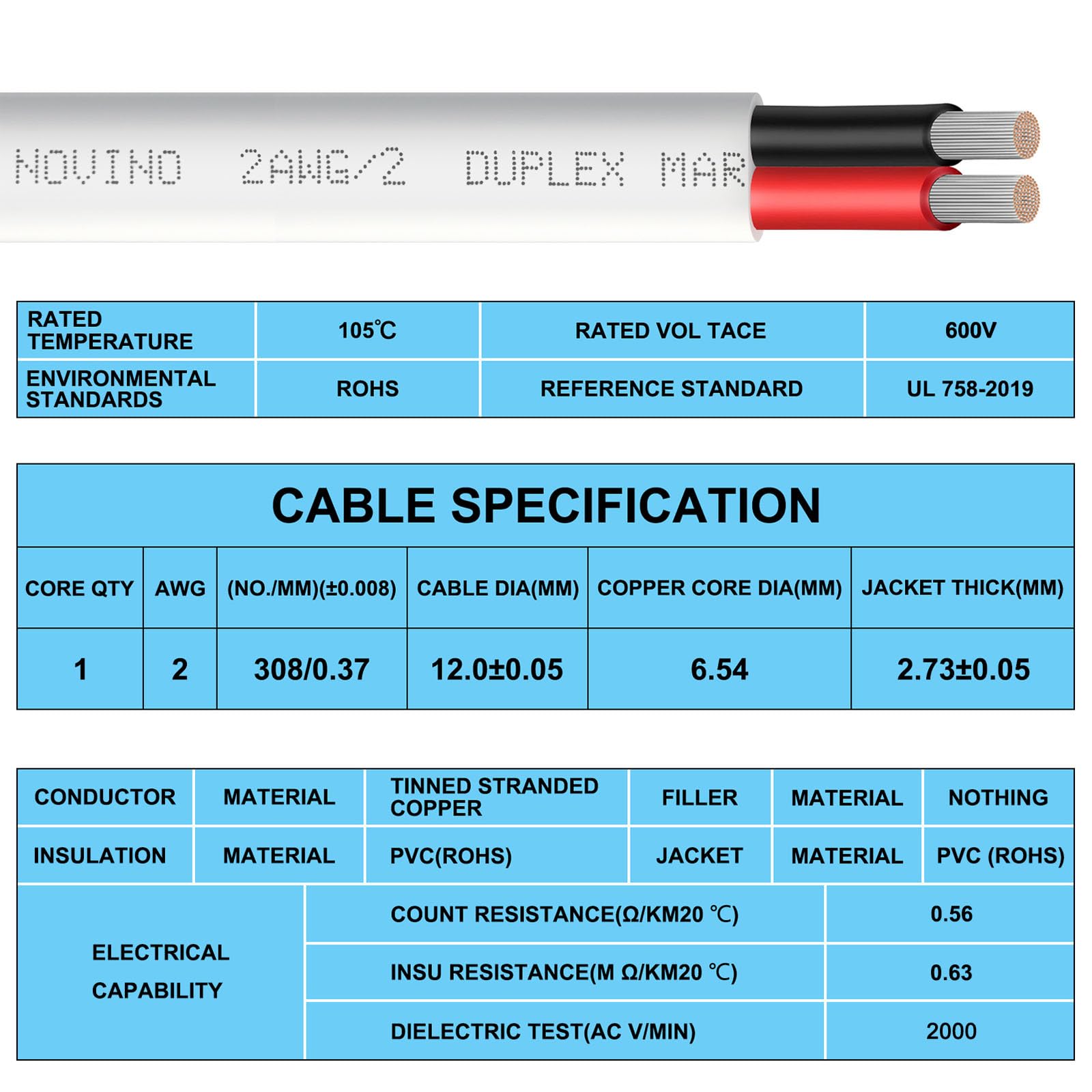 Marine grade wire Spec:white PVC jacket, red&black conductor sheaths, tinned & stranded true 2 AWG 2/2 flat copper wire,2 awg wire is insulation rated to 600v, 105 degrees C dry, and 75 degrees C wet