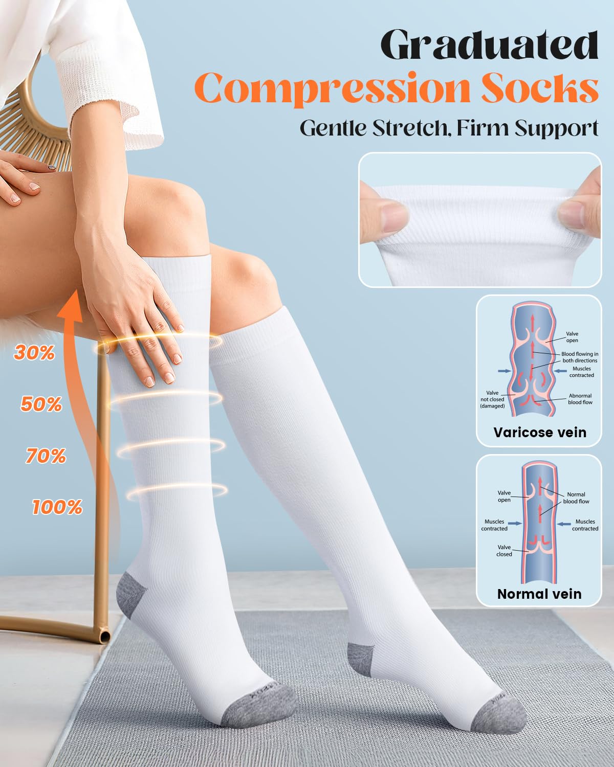 Easy to Wear,Stays in Place: These knee high compression socks for women are crafted using a special knitting technique for strong stretch and better fit. They're easy on compression socksβsimple to pull on, yet snug enough to stay up without sliding
