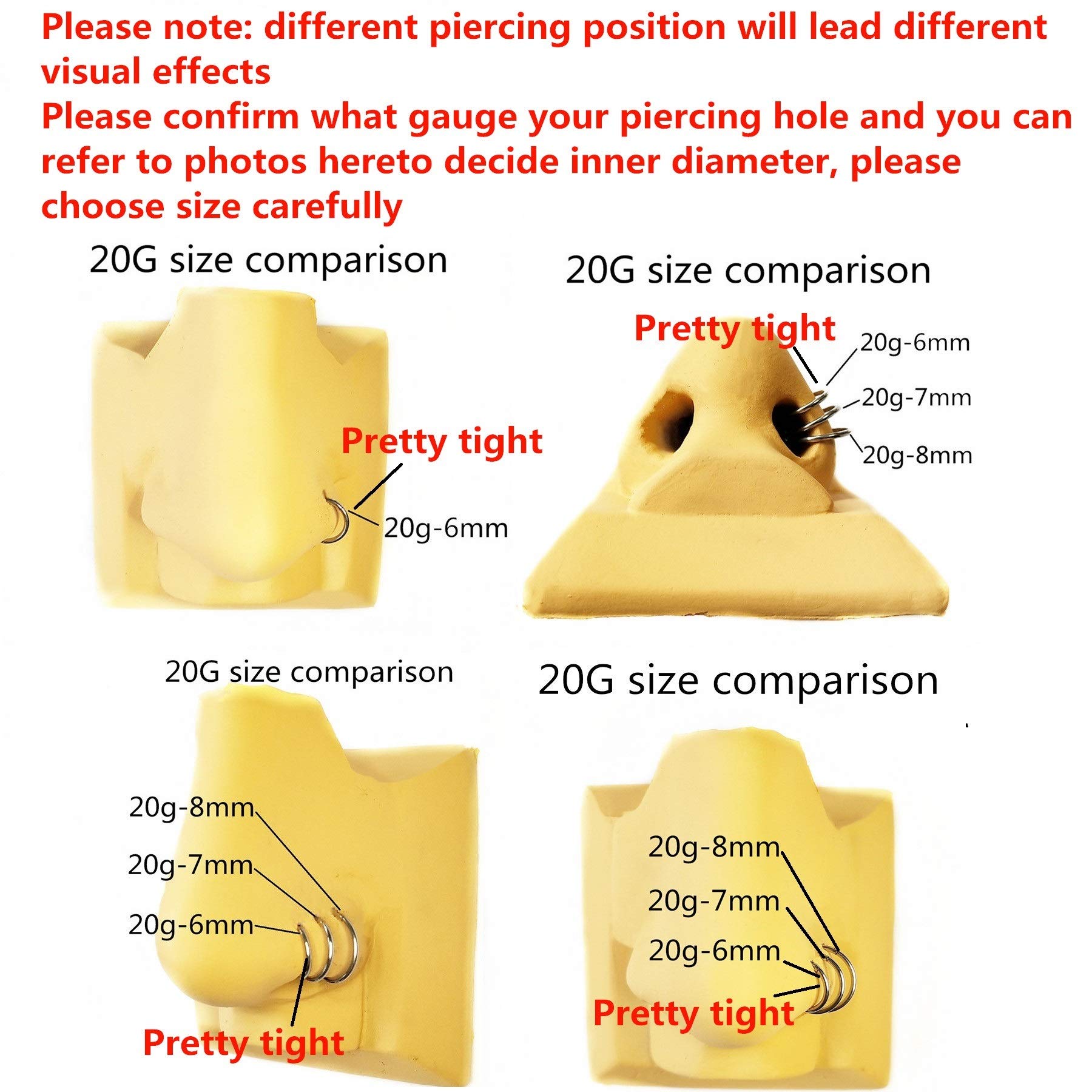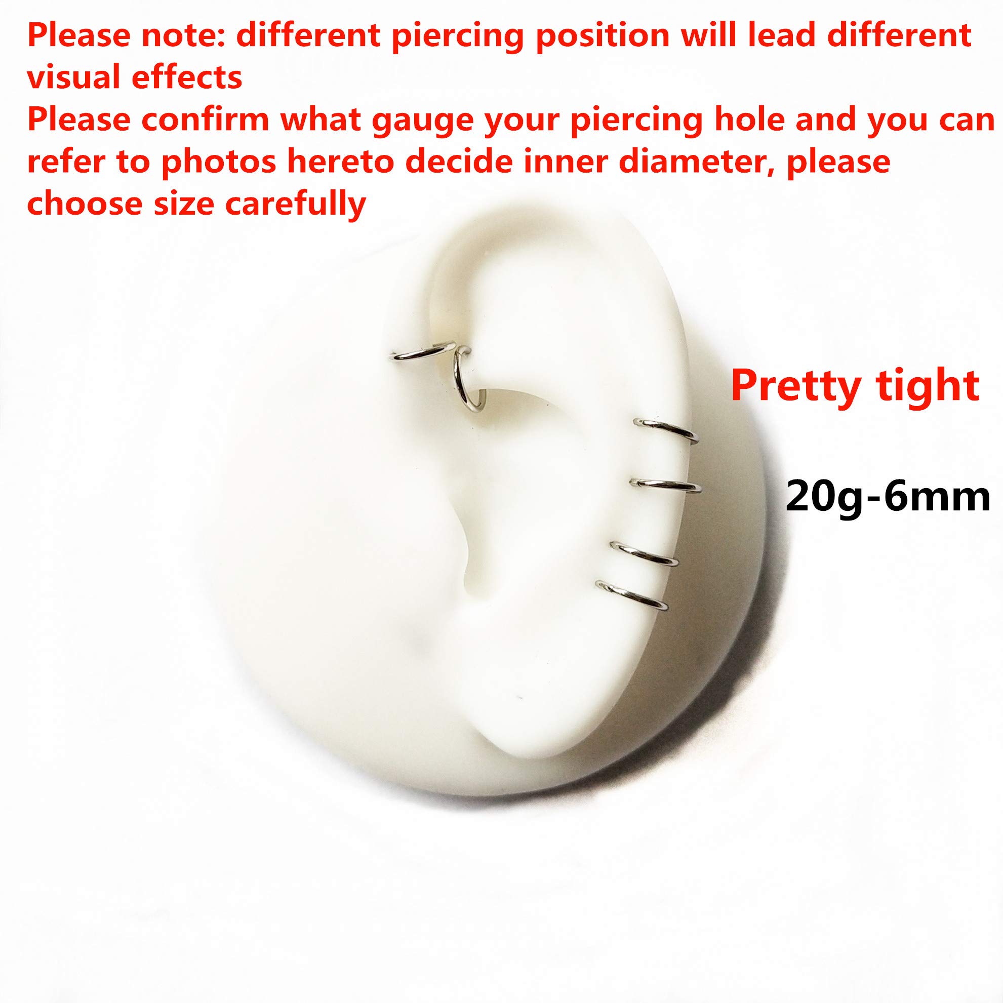Small 20 gauge inner diameter 6mm Nose Hoop/ 20 gauge cartilage earring hoop, Perfect for nose piercing(piercing hole is closer to the edge), Cartilage earring hoop and second or third lobe piercing hoop for small ears, Tragus Earrings Piercings,Forward Helix Earring, Daith Earrings,Conch,Rook Ear Piercing and more. Very easy to open/close a click closure by hand. Not require a tool.Smooth surface, comfortable to wear without sharp edge. Match with suitable apparel for different occasion.
