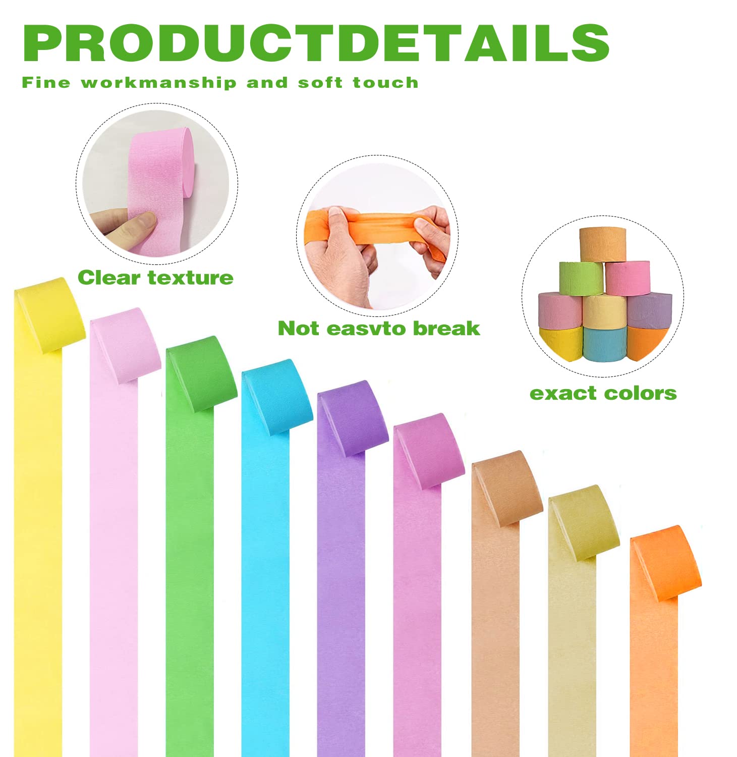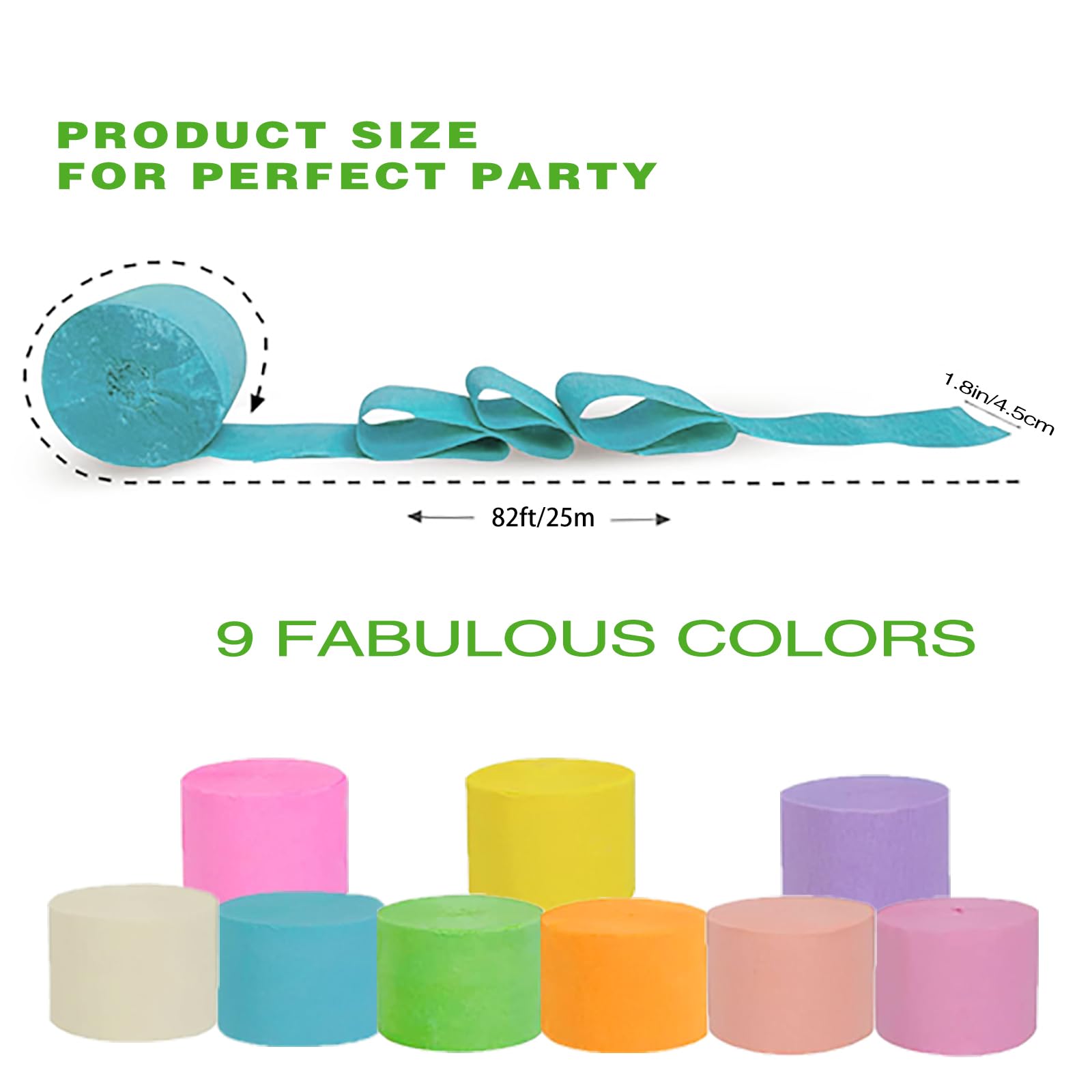 You can get: You will receive 9 rolls of corrugated paper streamers(Baby blue ,light pink ,light orange, light yellow, light purple, pink, light green, milky white, Peach color)1.8 Inch x 82 Ft/Roll, Each roll has different colors and is colorful, perfect for decorating the place you need. Exquisite decorations can make your party more attractive!