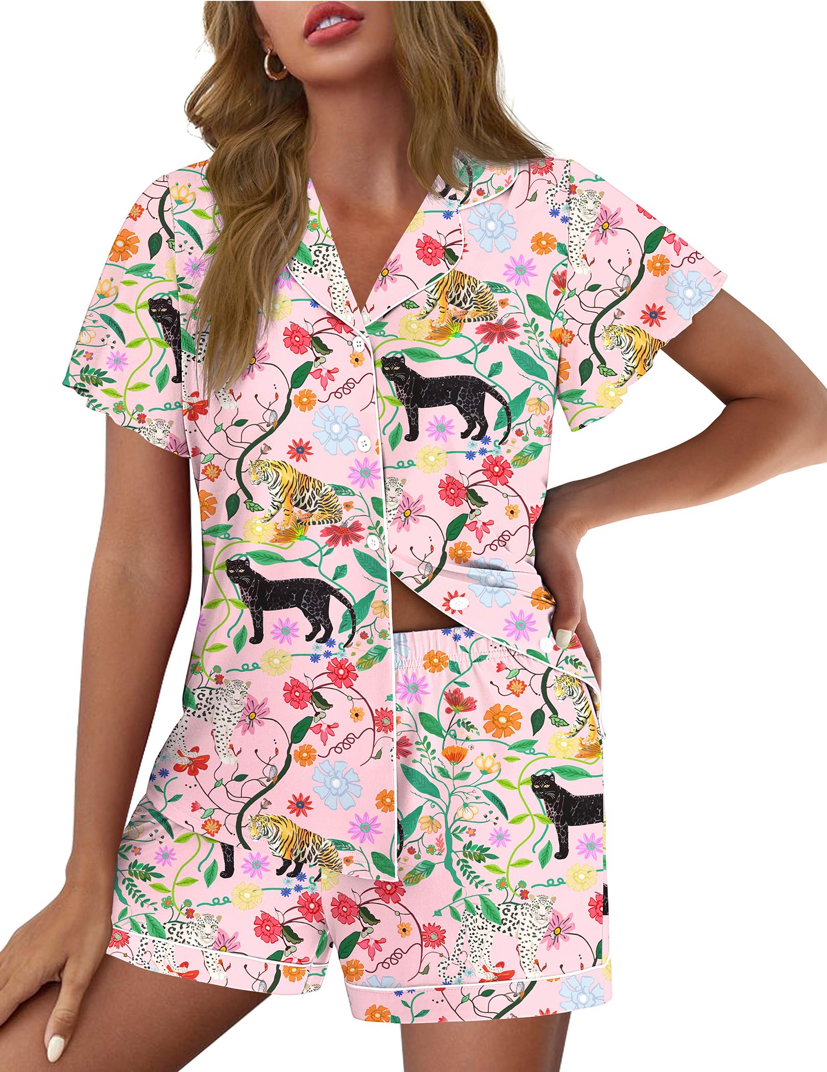 【Thoughtful Design】This women's pajama set features a short sleeve button-down top that falls at the hip, with a stylish notch collar. The shorts come with an adjustable drawstring elastic waistband for a custom fit, plus two convenient side pockets for small essentials.