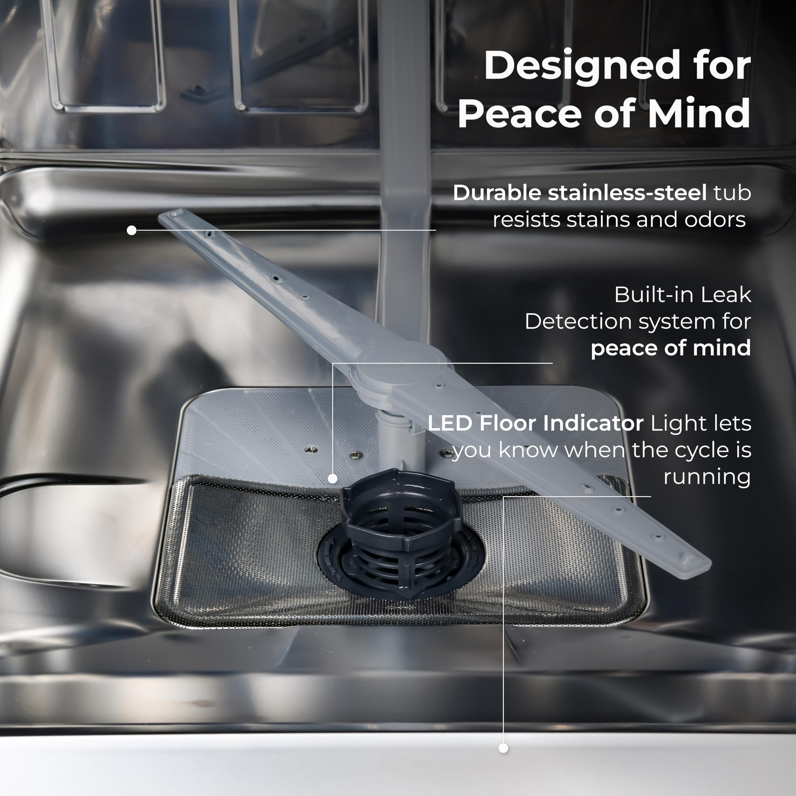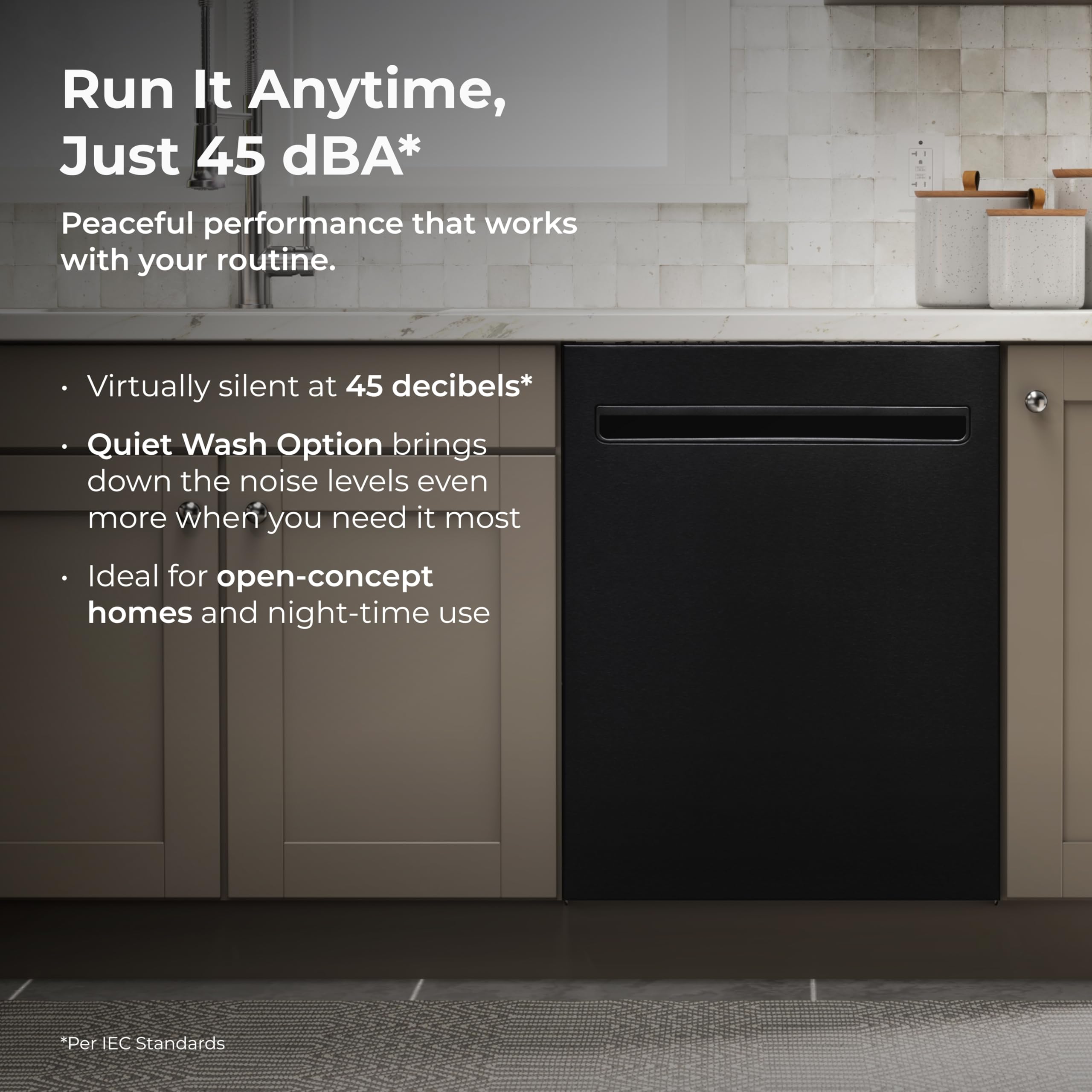 Whisper-Quiet Wash + Smart Features: This dishwasher runs at just 45 dBA, with a QuietWash option for a whisper quiet cycle. LED floor light shows when it's running, and smooth top-mounted controls add a modern, streamlined touch