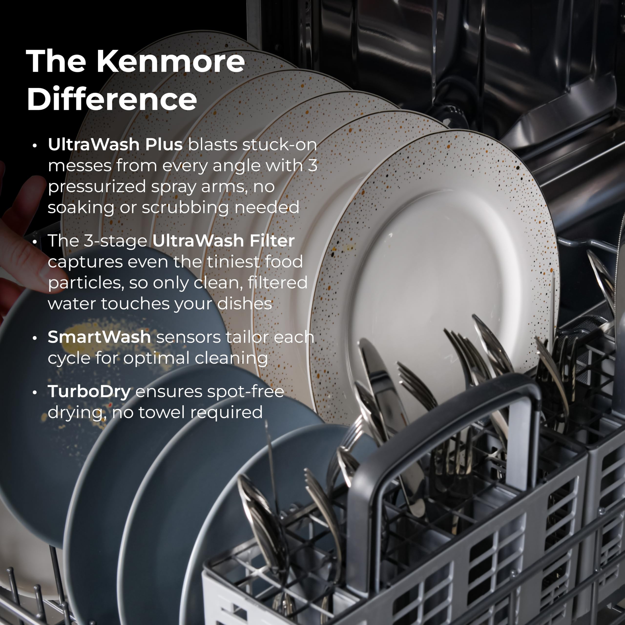 The Kenmore 24" Built-In Dishwasher gives you a powerful clean with an ultra-quiet performance. UltraWash Plus blasts away stuck-on messes with 3 pressurized spray arms and filtered water. The SmartWash cycle adjusts to the mess level, while TurboDry ensures spot-free dishes, even plastics. The EasyFlex Third Rack adds 35% more space for large utensils, and the MoreSpace Adjustable Rack makes room for tall or bulky items. With room for 15 place settings, you can handle big meals with ease. At just 45 dBA, itβs whisper quiet, and an LED floor light shows when a cycle is running. Hidden smooth-touch controls keep the exterior clean and modern. ENERGY STAR Certified with built-in Leak Detection and Delay Start for flexible, worry-free dishwashing.