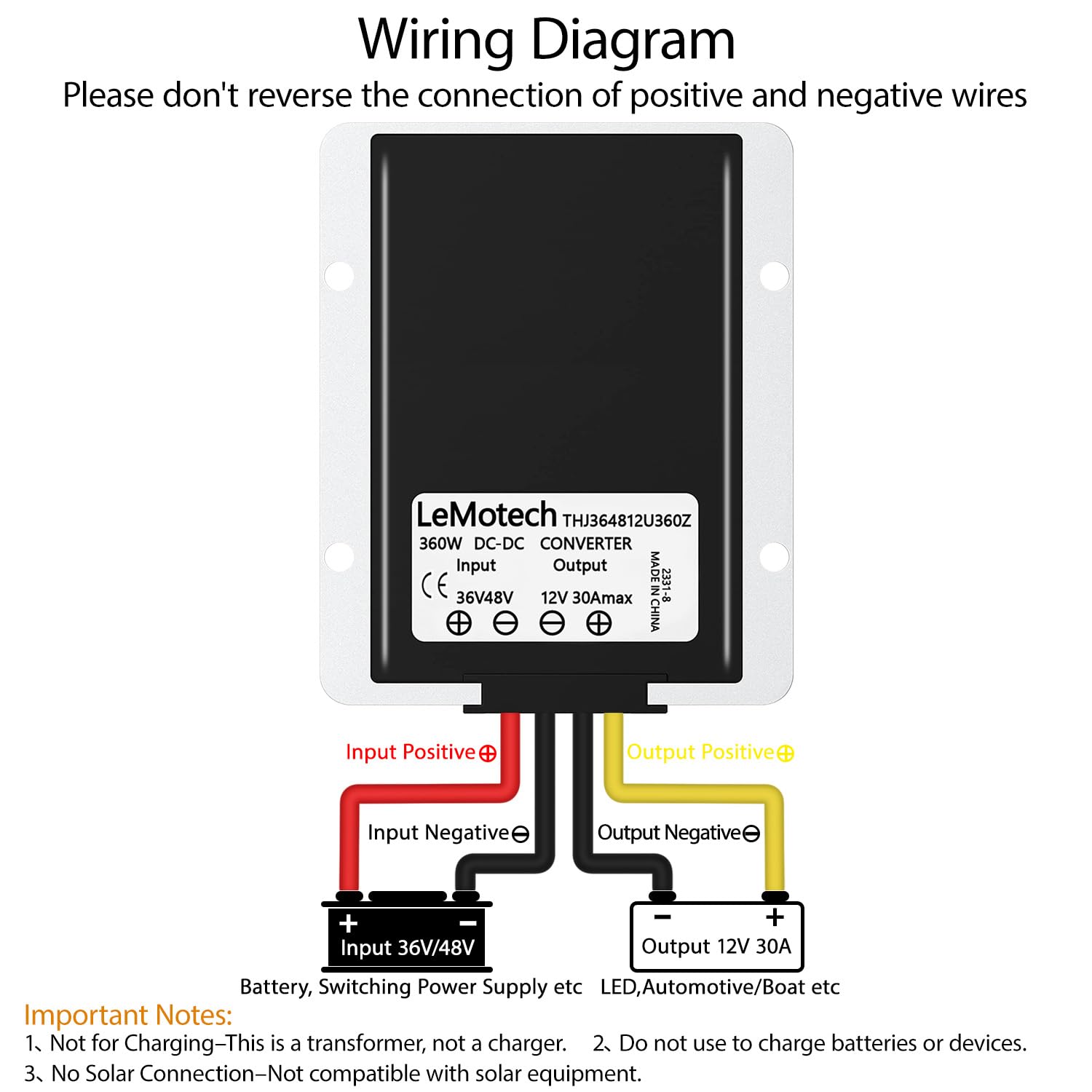 [ DC 36V/48V to 12V 30A Converter ] Input voltage range: DC 30-60V; Output voltage: 12V; Output current: 30A; Output power: 360W.