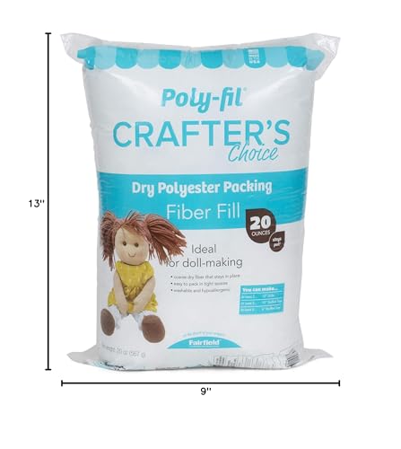 Fairfield's Poly-Fil Crafter’s Choice, a premium polyester fiberfill blend, is crafted from 100% polyester fibers that have not been treated with silicone to retain their dry, coarse texture. Easy to pack into small spaces with a stuffing tool without the fiber popping out of place, this fiberfill makes the ideal stuffing for stuffed animals, dolls, and toys. It stays in place and helps to maintain the fluff and structural integrity of your creations. Poly-Fil Crafter’s Choice stuffing is safe for use in your creative ventures. This polyester fiberfill blend is machine-washable, so you can keep your projects looking new for a long period of time. Machine wash on gentle with warm water, and then air dry or tumble dry on the air or low heat setting. Fiber may shift during laundering; gently massage the project with your fingertips to move the fiber stuffing back into place. This 20-ounce bag of Fairfield's Poly-Fil Crafter’s Choice is ideal for doll-making and different types of craft and home decor projects. It is made in the USA.