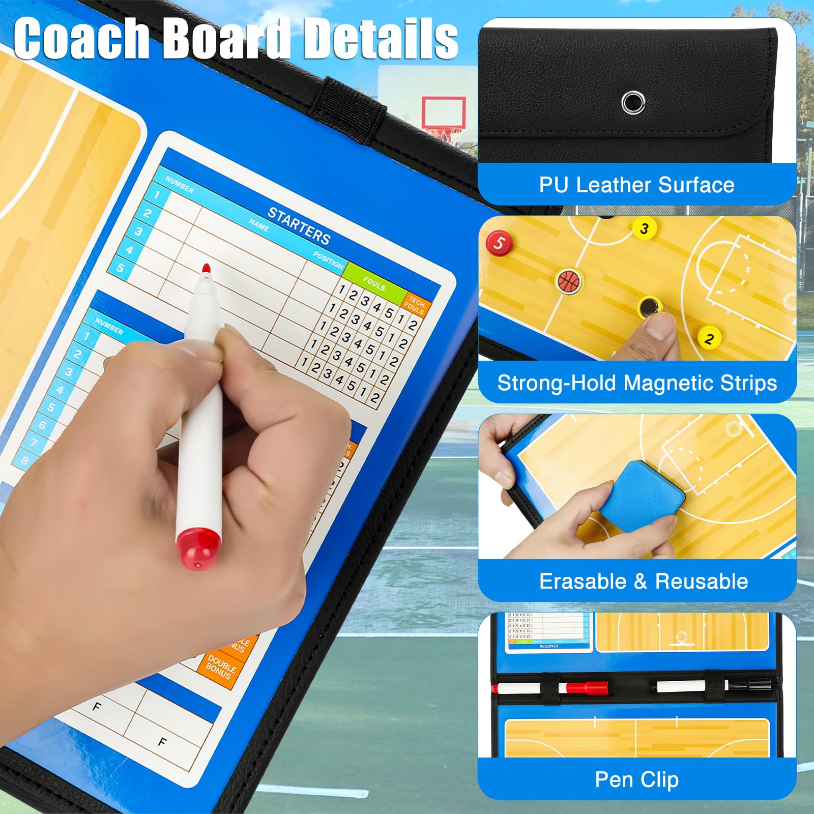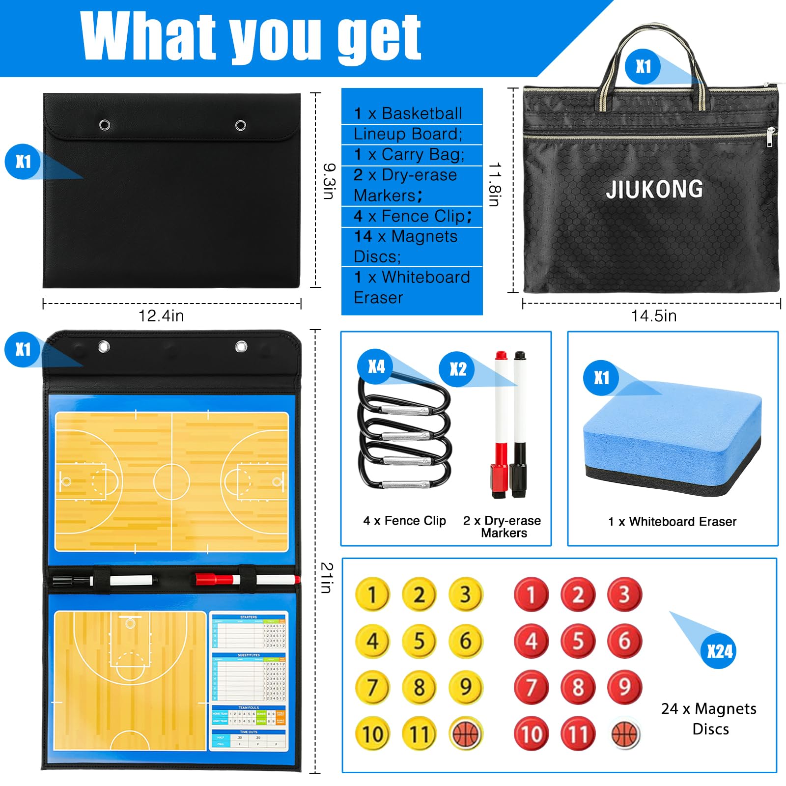 COACH WITH CLARITY – VISUALIZE PLAYS IN REAL-TIME: Use the magnetic dry-erase surface of the JIUKONG Basketball Coaching Board to map out strategies, player positions, and game plans. The included magnets stick firmly for shift tracking and special teams setup, while the dry-erase marker lets you adapt on the fly—perfect for timeouts and bench-side coaching.
