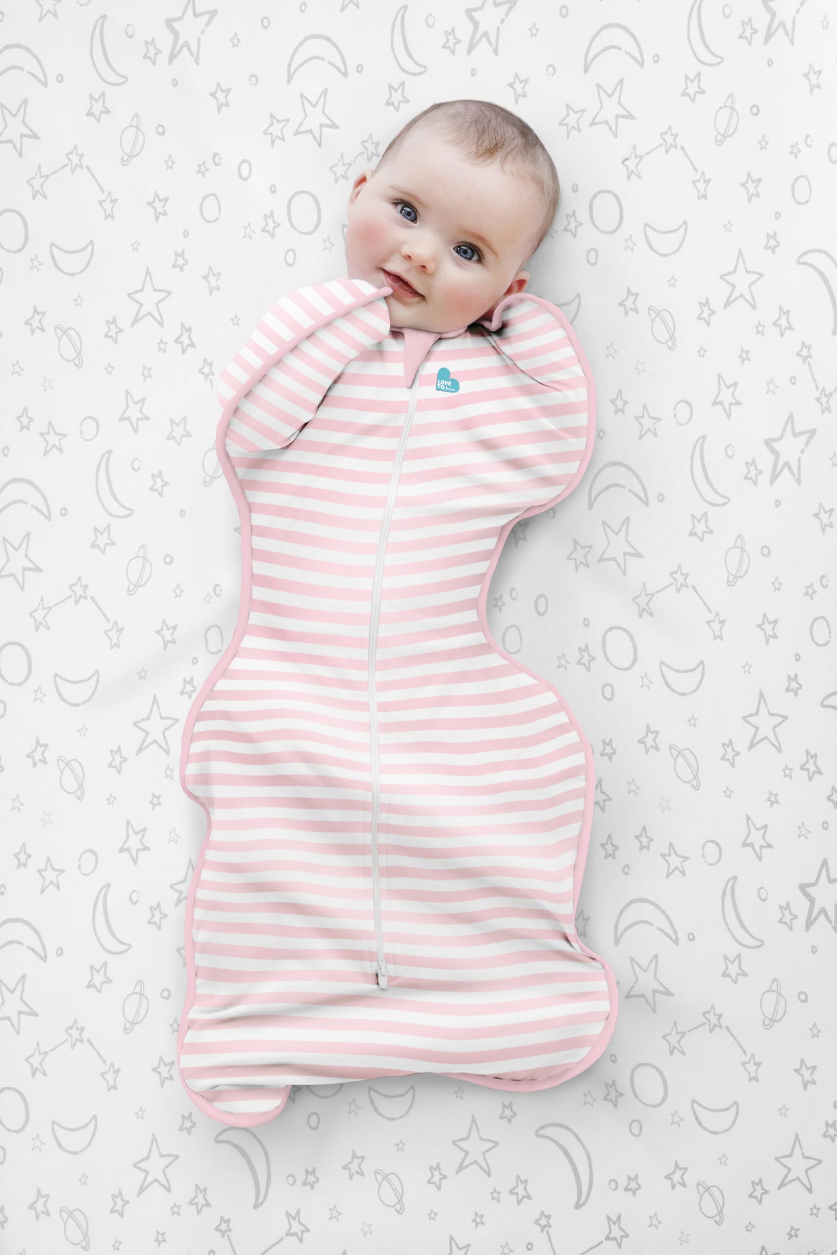 Love To Dream Baby Sleep Sack, Swaddle Up Self-Soothing Swaddle Sleep never felt this snug with our Swaddle Up Self-Soothing Sleep Sack, available in a range of classic colourways & prints. Our "Arms-Up" baby sleep sack, also known as a swaddle or wearable blanket, is designed to allow baby's arms to be positioned upward and close to their face while they sleep. 83% of parents reported an increase in hours slept by their baby when using Swaddle Up Baby's Natural Self-Soothing Sleep Position Most babies are more comfortable with their arms near their face, as this mimics the fetal position they were accustomed to in the womb. Allowing their arms to be up can enhance their sense of security and comfort during sleep. The ability for babies to self-soothe by touching their face or sucking on their fingers can be comforting. An arms-up sleep sack facilitates this natural soothing mechanism, promoting better sleep for baby. Babies have a startle reflex, also known as the Moro reflex, which can sometimes wake them up. Swaddling with Arms-Up can help reduce this reflex, preventing unnecessary disturbances to their sleep. Easy to Use, Hip-Friendly Design Our baby sleep sacks are designed to provide ample room for baby's legs and hips to move naturally, allowing for healthy hip development. The clever two-way zipper mechanism means quick and easy diaper changes for any parent, grandparent or carer, even in the middle of the night. The light weight, 1.0 tog sleep sack is ideal for MODERATE room temperatures between 68°F & 75°F. Fabric content: 93% Cotton 7% Elastane. The fabric elasticity allows for comfortable layering underneath for further insulation. From the unique, award-winning Swaddle Up, to bedding and Self-Soothing Toys, the Love To Dream range has grown to provide a portfolio of sleep solutions designed for children up to four years old.