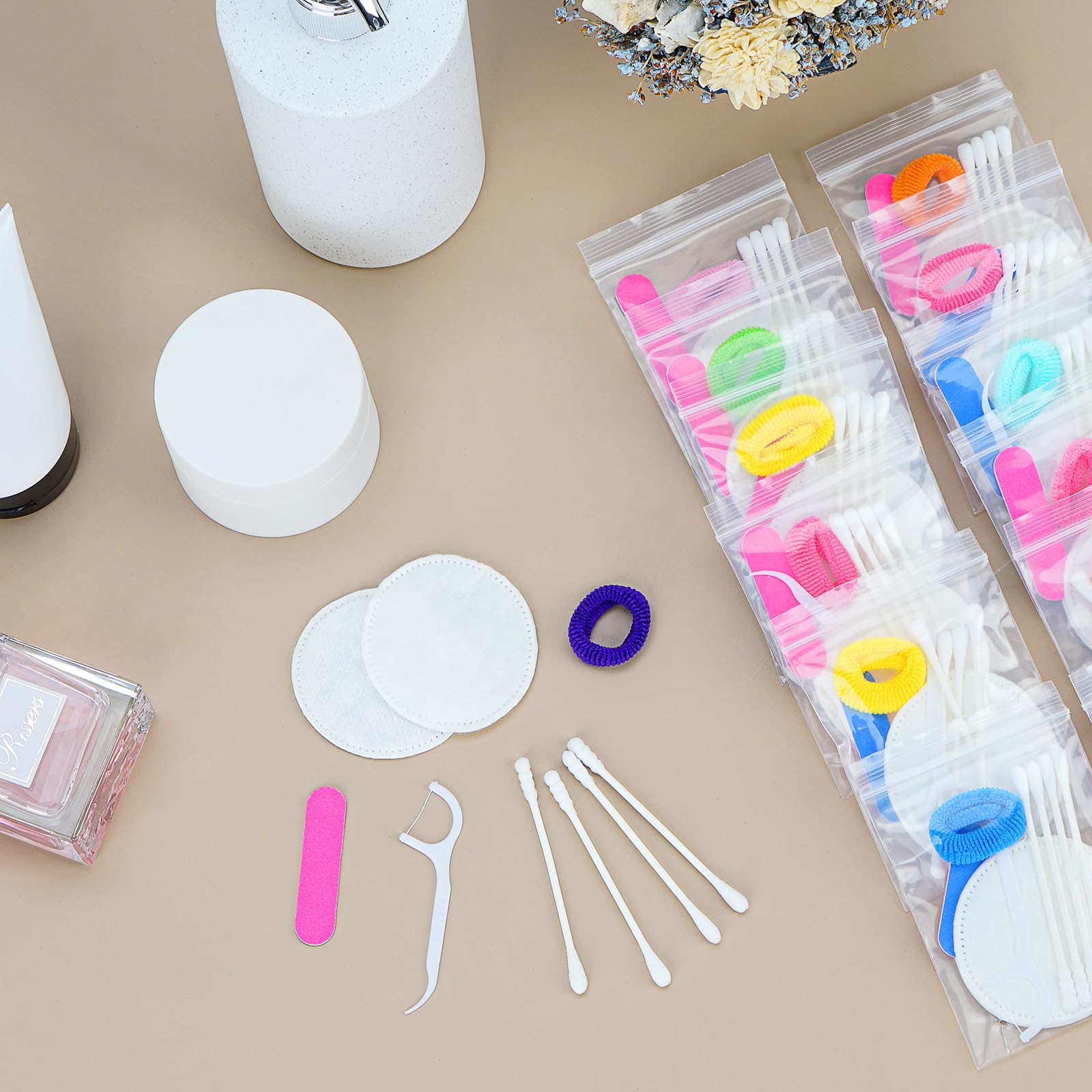 Package contents: Hotel vanity sets x 50 (Each set contains cotton pads x 2, cotton swabs x 4, dental floss x 1, nail file x 1 (color random), hair tie x 1 (color random))