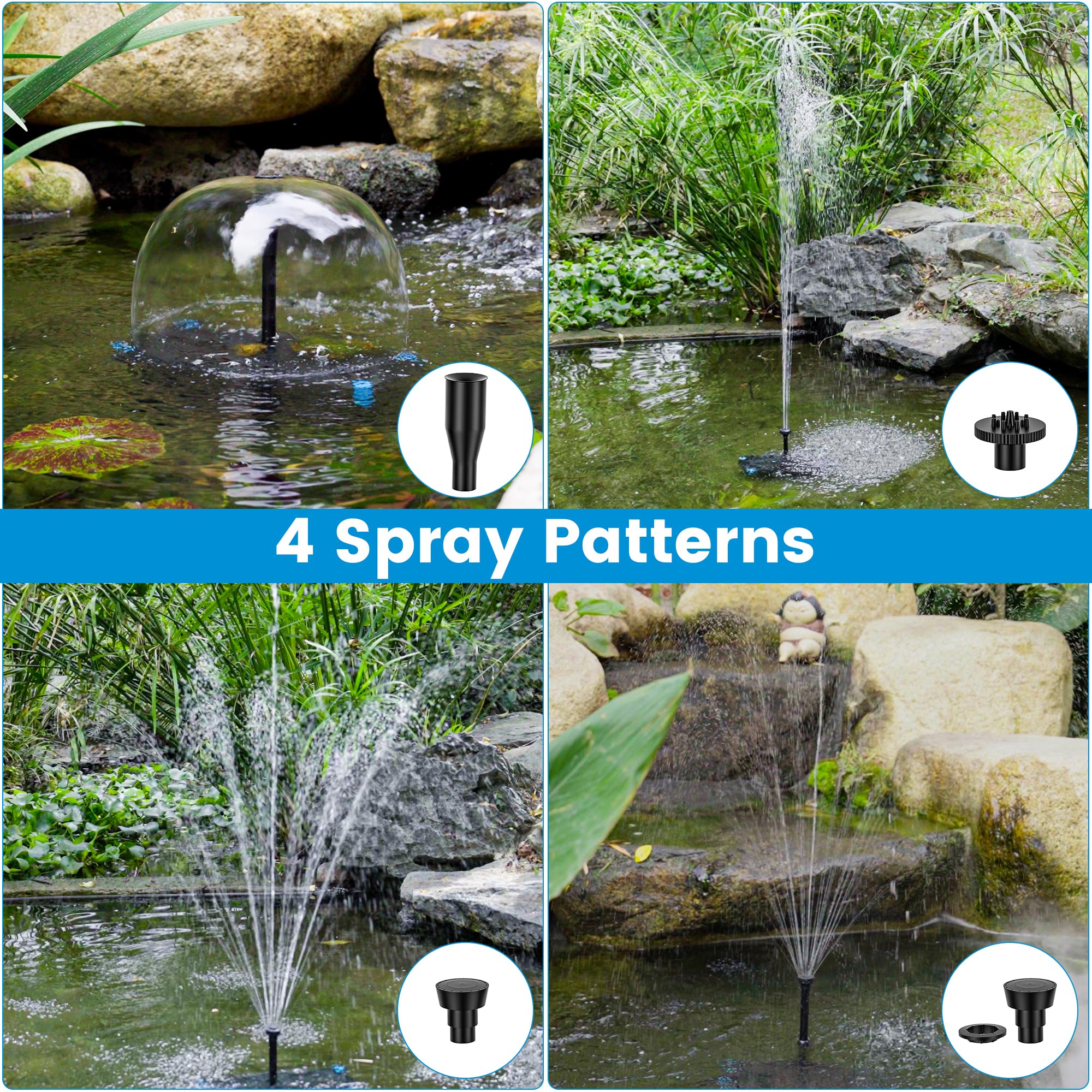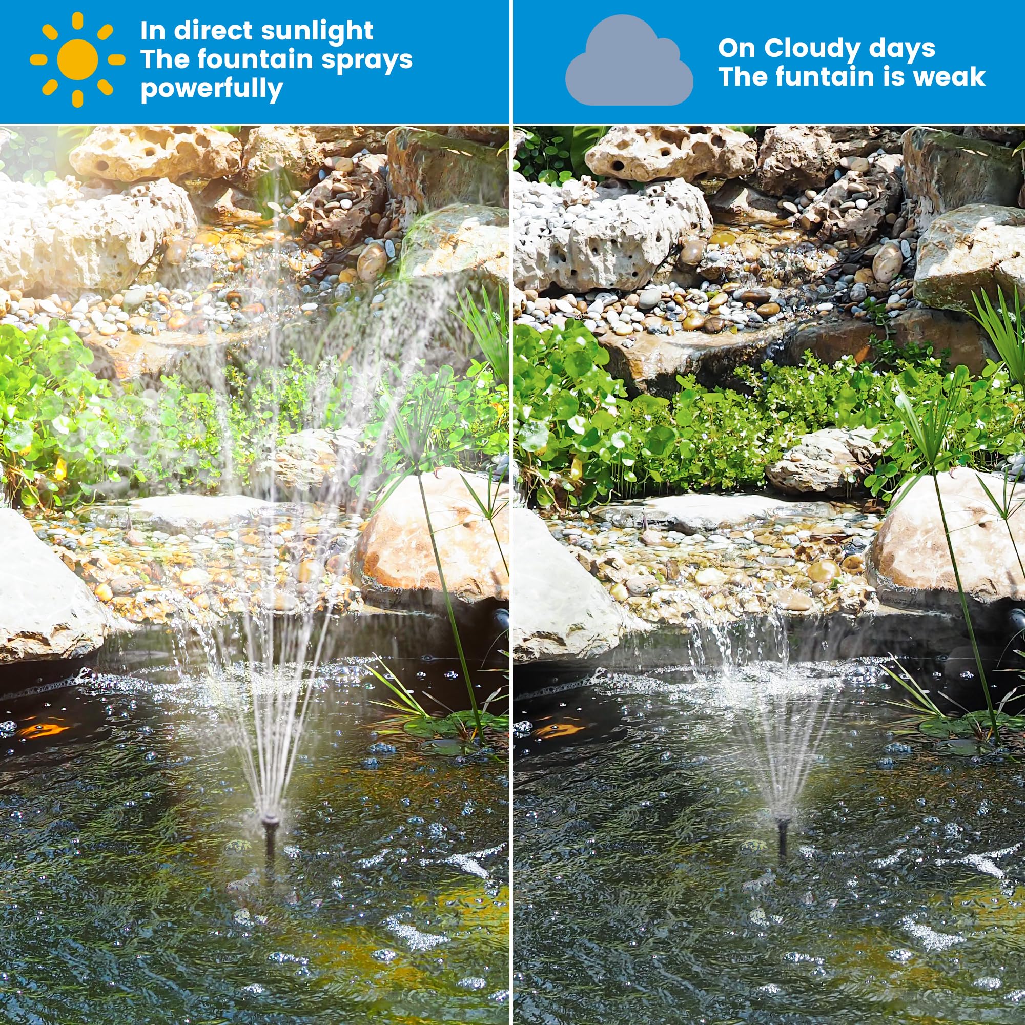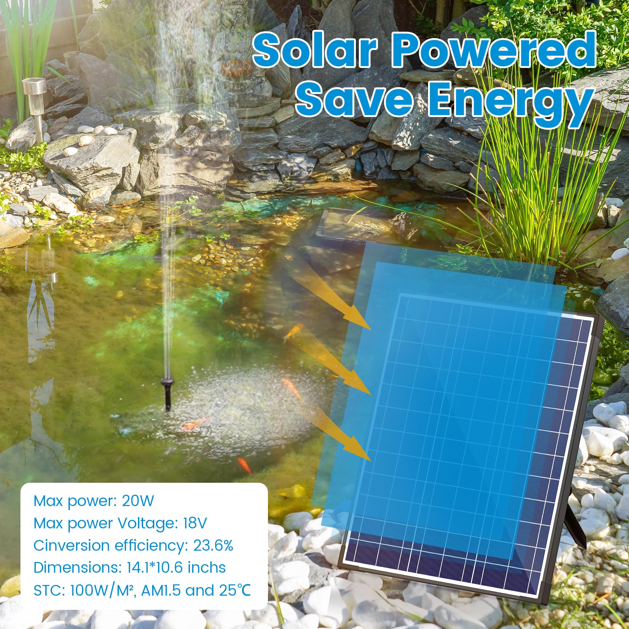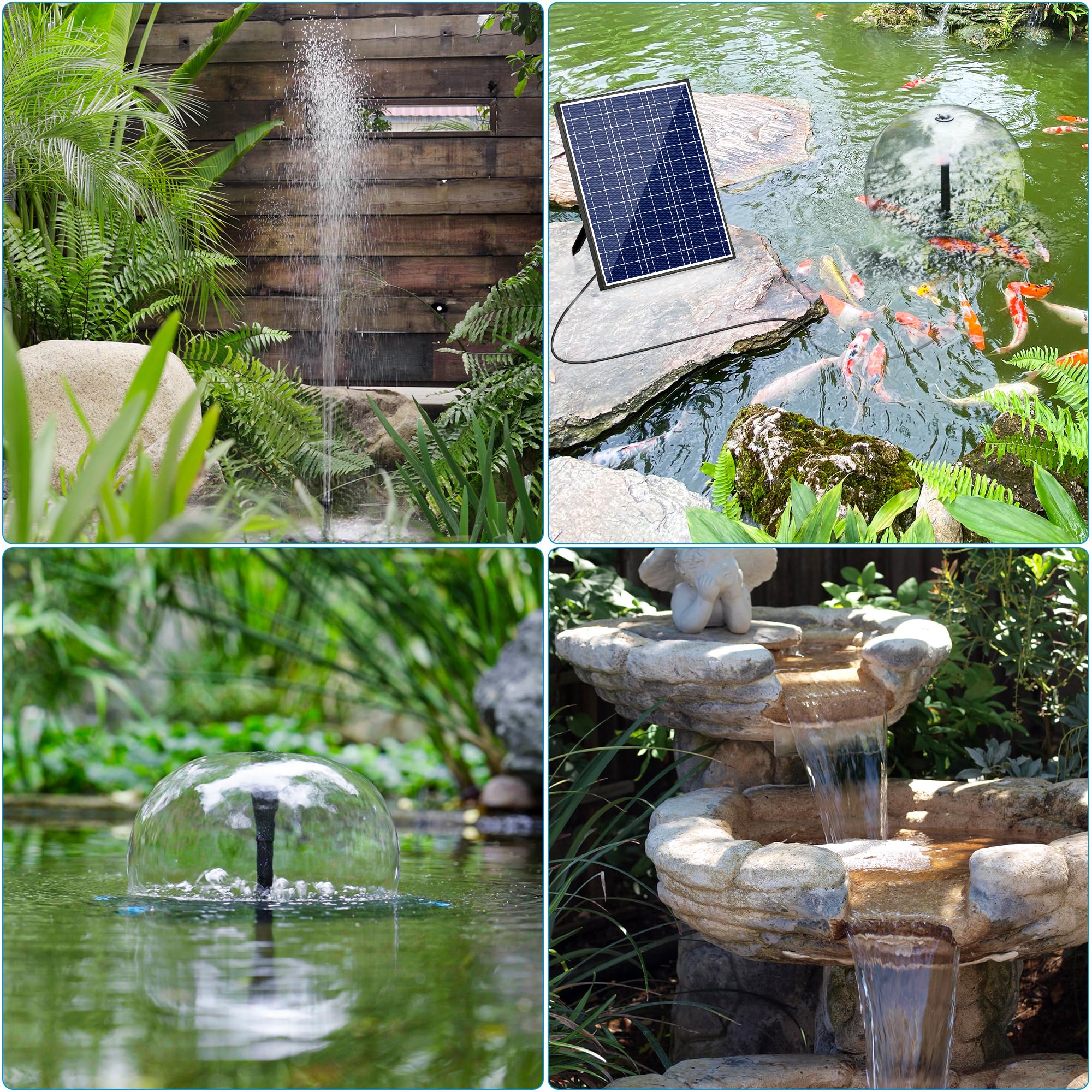 Multiple Functions: Set it up in your fish pond, and you will get a filtration and oxygenation system, as well as a beautiful pond fountain. You can also use it as a solar submersible pump with a powerful filtration system to provide clean, clear water for your water feature