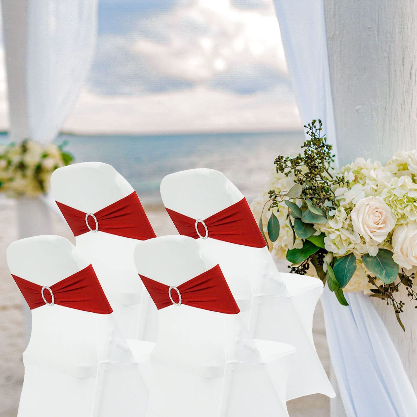 PREMIUM MATERIAL&ACCESSORIES:Comfortable and natural feel,Our spandex chair bands is made of 90% polyester and 10% spandex material, fits 13-19 inches of chair back width and highly stretchable with drill buckle dia6.5cm.Maiangel chair bows with much Fashion,simple and sophistication