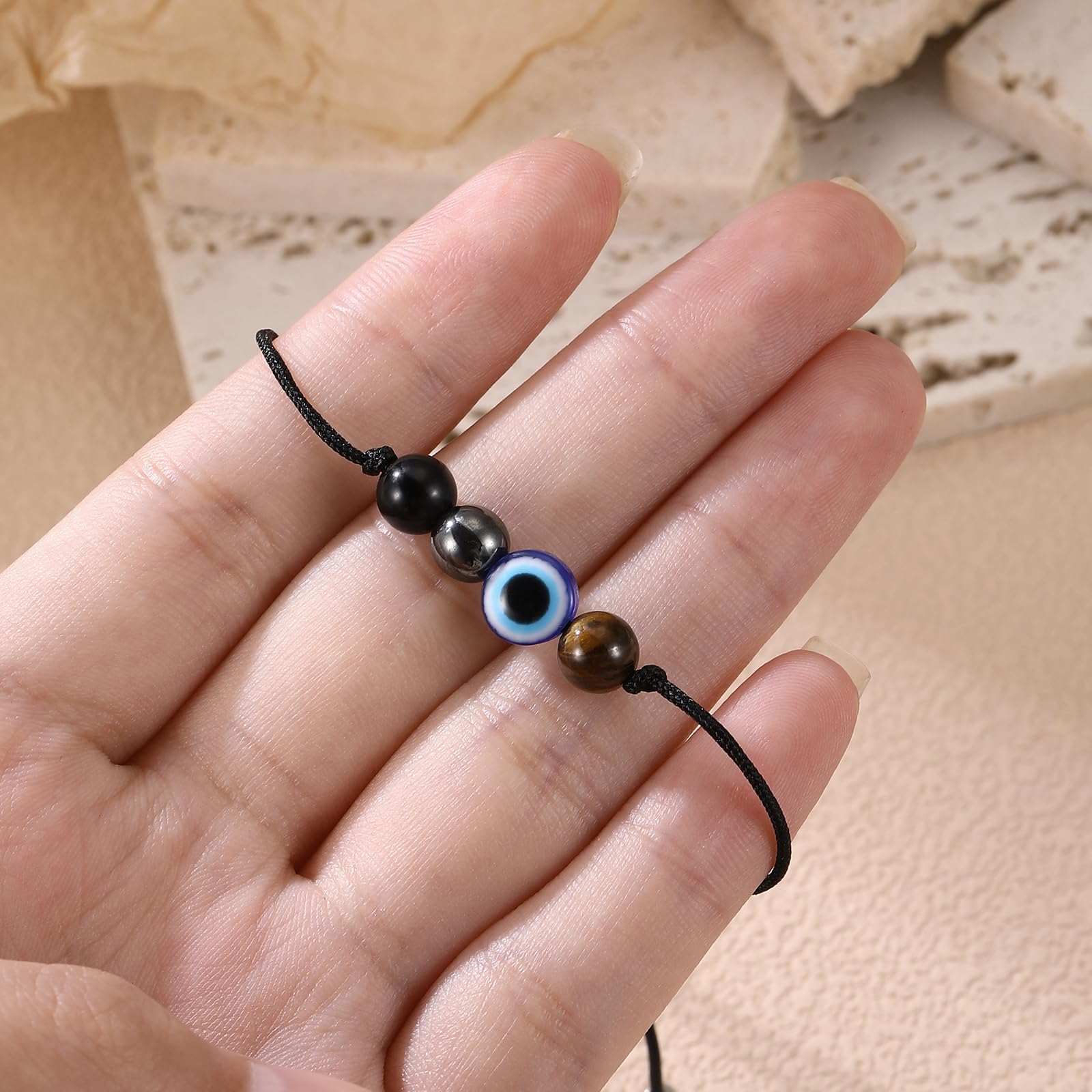 SIZE: The evil eye bracelet come with sliding knot closure with adjusting from 4"-11". Four natural healing stones are 6mm, 0.8mm nylon cord for a light comfortable wear. Expandable string bracelet is easy to open and close, suitable for most women.