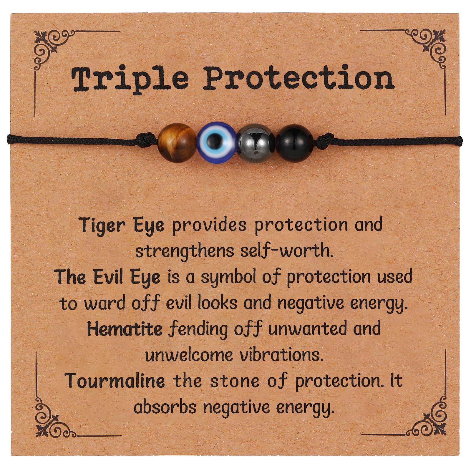 TRIPLE PROTECTION BRACELET: This triple protection bracelet contains 4 natural healing stones: The Evil Eye is a symbol of protection used to ward off evil looks and negative energy. Tiger Eye provides protection and strengthens self-worth. Hematite fending off unwanted and unwelcome vibrations. Tourmaline the stone of protection, it absorbs neqative energy.