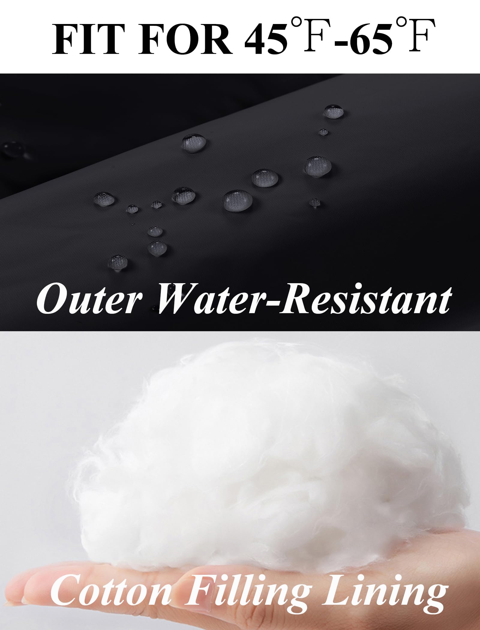 Water Resistant: Featuring a water repellent fabric, this thermal vest finish sheds light rain and snow. It is filled with 100% cotton that is more puffy and insulated. Suitable for temperatures between 45°F and 65°F