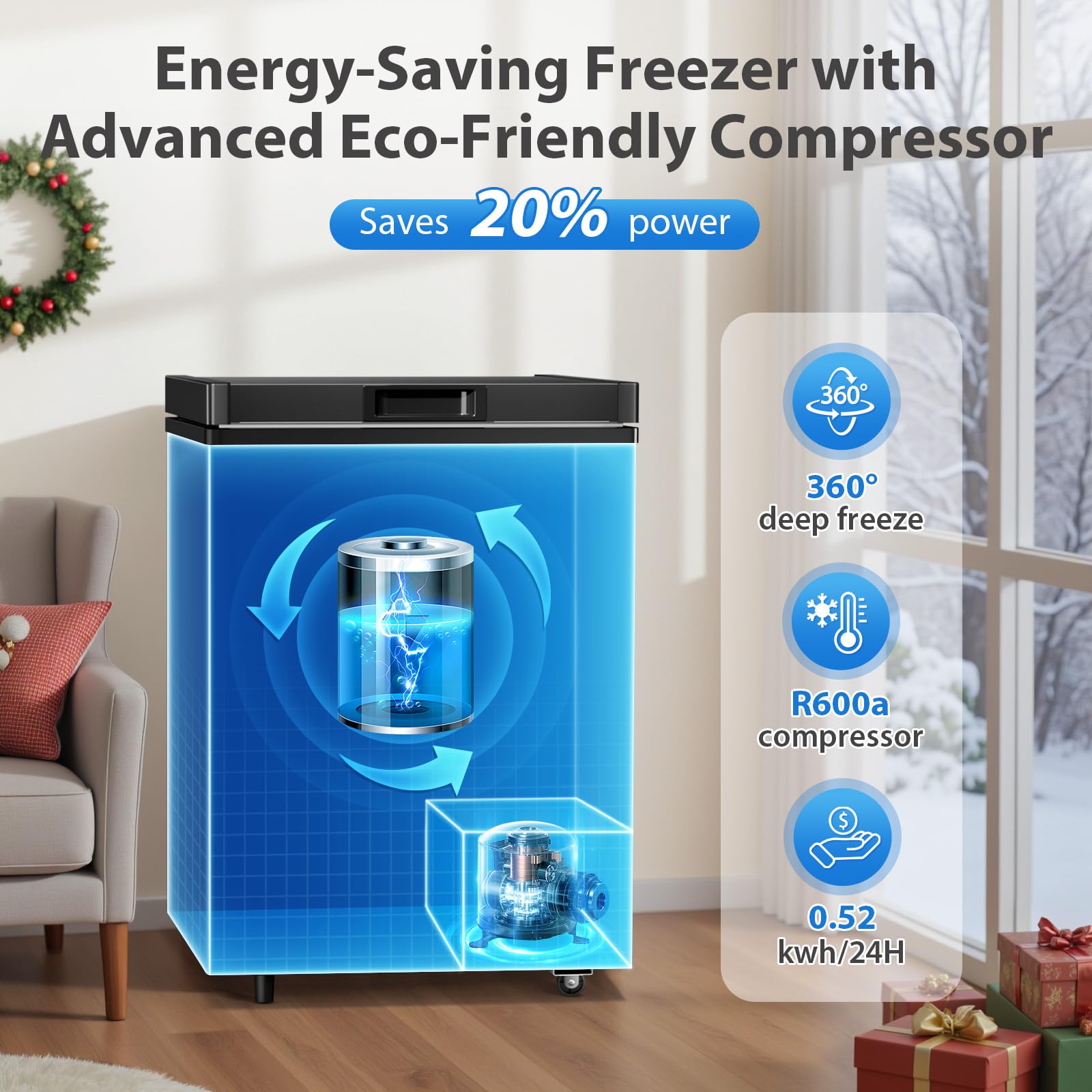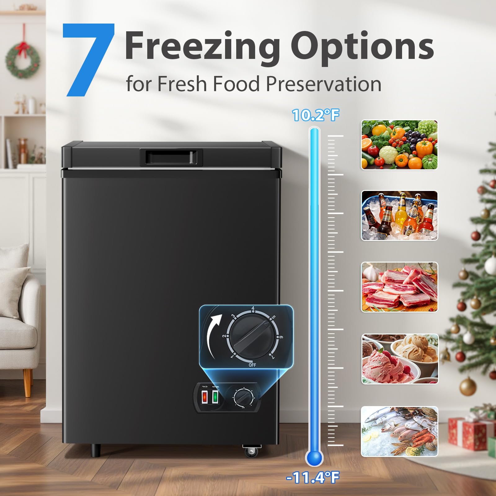 Adjustable Temperature Control: Seven adjustable temperature settings allow you to customize the freezing level from -11.4°F to 10.2°F, ensuring optimal food preservation. This small deep freezer gives you precise control over your frozen goods