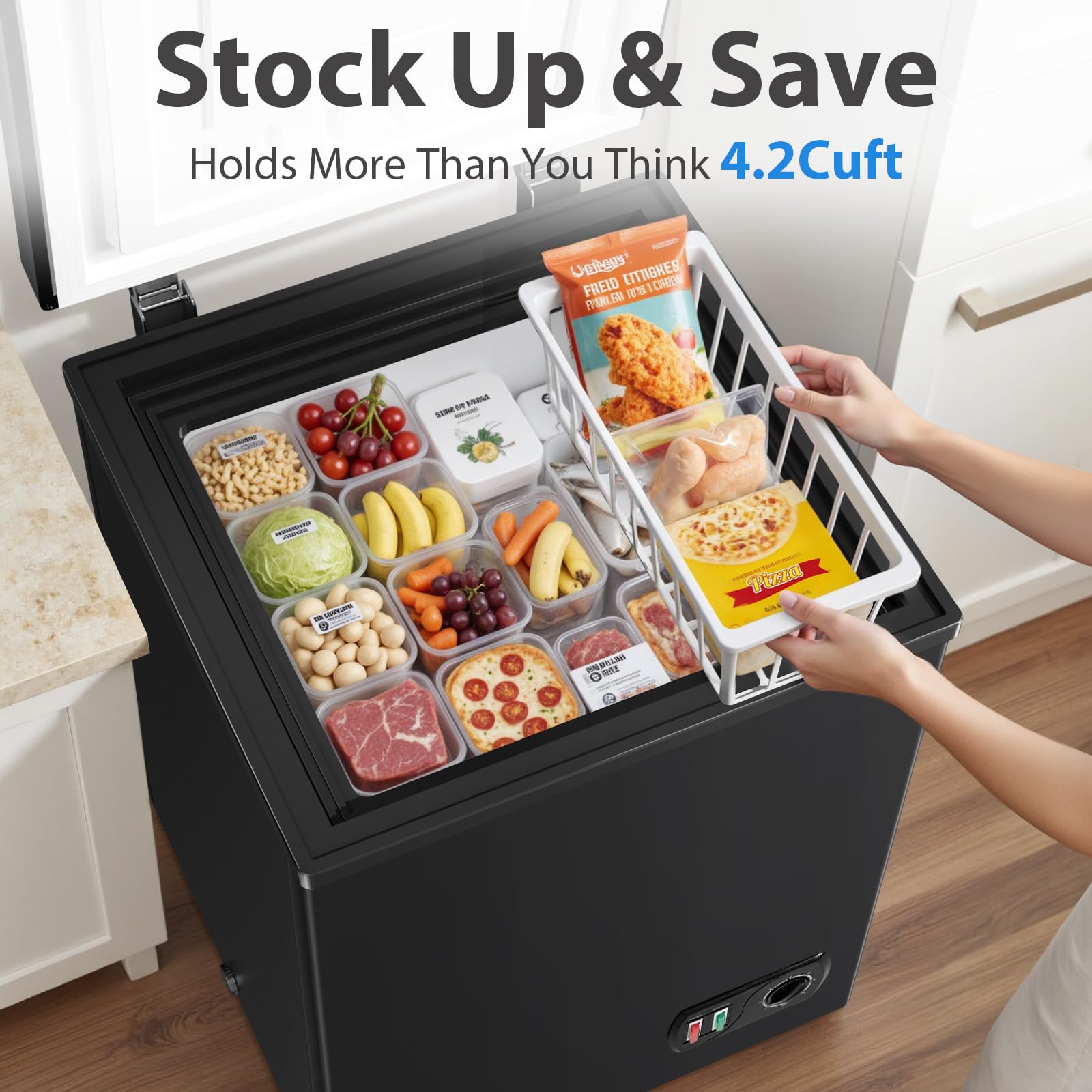 Ample Storage in a Compact Design: This 4.2 cu. ft. small chest freezer offers generous storage for frozen goods without taking up excessive space. Its compact exterior (22.83"D x 22.64"W x 32.28"H) makes it ideal for apartments, small kitchens, offices, or garages. Perfect for singles, couples, and small families