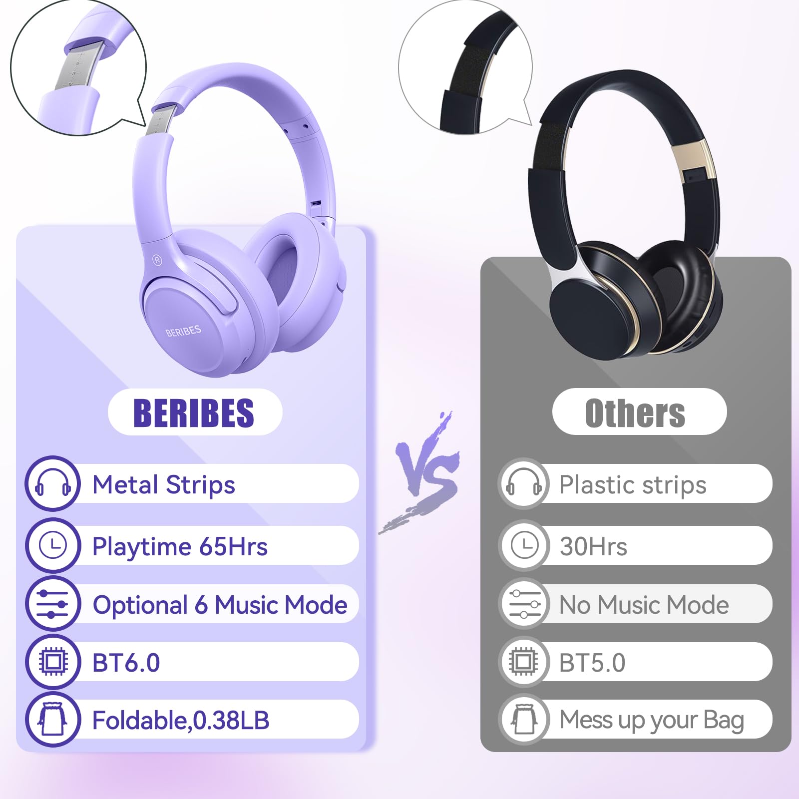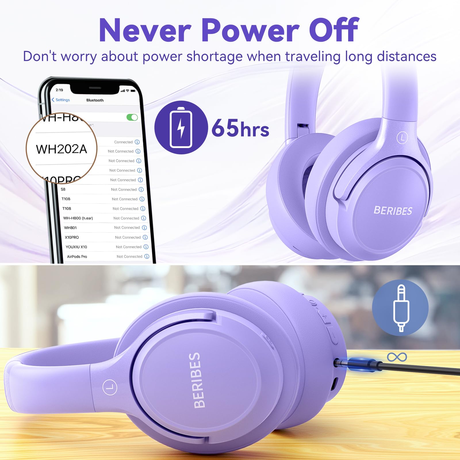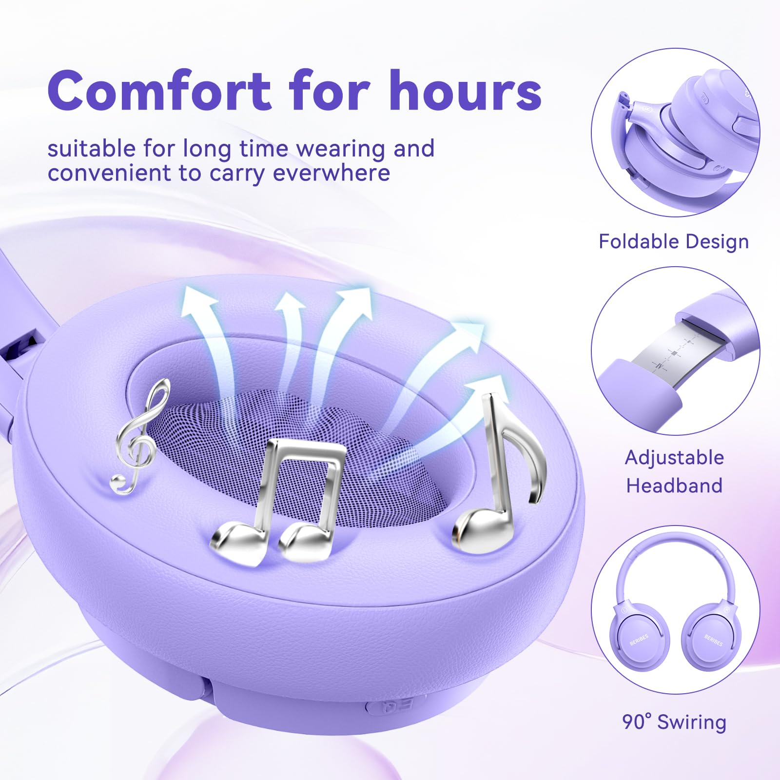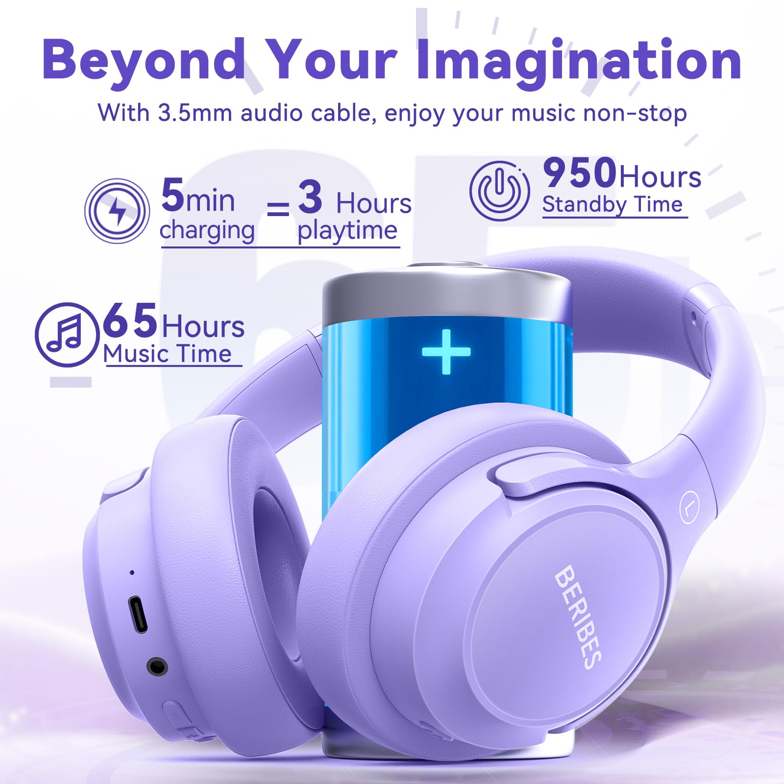 65 Hours Playtime: Low power consumption technology applied, BERIBES bluetooth headphones with built-in 500mAh battery can continually play more than 65 hours, standby more than 950 hours after one fully charge. By included 3.5mm audio cable, the wireless headphones over ear can be easily switched to wired mode when powers off. No power shortage problem anymore.