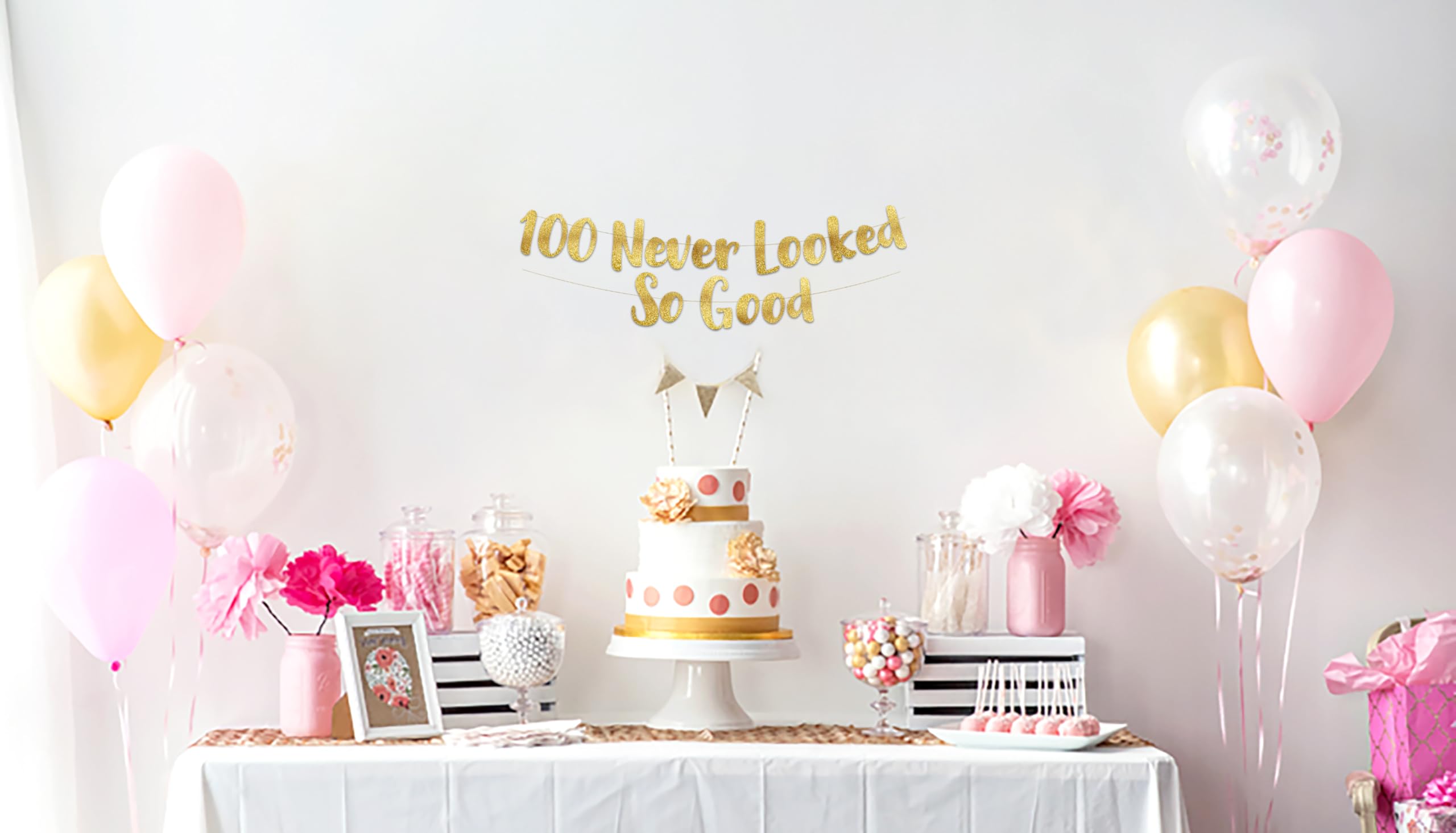 Congrats on 100 years of excellence! This gold glitter banner is the perfect decoration to add a touch of classy decor and welcome your guests to the occasion.