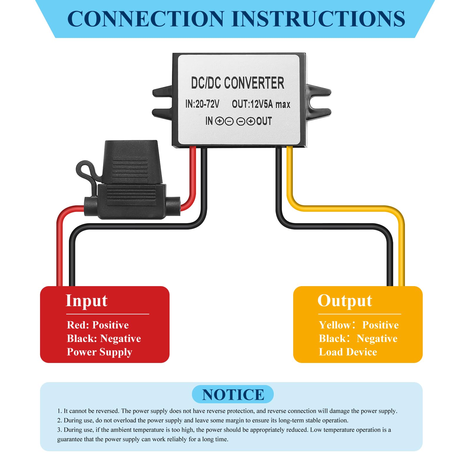 Product Information Input range: 20V to 72V Transfer efficiency: 90% Output voltage: 12V Output: 5A MAX Maximum output: 60W MAX Working temperature: -20 to 65° Storage temperature: -40 to 85° Working humidity: 10% to 90% RH Waterproof classification: IP67 Short circuit protection: YES Overtemperature protection: YES Overcurrent protection: YES Anti connection protection: YES Heat dissipation method: Natural heat dissipation Attention 1.The products are stored in a dry and cool place with a temperature between 40℃ and 80℃, avoiding contact with corrosive substances and staying away from flames and heat sources 2.Do not use the device near a heat source, such as a fire or heater 3.Do not connect the input line to 220V electricity 4.Do not put the product in a fire or heat it 5.Do not short the positive or negative poles of the product with wires or other metal objects 6.It is forbidden for non-professional personnel to disassemble and repair the product by themselves