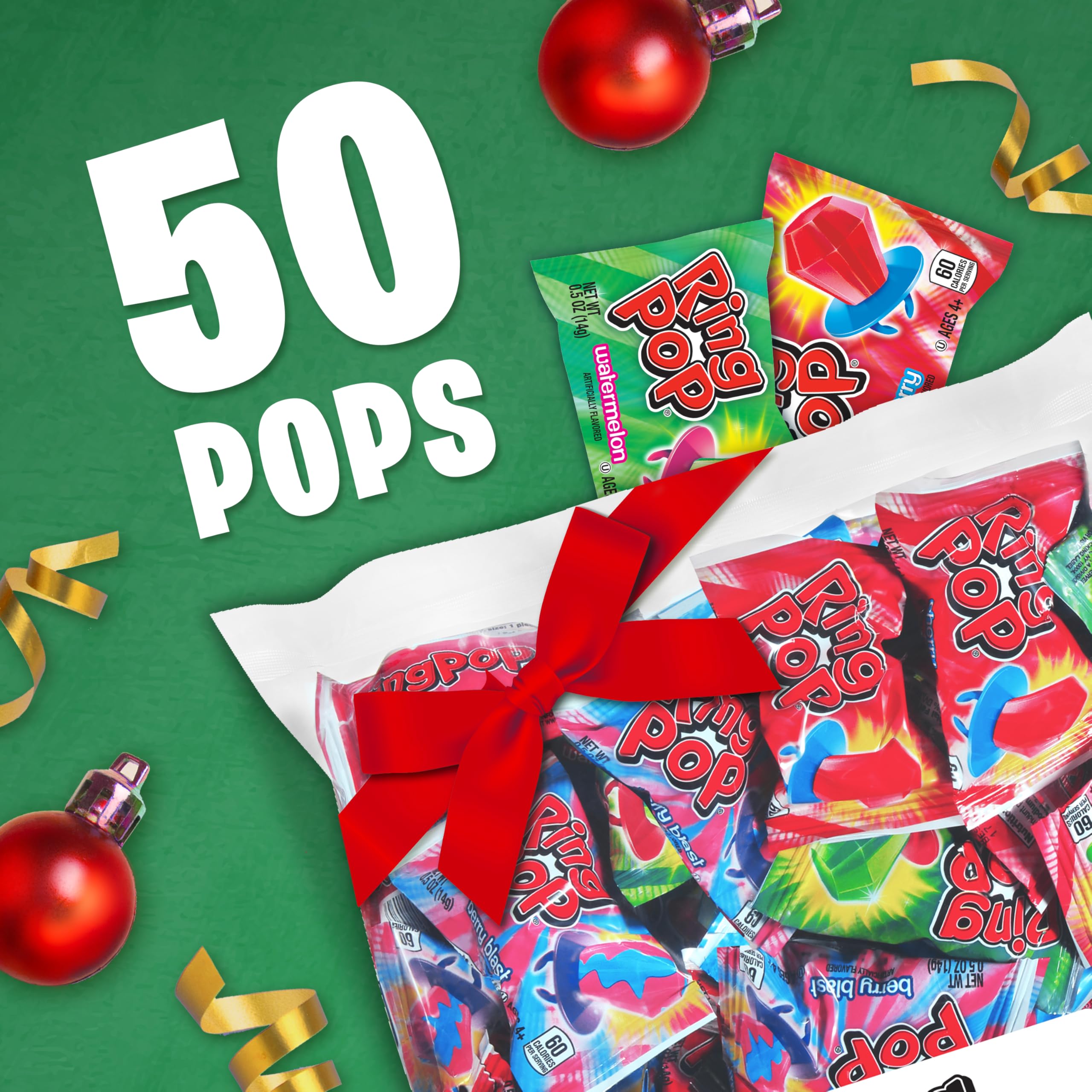 BULK LOLLIPOP BAG: 50 individually-wrapped shelf-stable Ring Pop lollipops per bag. The variety pack means there are different tasty flavors for everyone to enjoy, but enough to go around and share the fun together!