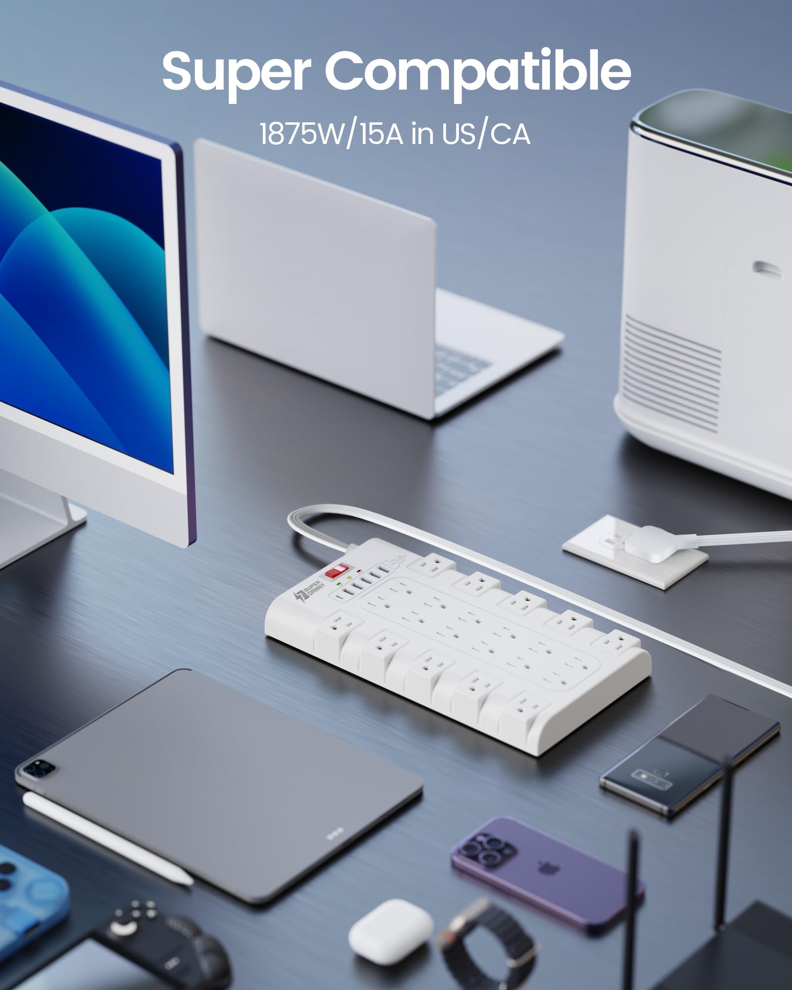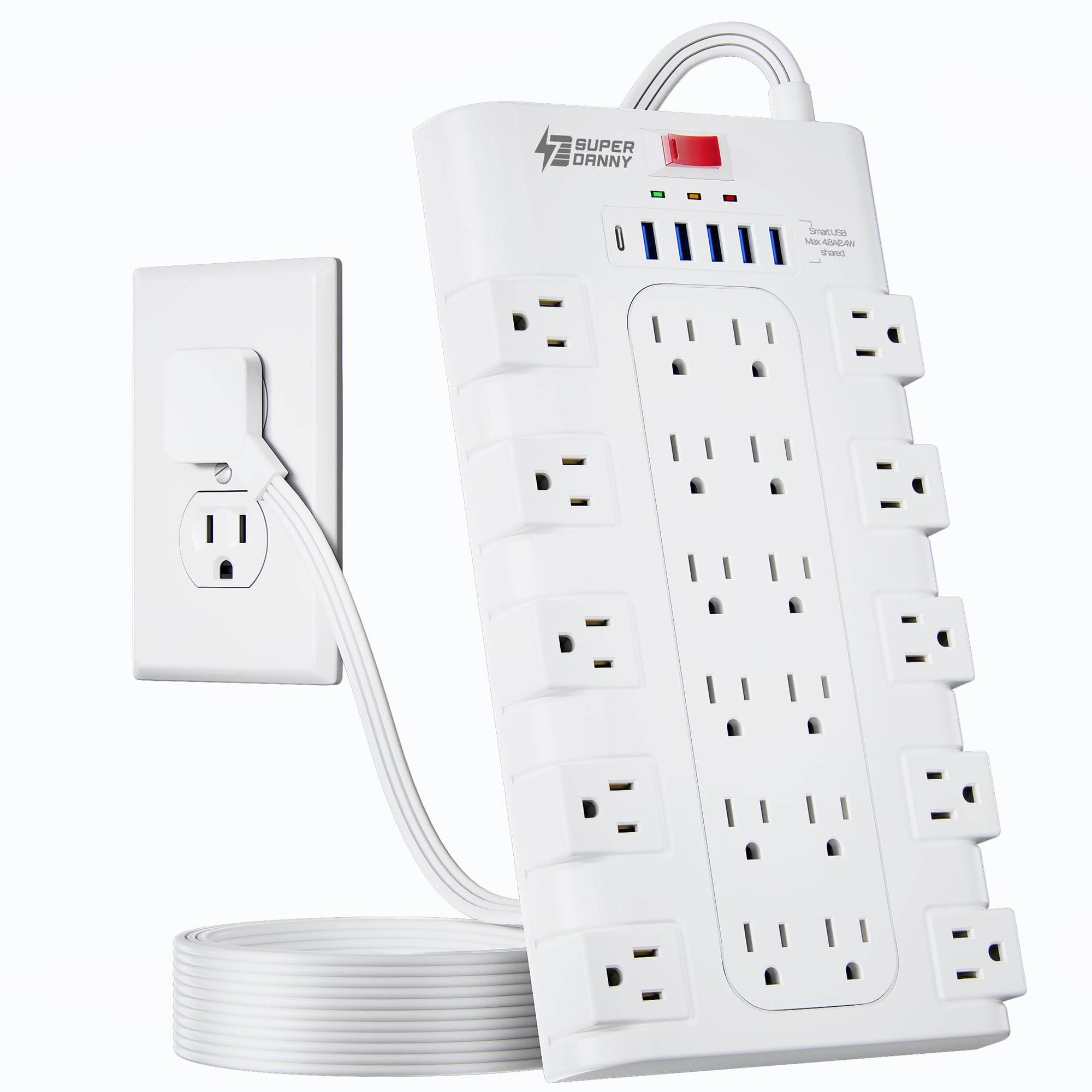 【28-in-1 Versatile Power Strip】 FCC, RoHS safety certified, with the extension cord and flat plug certified by UL. Superdanny power strip surge protector has 22 grounded 3-prong outlets and 6 USB ports, providing power for all devices that you need to plug in at one location. Perfect for gaming or media set up, surround sound system, TV, phone, tablet, PC, laptop, gaming computers, lamps, and other devices simultaneously.