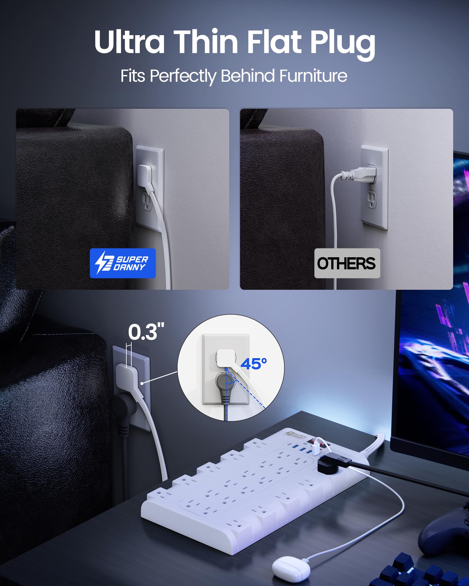 【Multi Safety Protection】The SUPERDANNY power strip surge protector is designed with multiple built-in safety features to help protect your devices during daily use. It features an 8-fold safety protection system, including a fire-retardant housing, 2100J surge protection, overload protection, grounding protection, short-circuit protection, over-current protection, over-voltage protection, and over-temperature protection. These protections work together to enhance electrical safety for home, office, or gaming setups. Designed with quality and reliability in mind for everyday power needs.