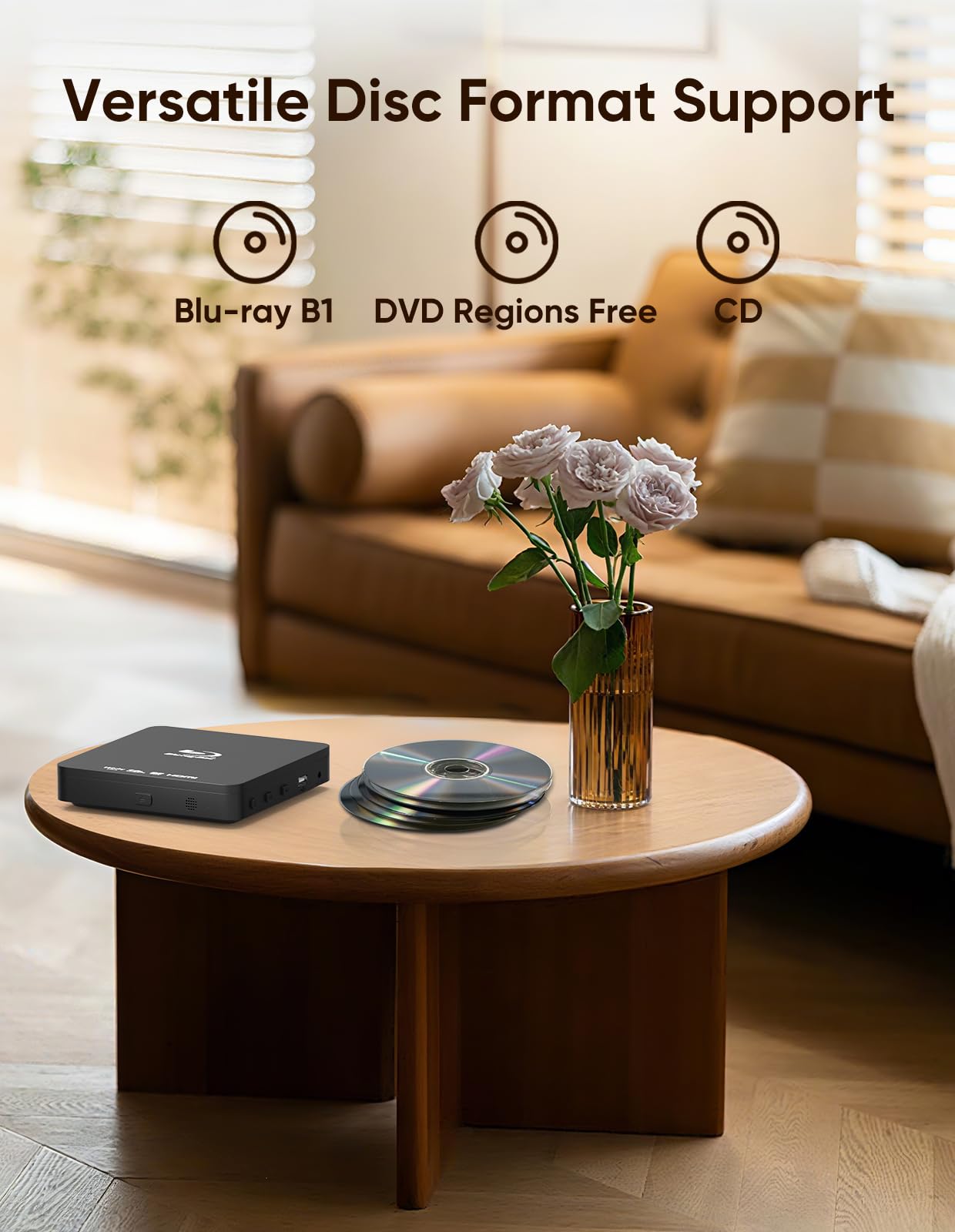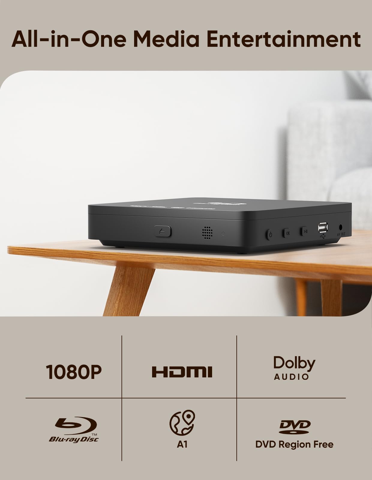 【Space-saving design】 The slim Blu-ray player fits perfectly into tight spaces and narrow shelves thanks to its compact design.