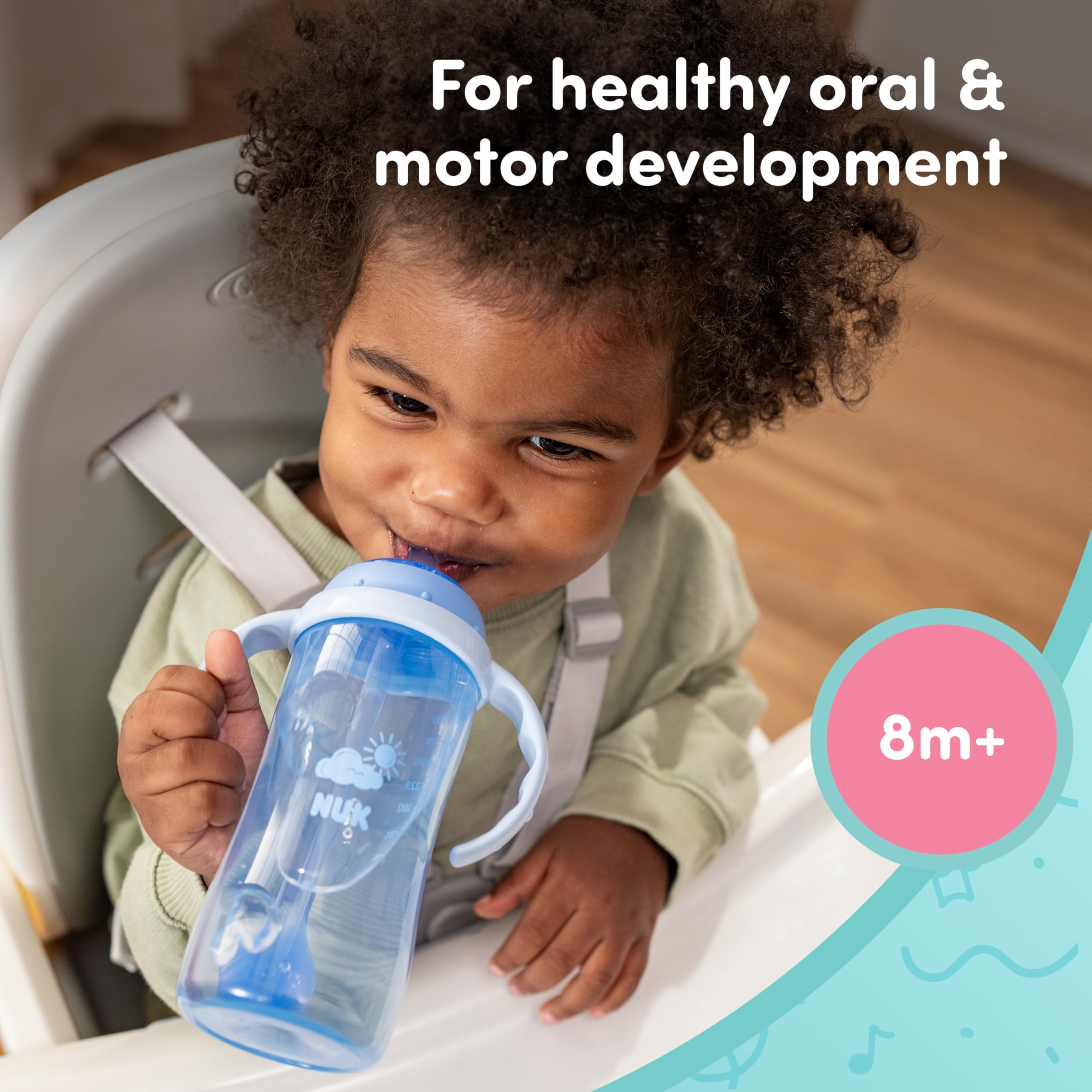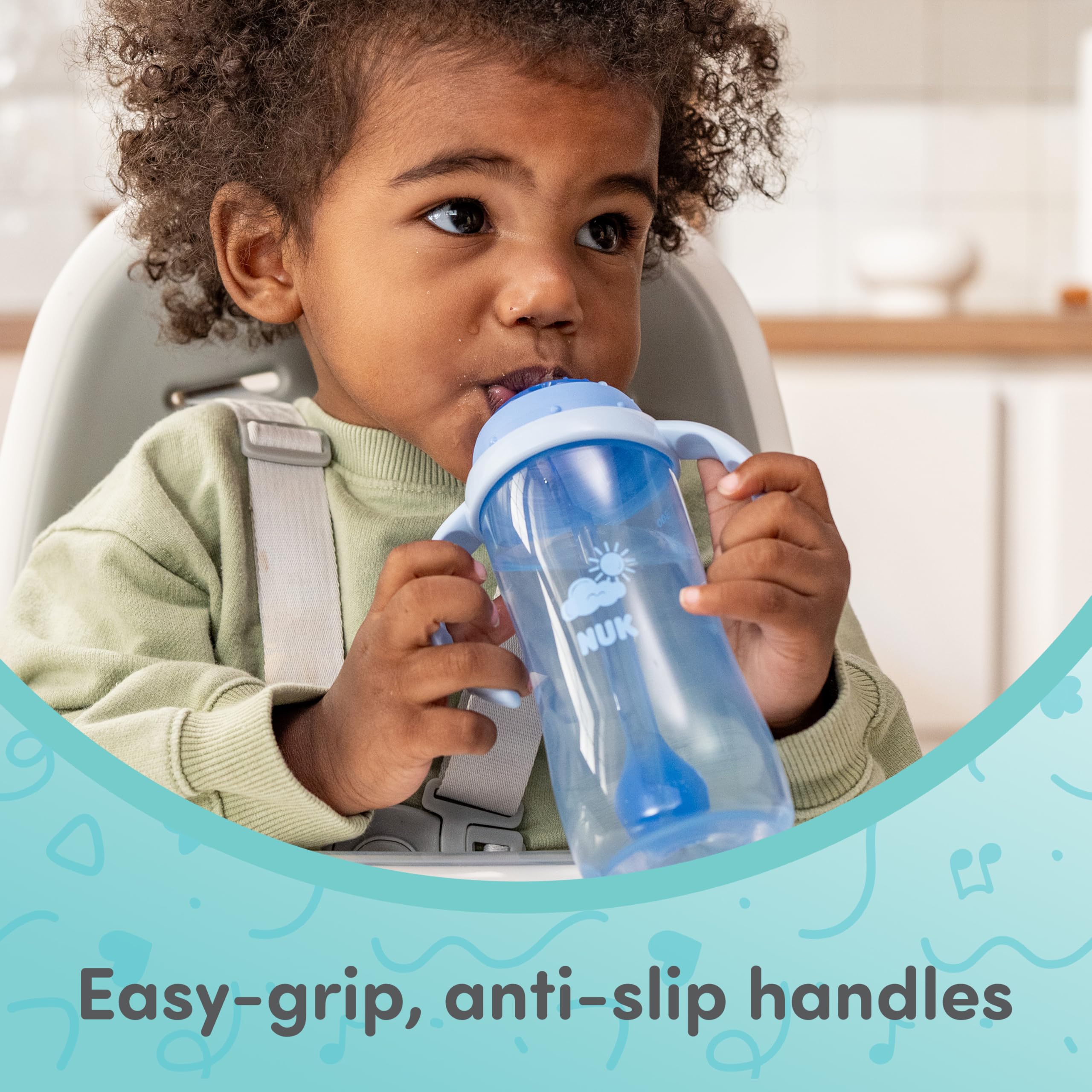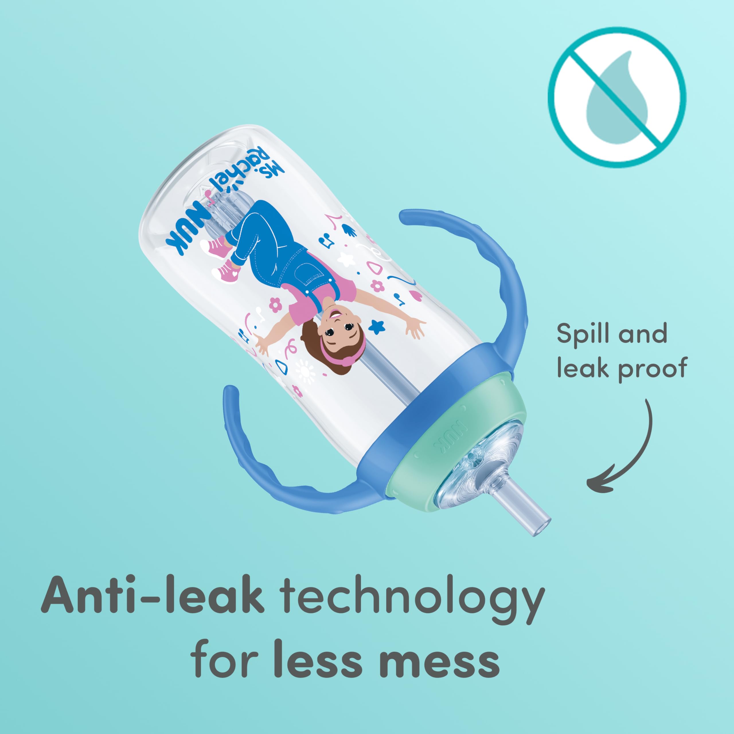 The NUK First Choice Ms. Rachel Learner Straw Cup is designed for healthy oral and motor development. This Learner Cup features a 100% soft silicone straw that is gentle on gums with easy-grip, anti-slip handles that are removable as your little one grows. Plus, it's designed to be spill and leak proof for fewer messes. The weighted, flexible straw goes where the liquid goes so your little one can drink from any angle. NUK Learner Straw Cups are BPA-free and dishwasher-safe. Our 10 oz Learner Straw Cups are recommended for babies and toddlers 8 months and older.
