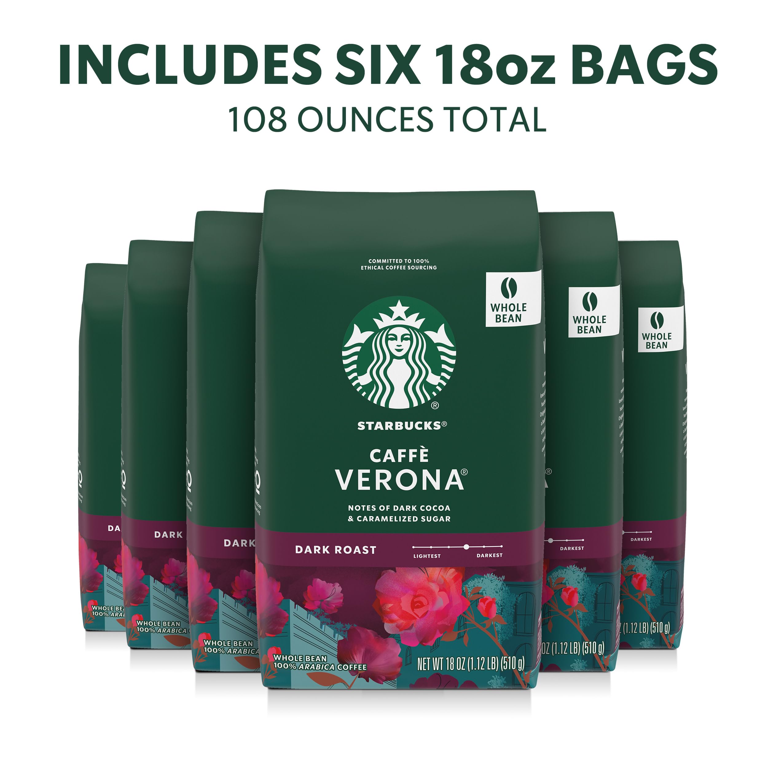 PREMIUM WHOLE BEAN COFFEE: Enjoy the Starbucks coffee you love at home with six 18-ounce bags of Starbucks Caffè Verona dark roast whole bean coffee