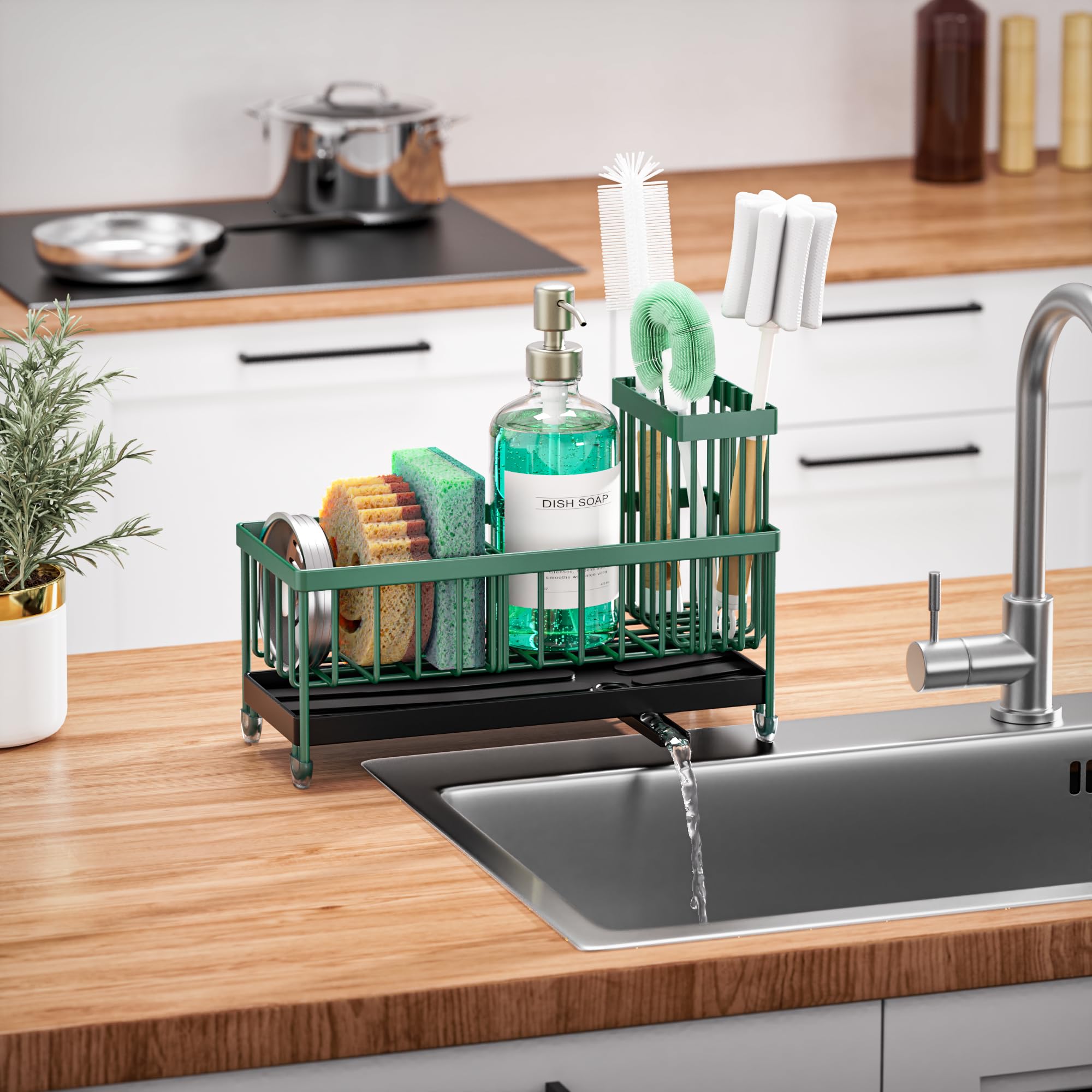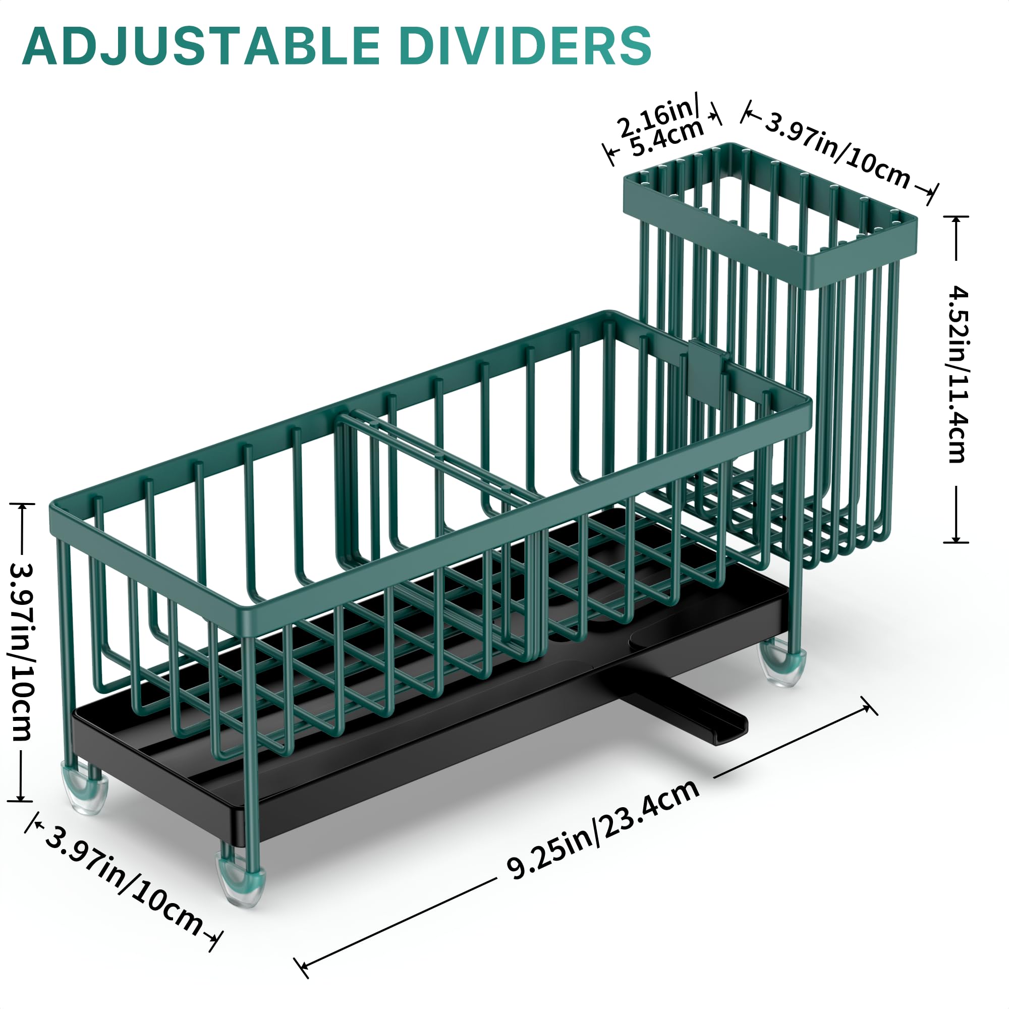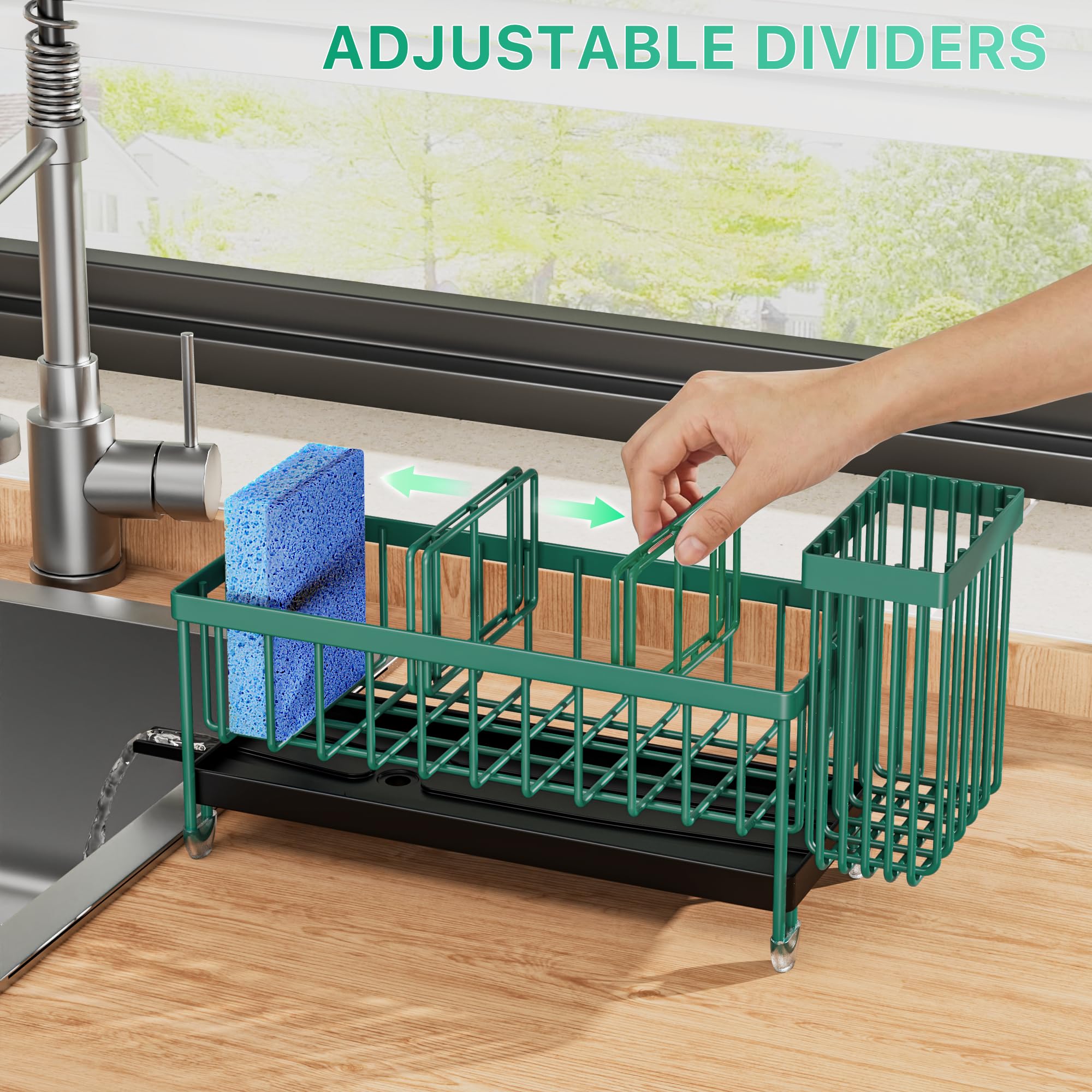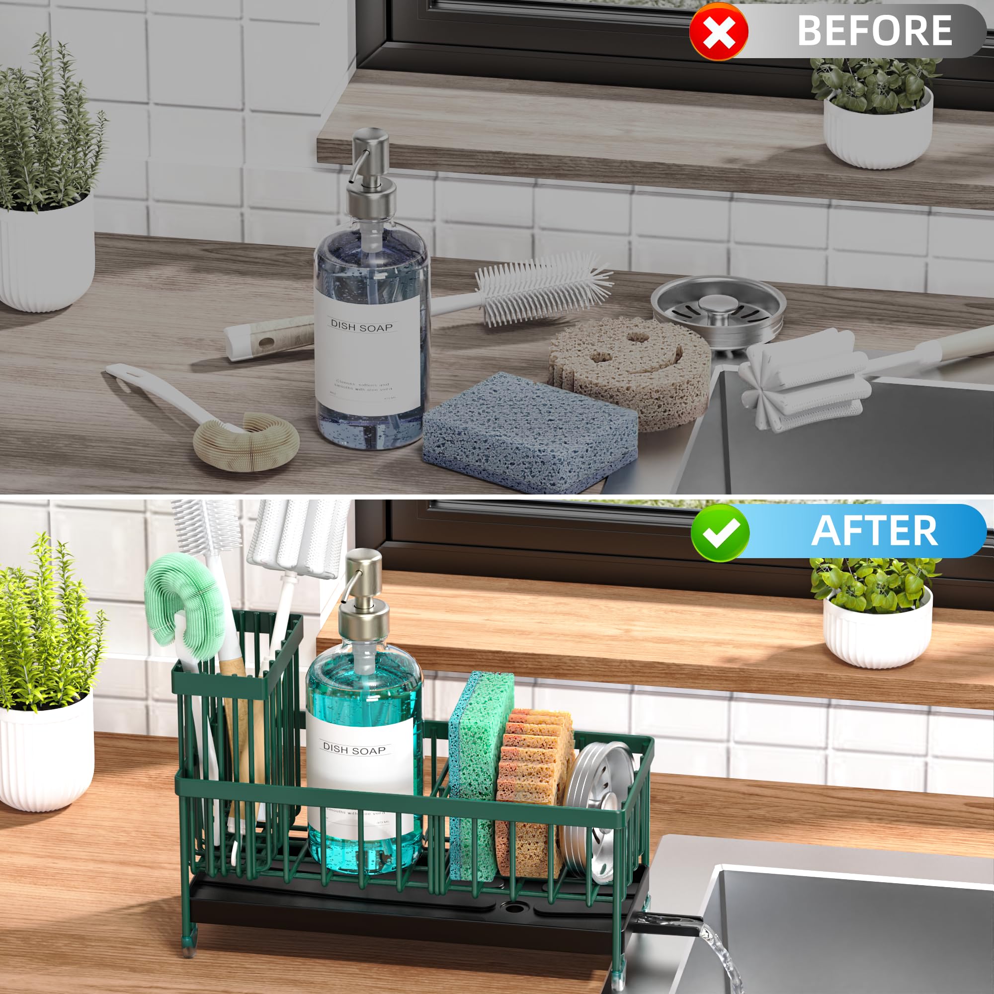 【REASONABLE DIVIDER DESIGN】 The sponge holder for kitchen sink ergonomic divider design allows it to have 3 separate storage spaces, Different items are placed in different areas. Make the most of every inch of space and make your kitchen look cleaner.