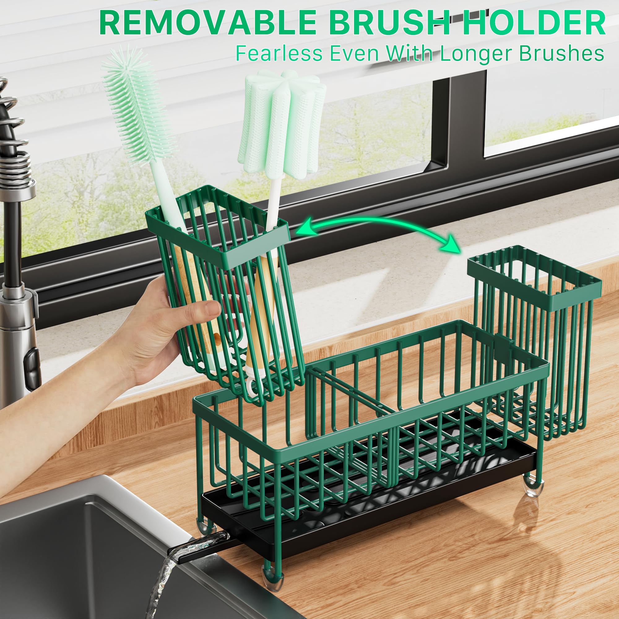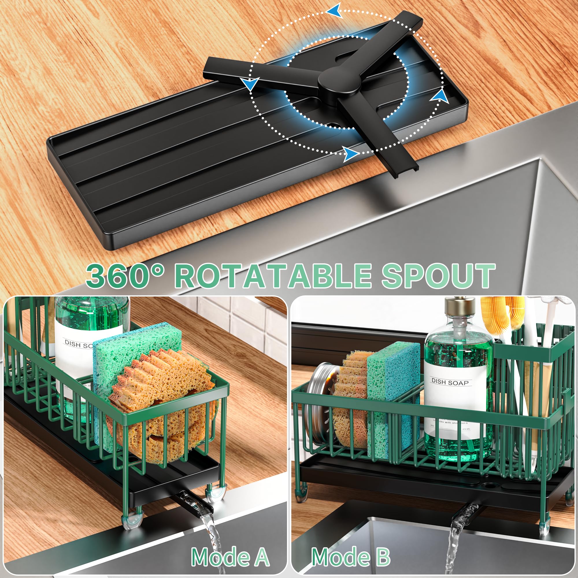 【ROTATABLE SPOUT】This kitchen sink caddy comes with a rotatable spout that swivels in three directions so that the water in the sponge can be directed to the sink. There won't be any water left on the countertop, you don't need to pull out the drip tray to clean it often, saving your cleaning time.